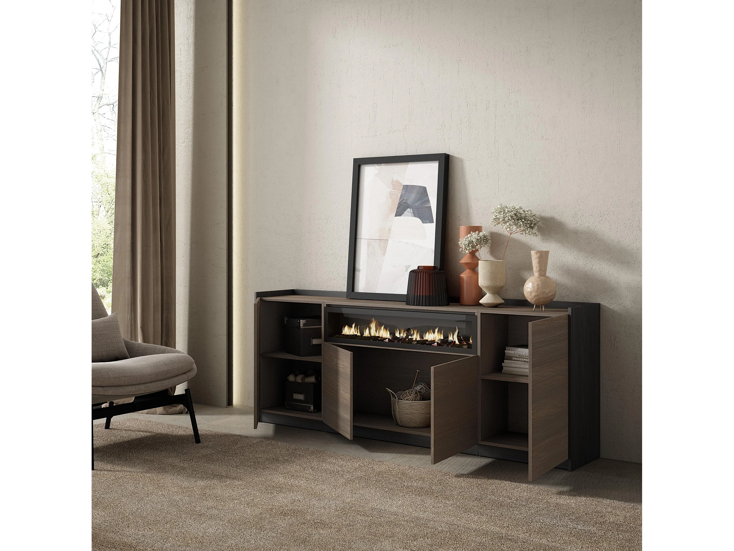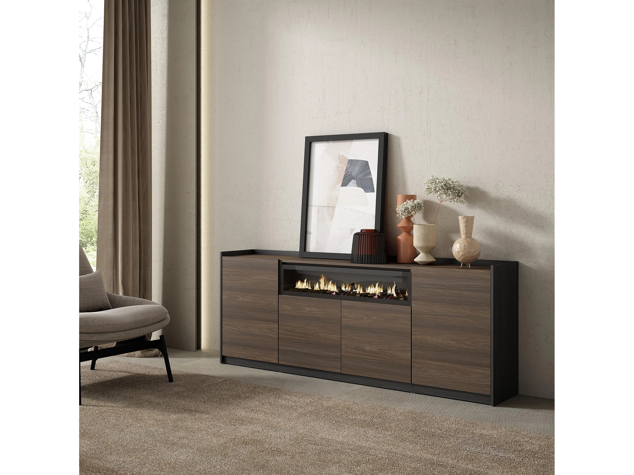 Buffet salon et cuisine, 207x80x37 cm, 4 Portes, Cheminée électrique, Chêne foncé et Noir