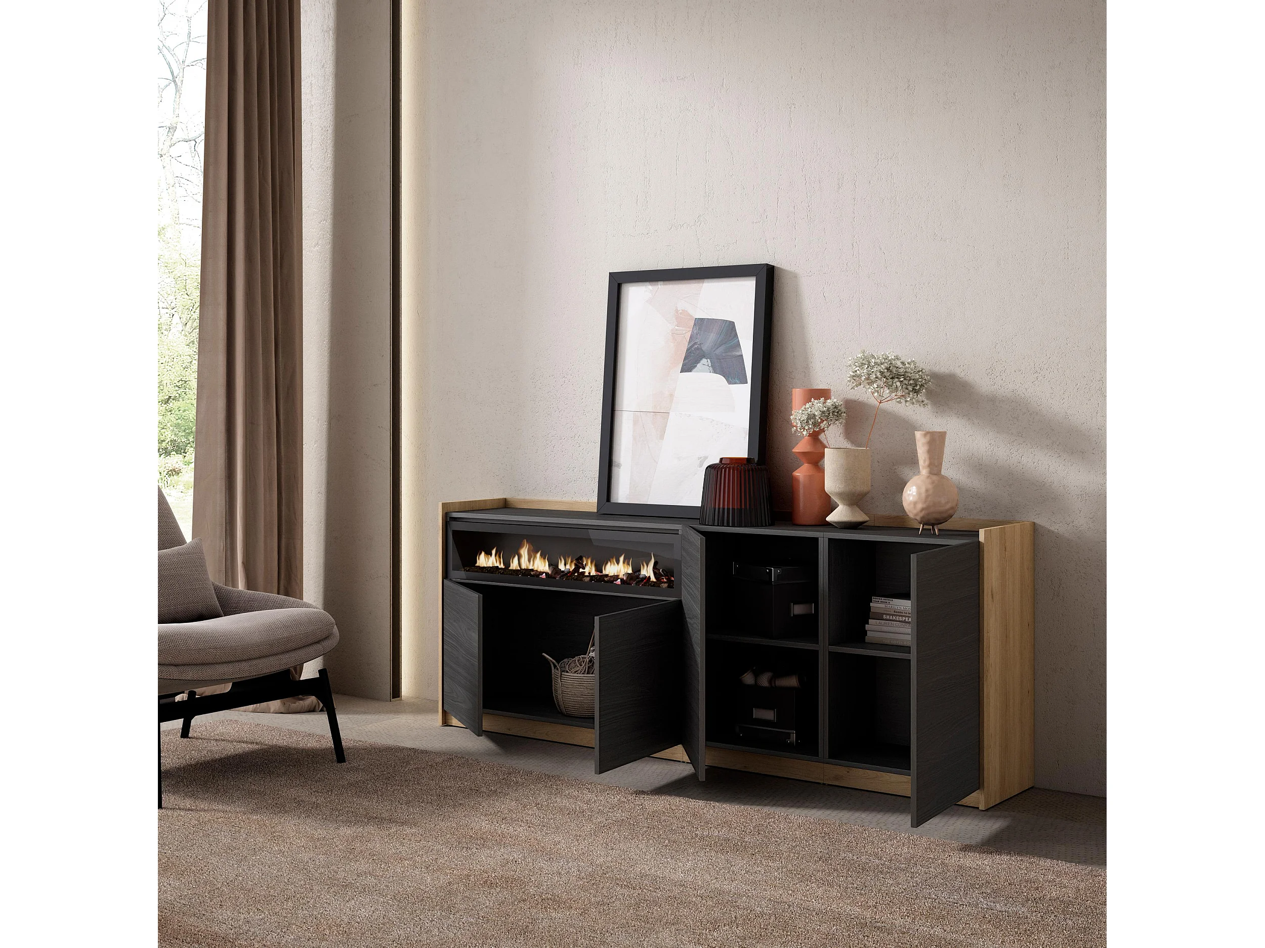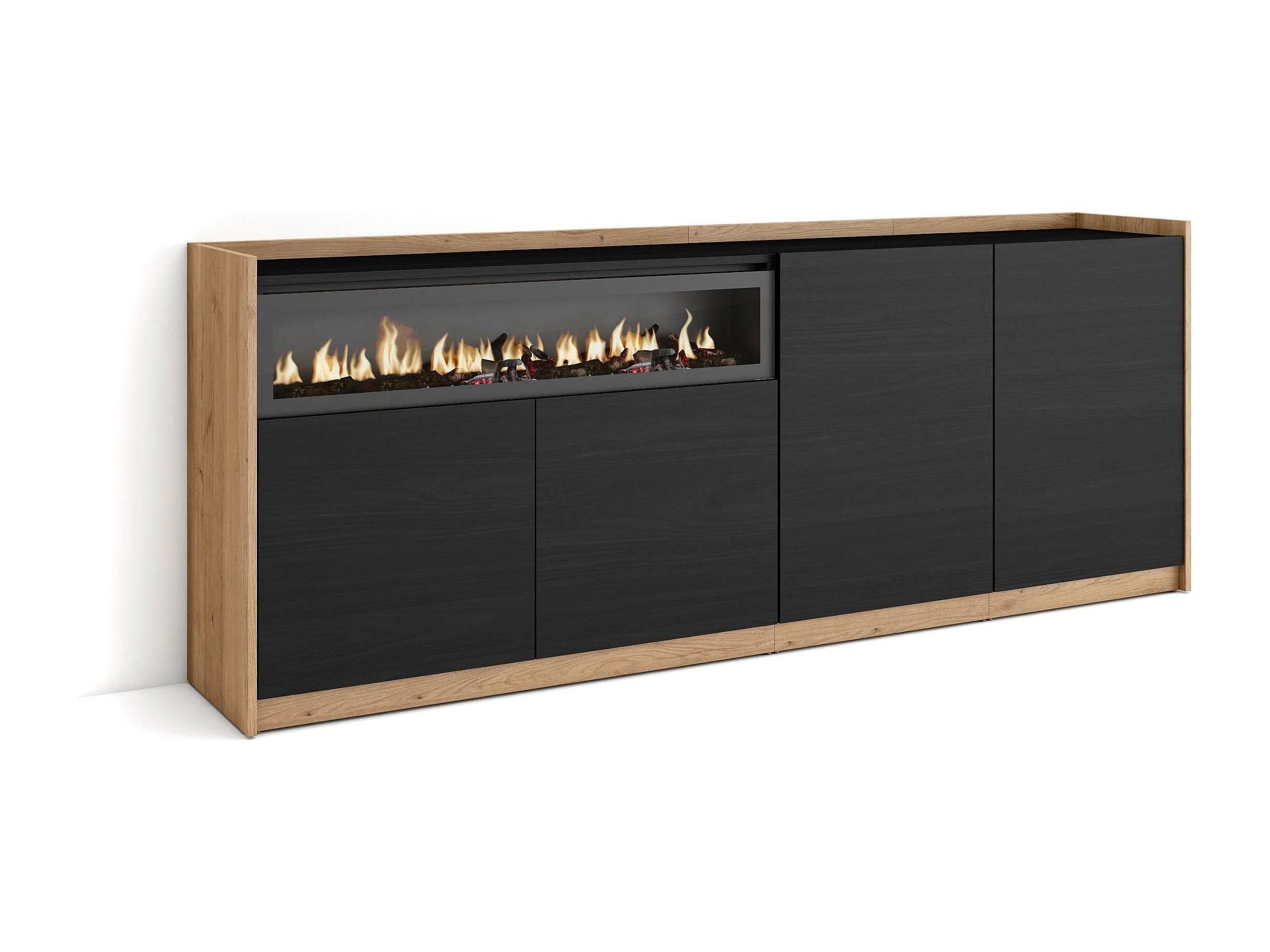 Buffet salon et cuisine, 207x80x37 cm, 4 Portes, Cheminée électrique, Noir et chêne