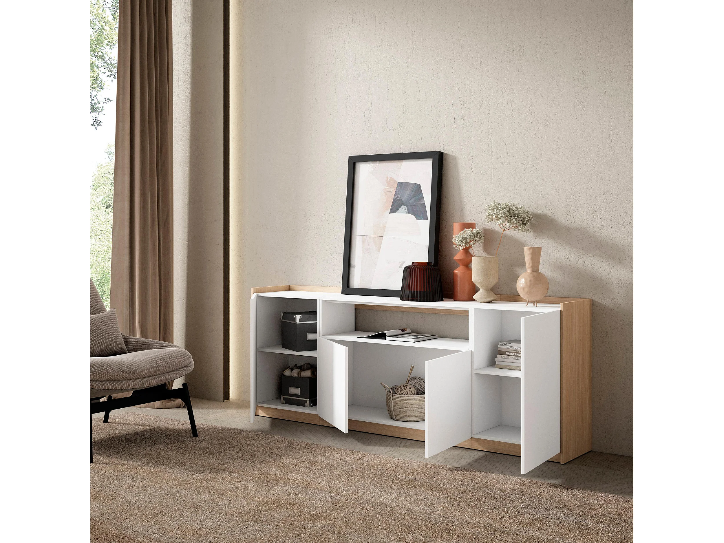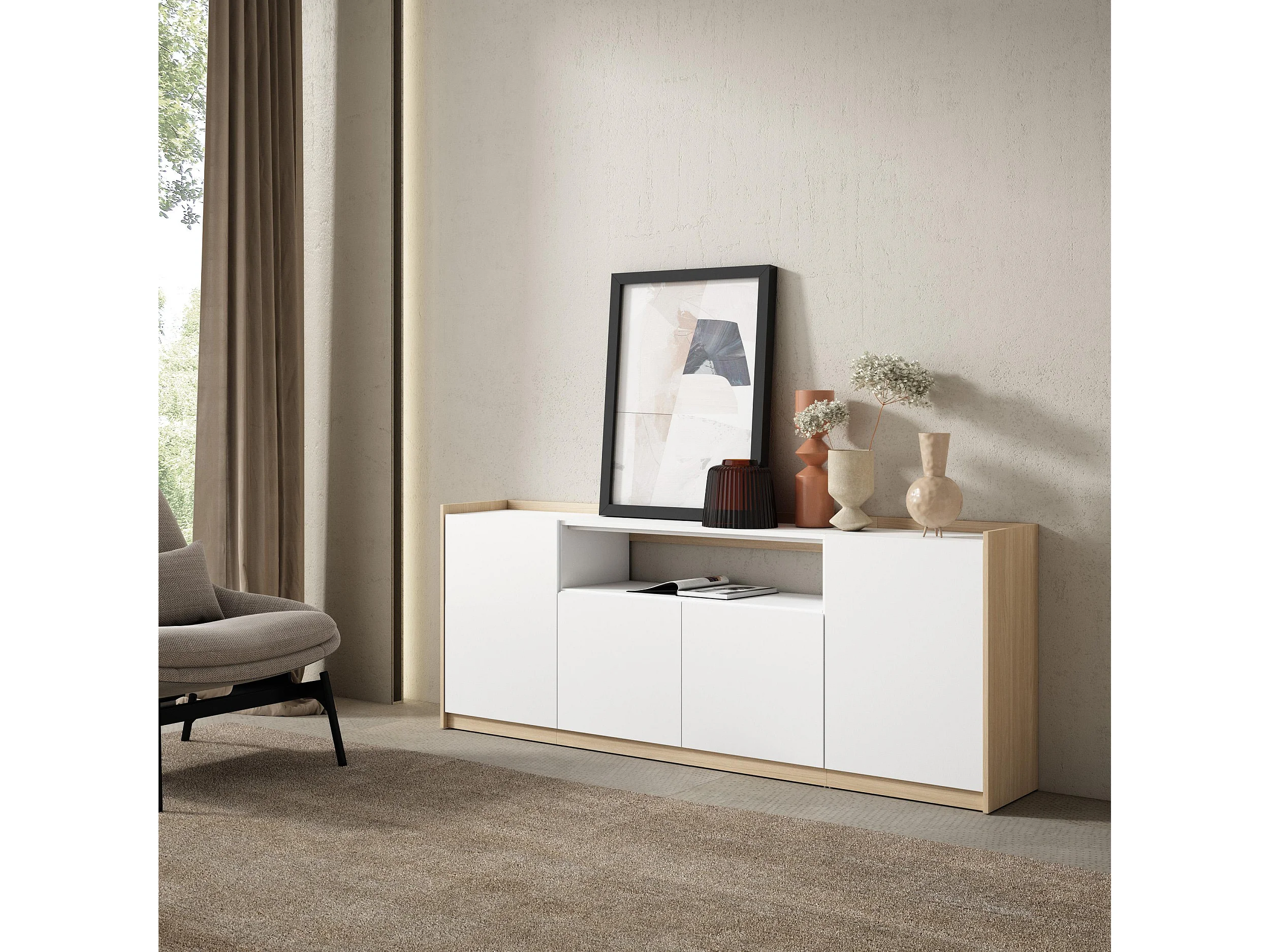 Buffet salon et cuisine, 207x80x37 cm, 4 Portes, Meuble chaussure, Blanc et Chêne Soft