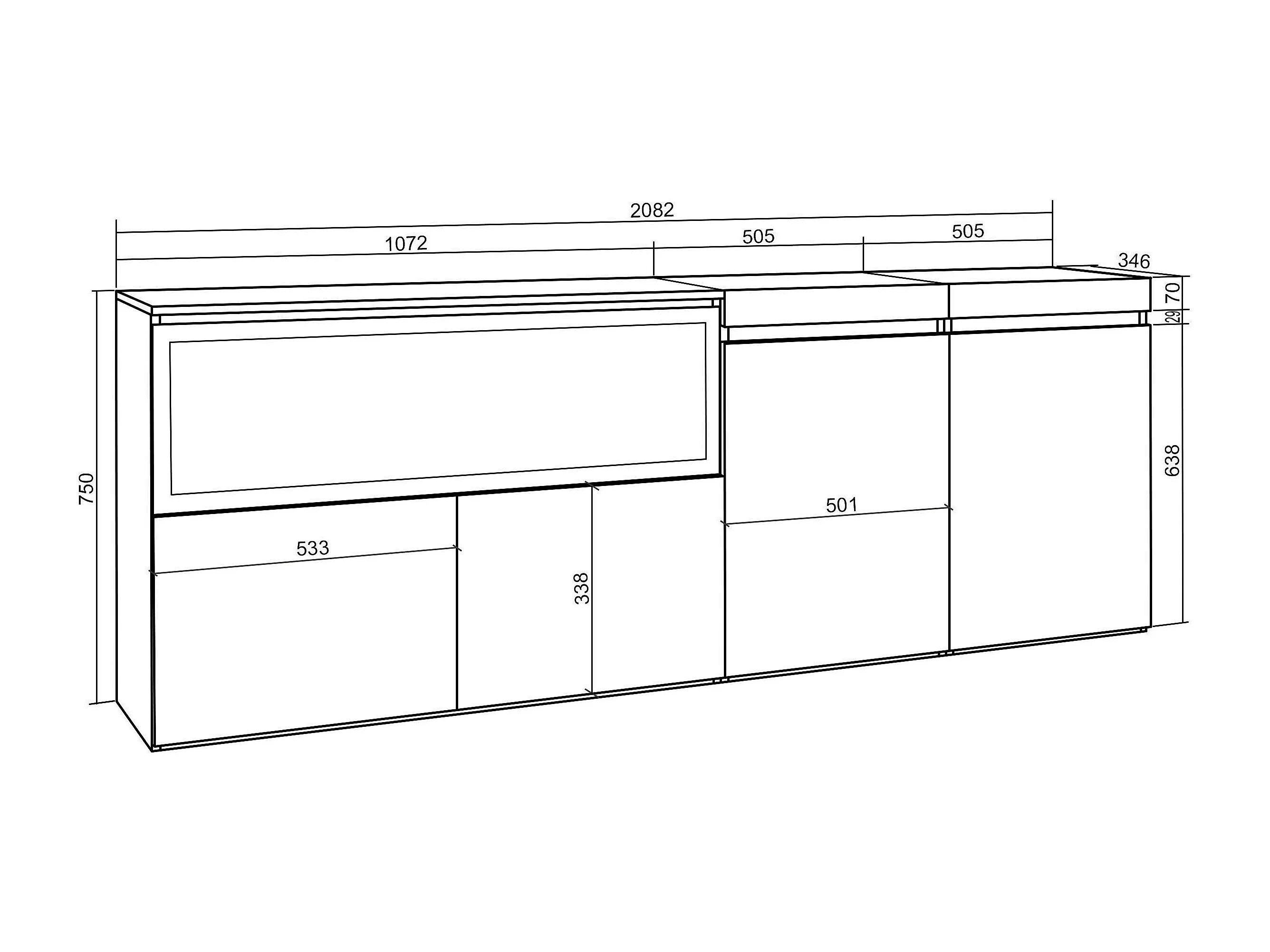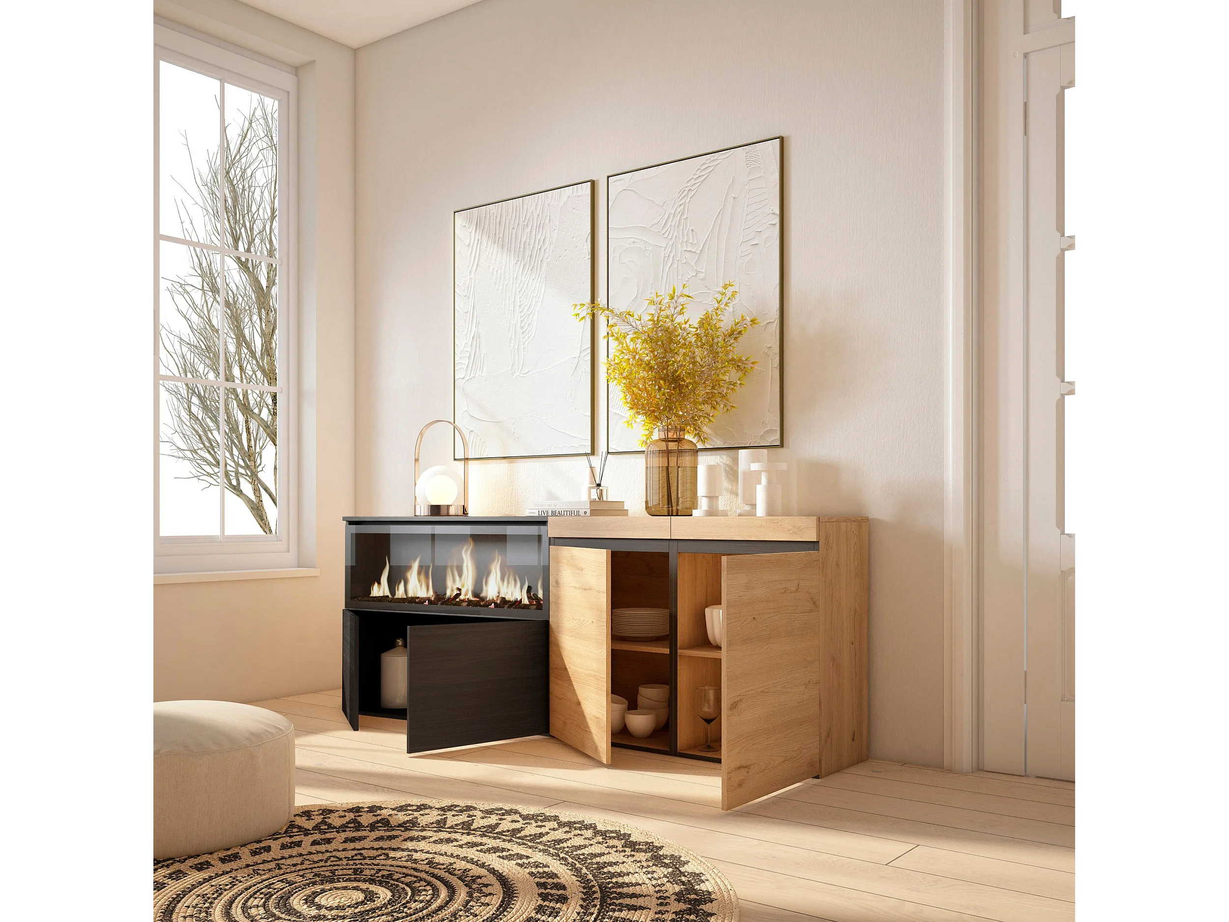 Buffet salon et cuisine, 208x35x75cm, 4 Portes, Cheminée électrique XXL, Chêne et noir