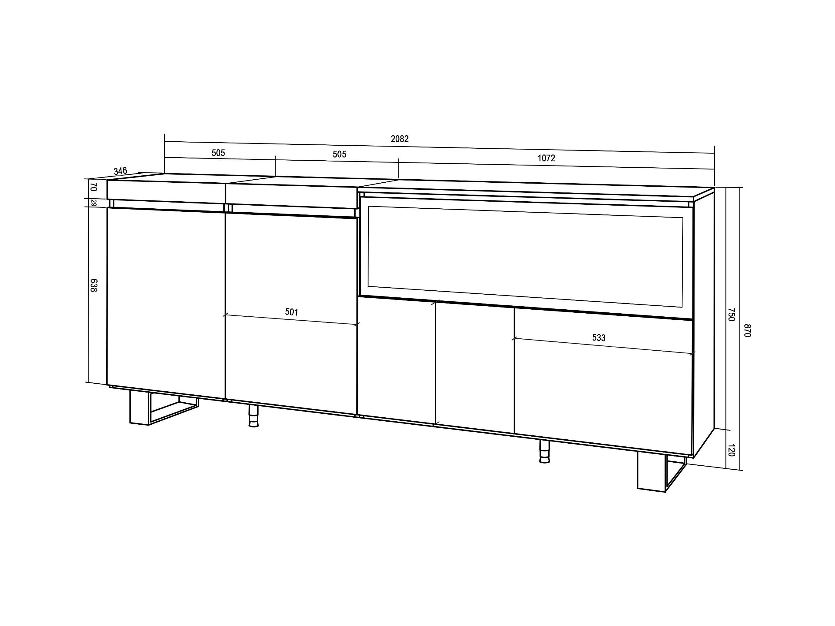 Buffet salon et cuisine, 208x35x87cm, 4 Portes, Cheminée électrique XXL, Design industriel, Chêne