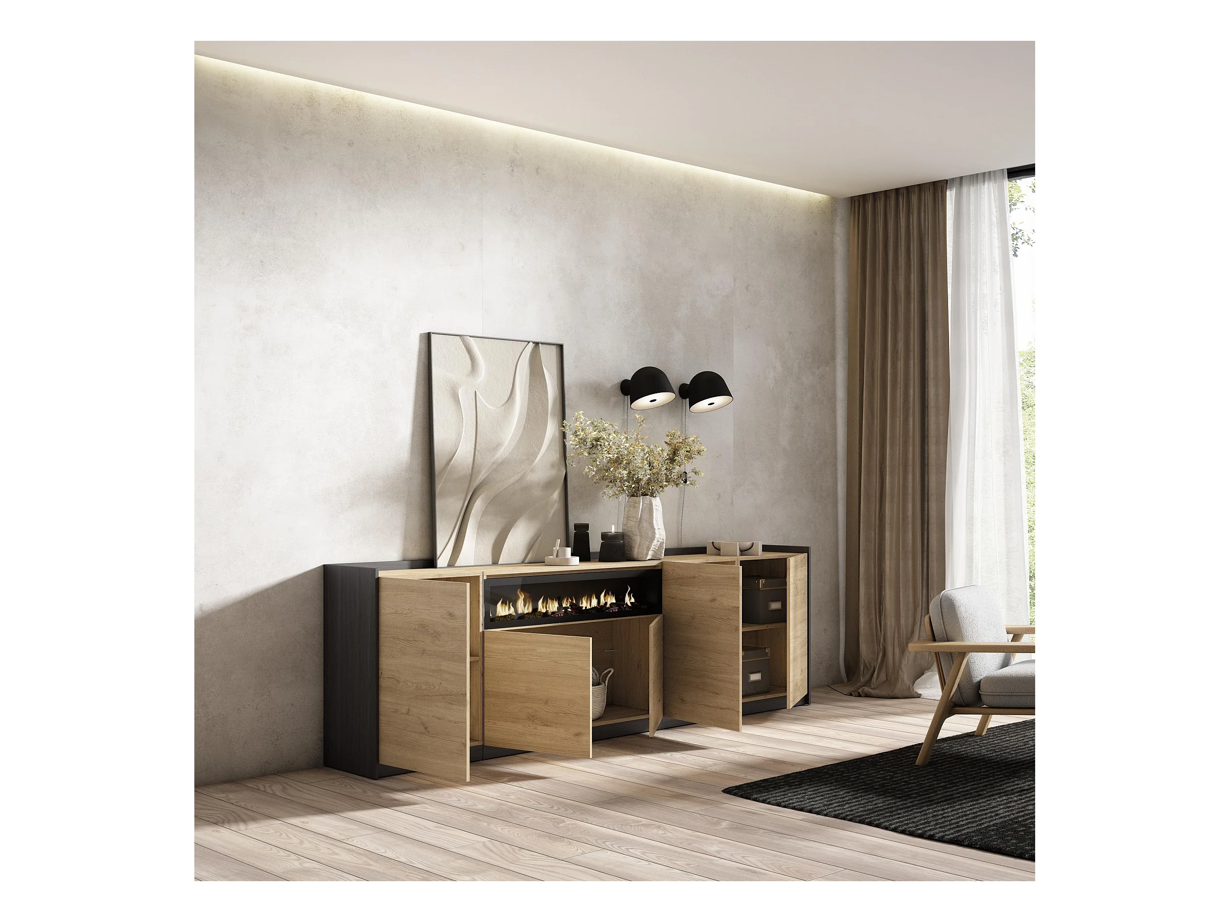 Buffet salon et cuisine, 207x80x37 cm, 4 Portes, Cheminée électrique, Chêne et noir