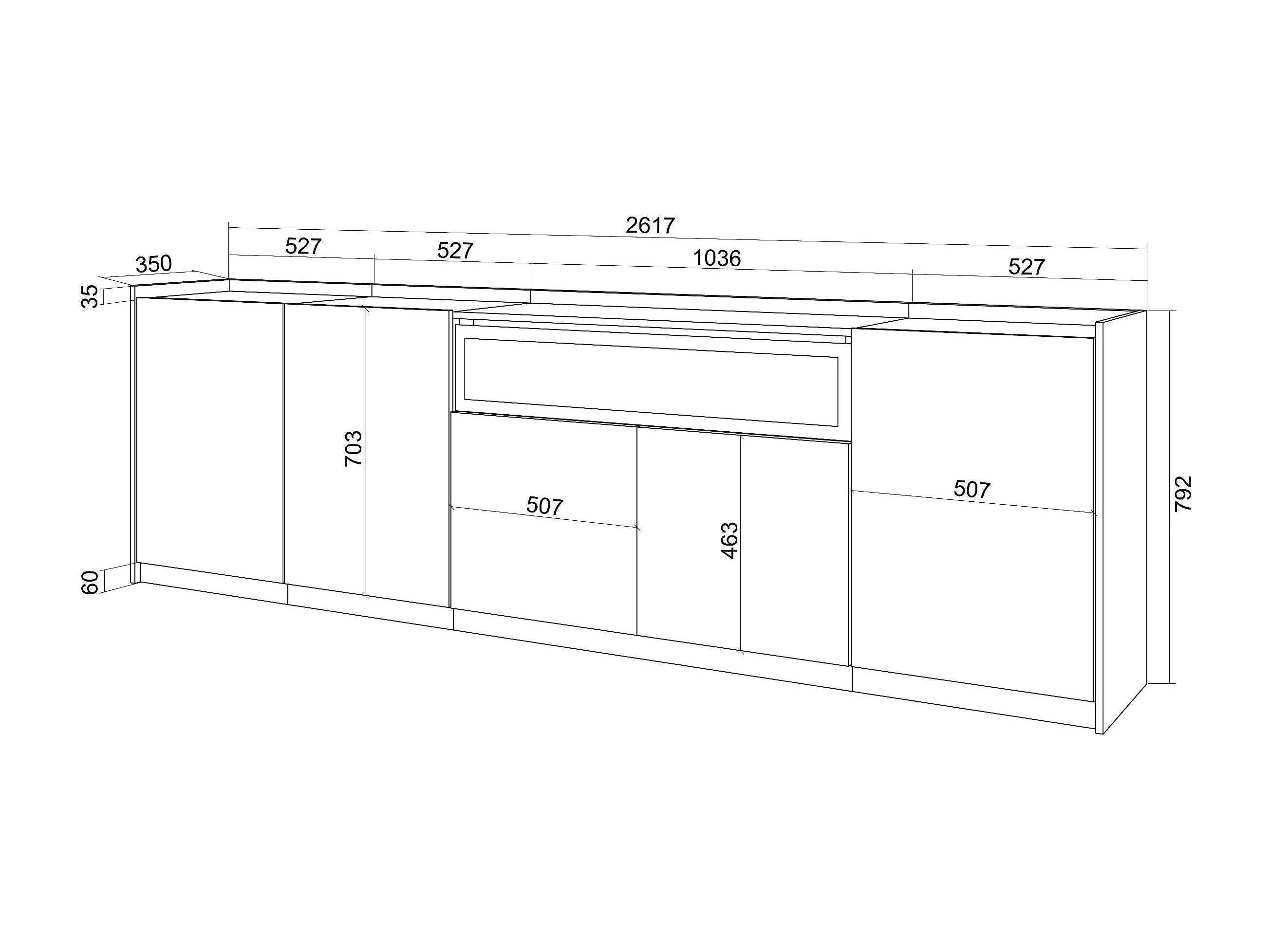 Buffet salon et cuisine, 260x80x37 cm, 5 Portes, Cheminée électrique, Chêne et noir