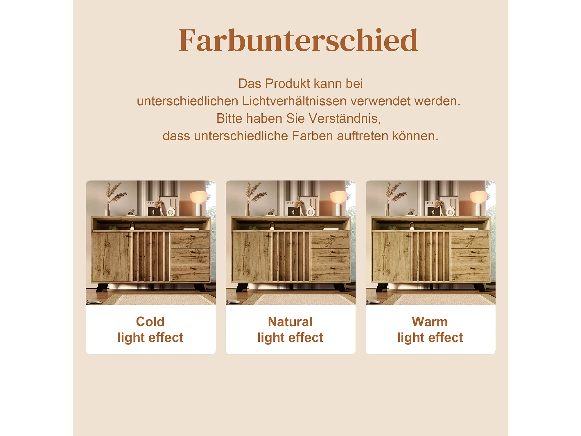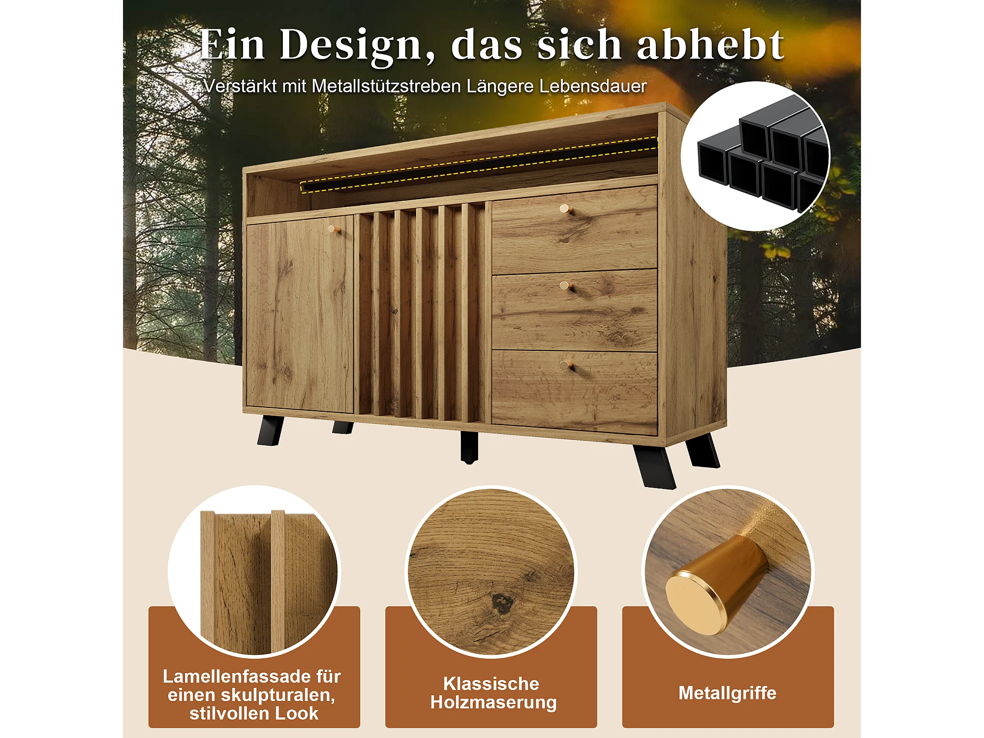Buffet style vintage pour salon - 120 x 40 x 85 cm - avec 3 tiroirs + 2 portes + étagère ouvert + façade à lattes - bois - naturel foncé