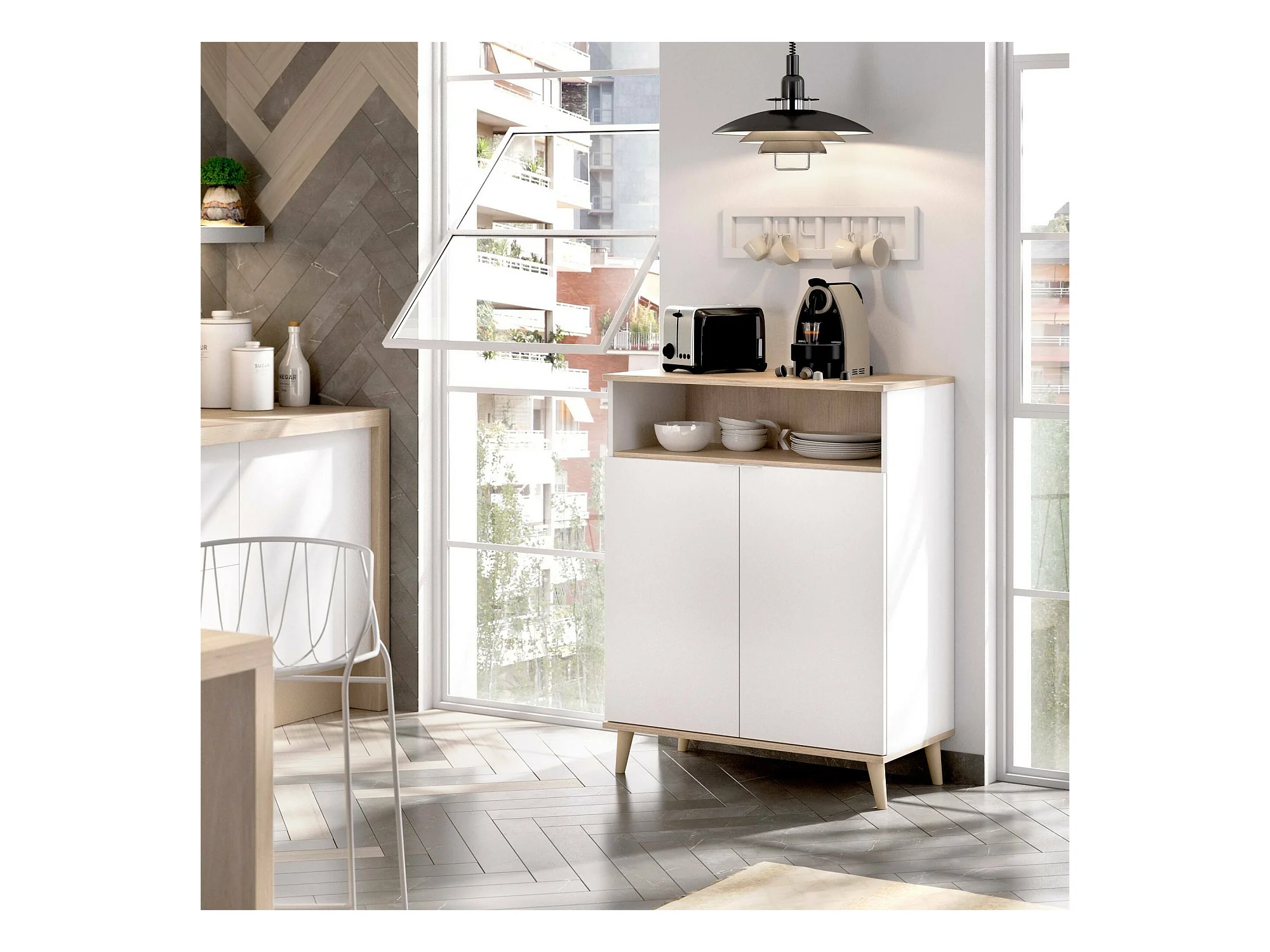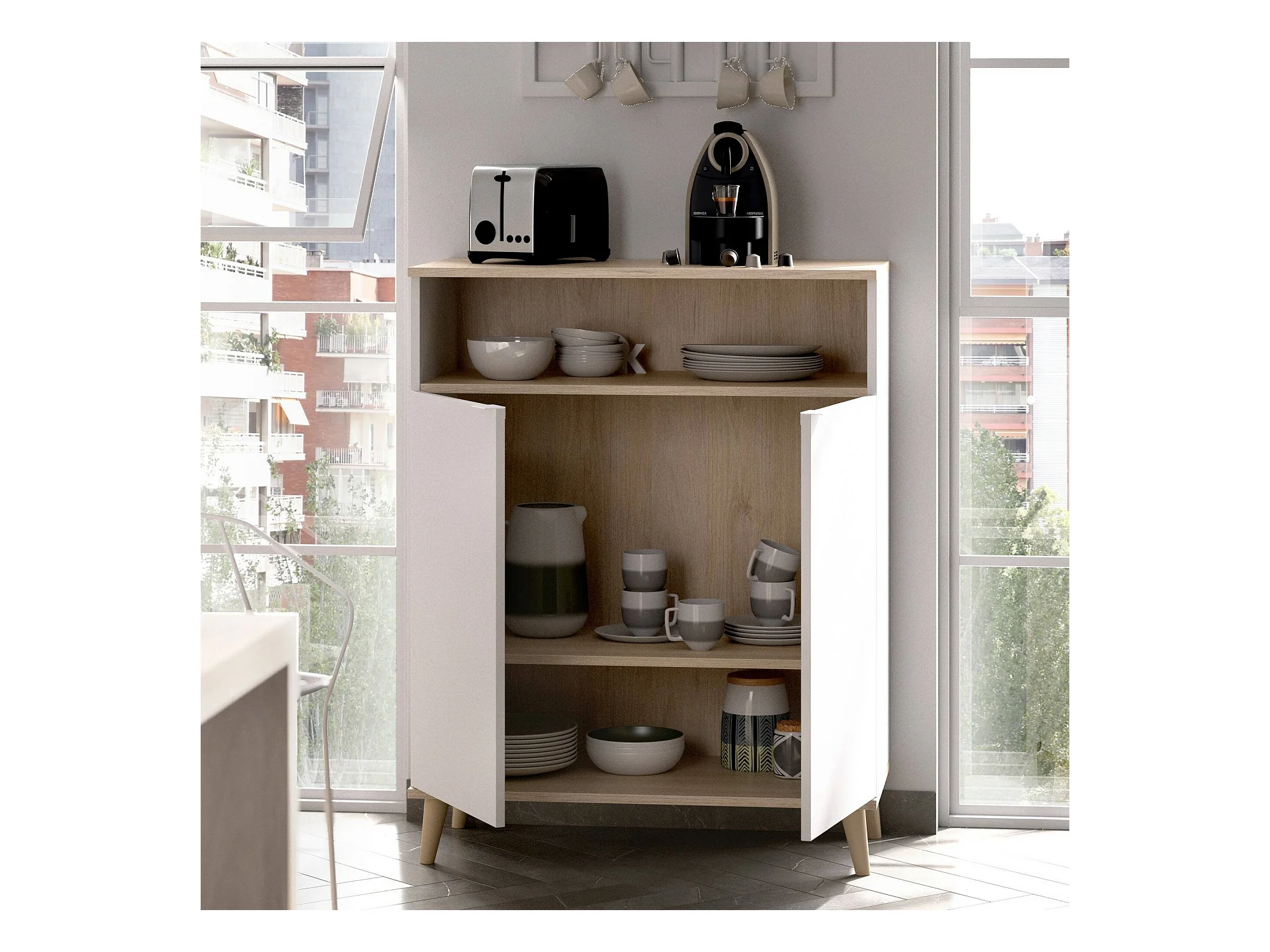 Buffet Sumbra, Buffet garde-manger de salon, Buffet de salon moderne avec 2 portes, 120x40h102 cm, Blanc et Chêne