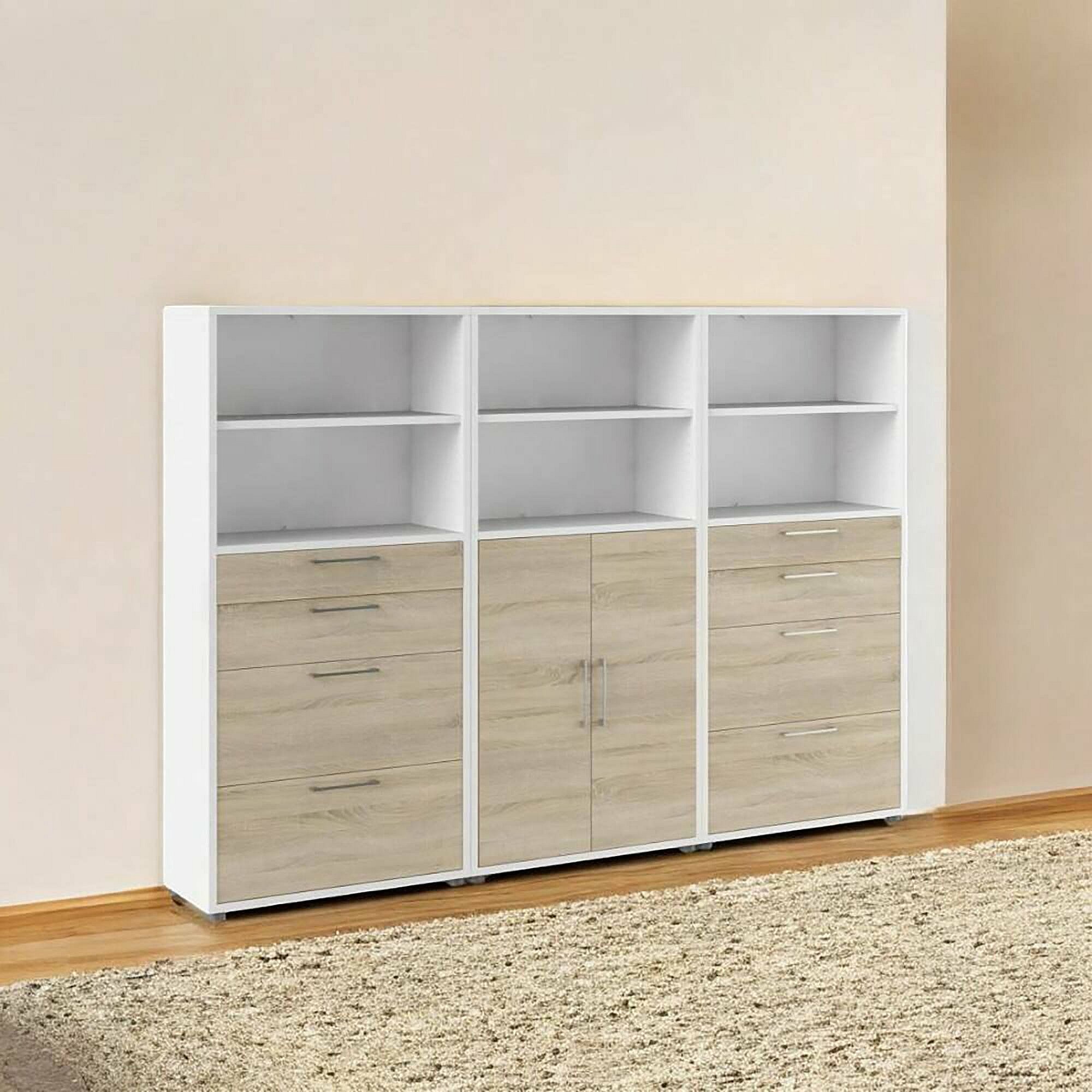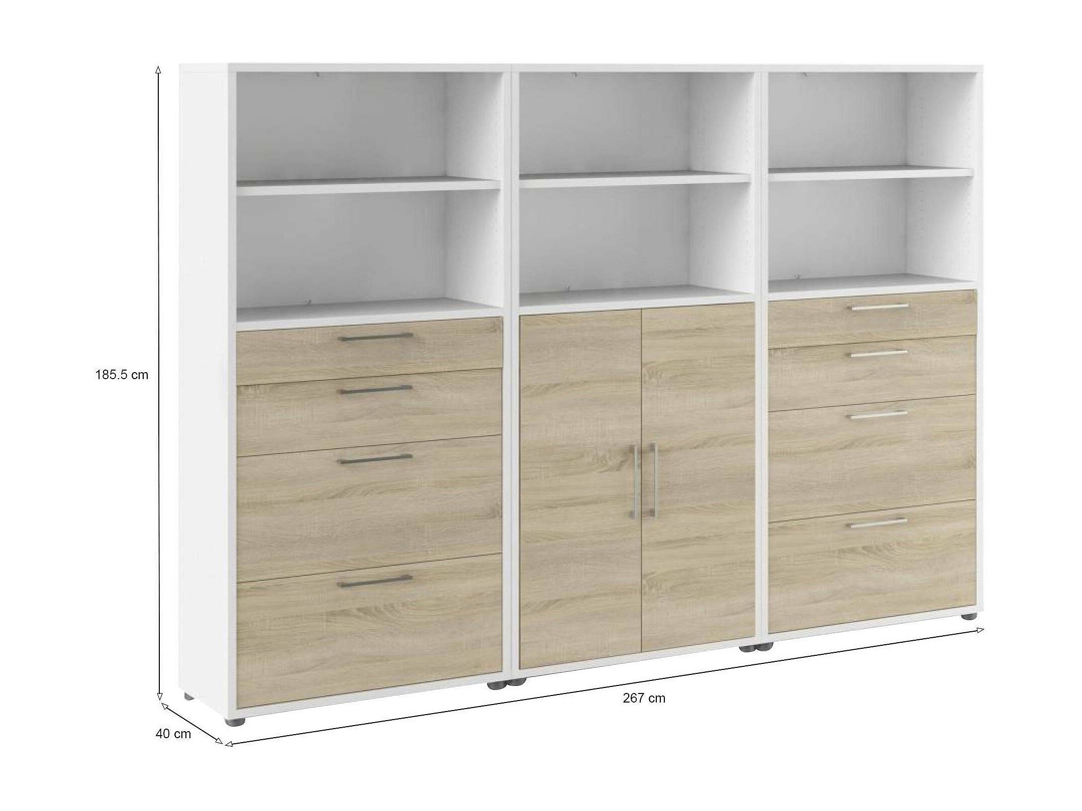 Buffet Vinovo, Buffet du salon, Commode de salon, Garde-manger de cuisine, 267x40 h186 cm, Blanc et chêne
