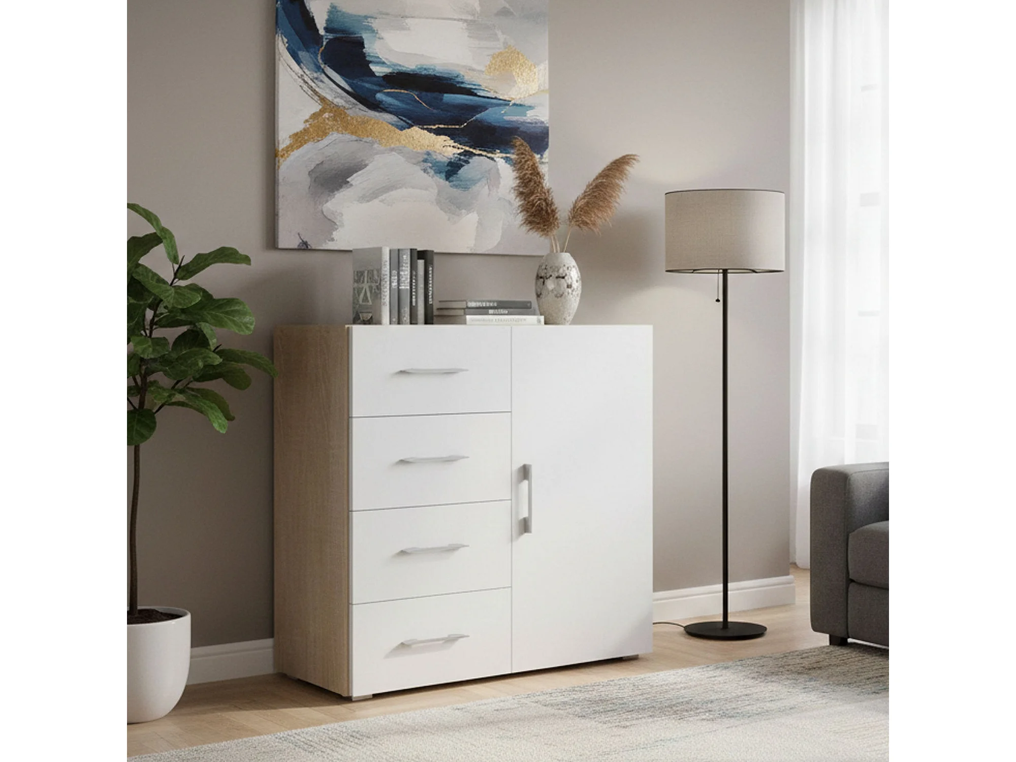 Buffet Violetta, Buffet avec 1 porte et 4 tiroirs, Buffet de salon, Armoire polyvalente avec étagères, 100% Made in Italy, 90x41h87 cm, Blanc et Chêne