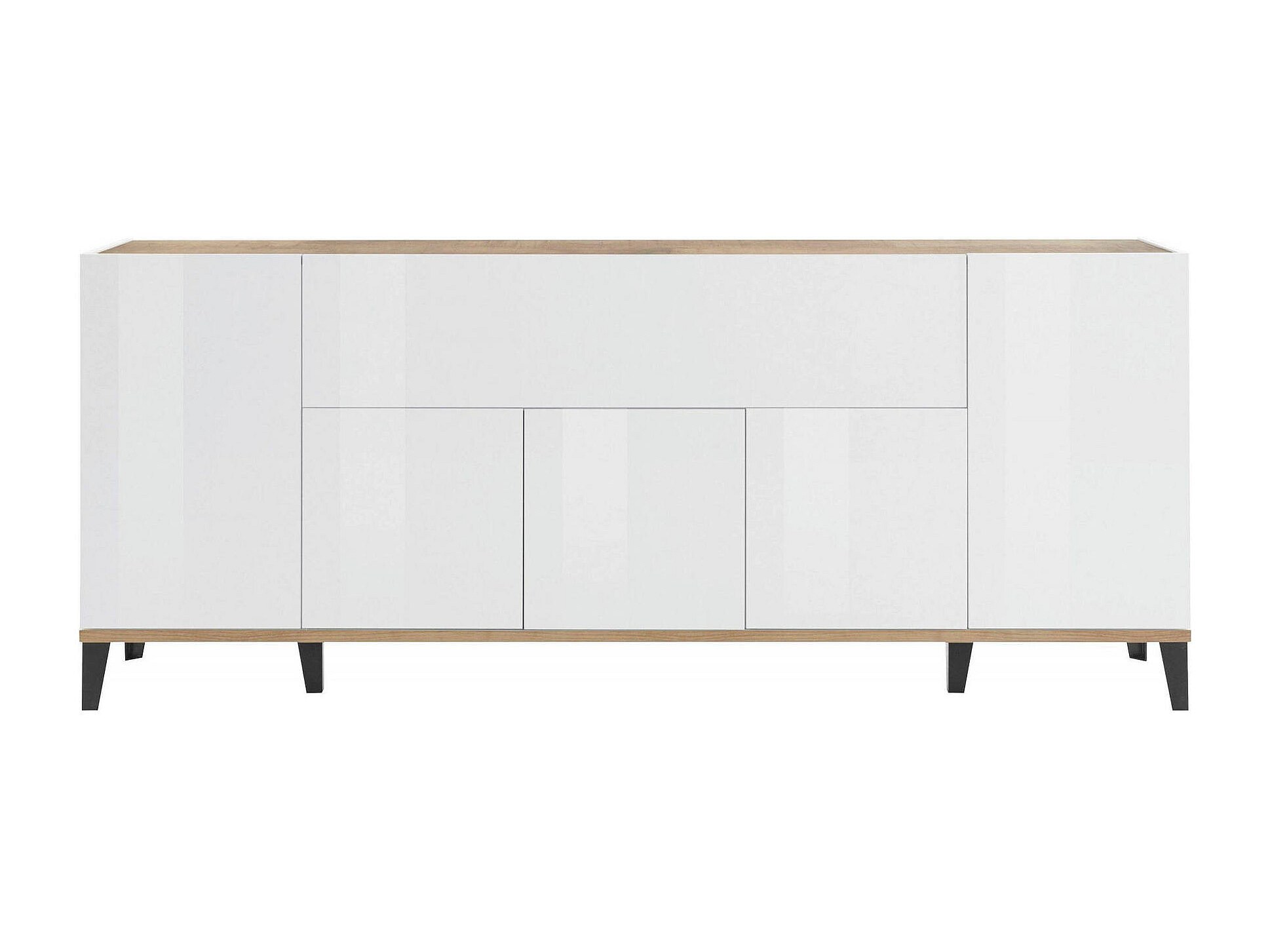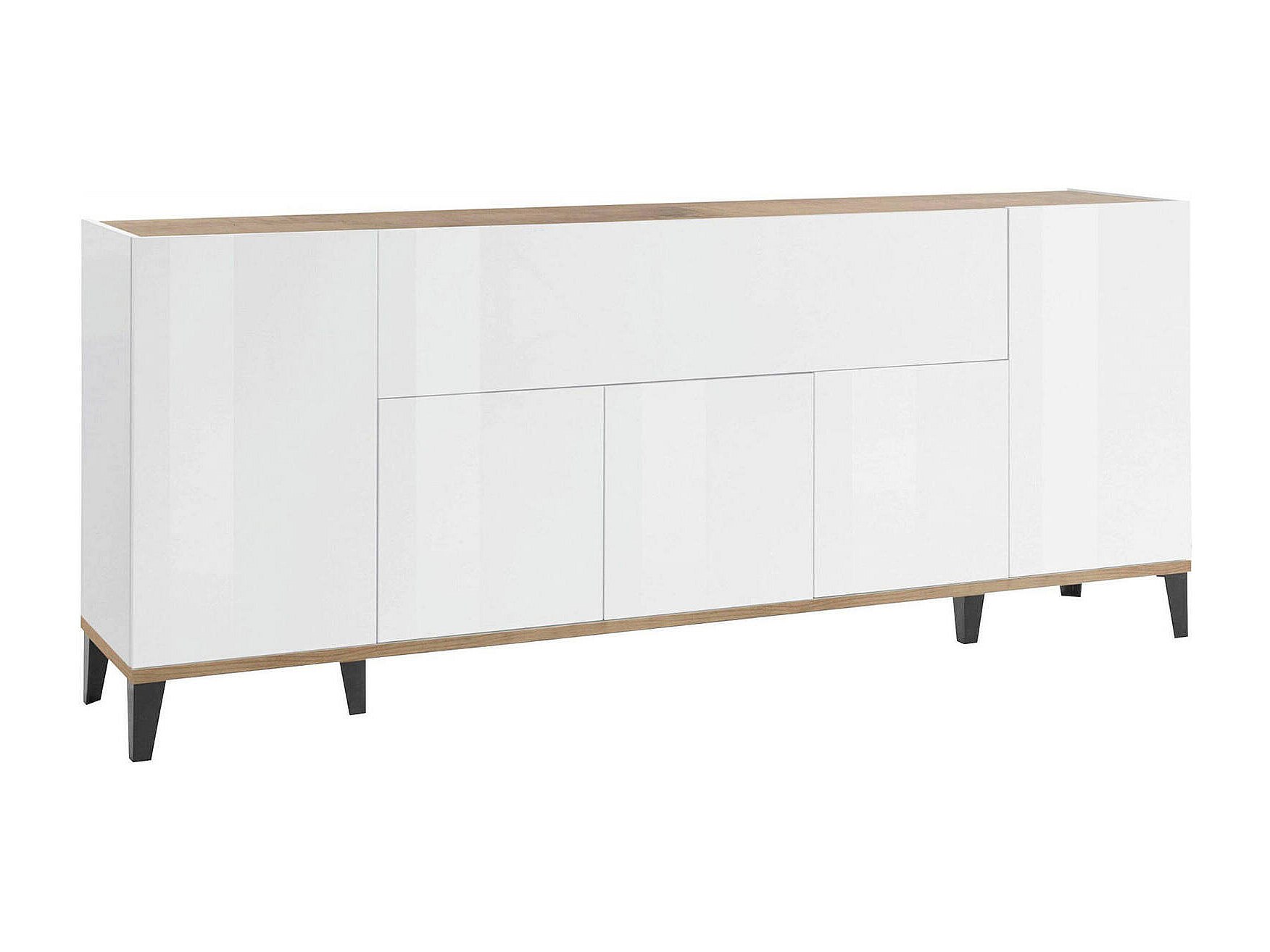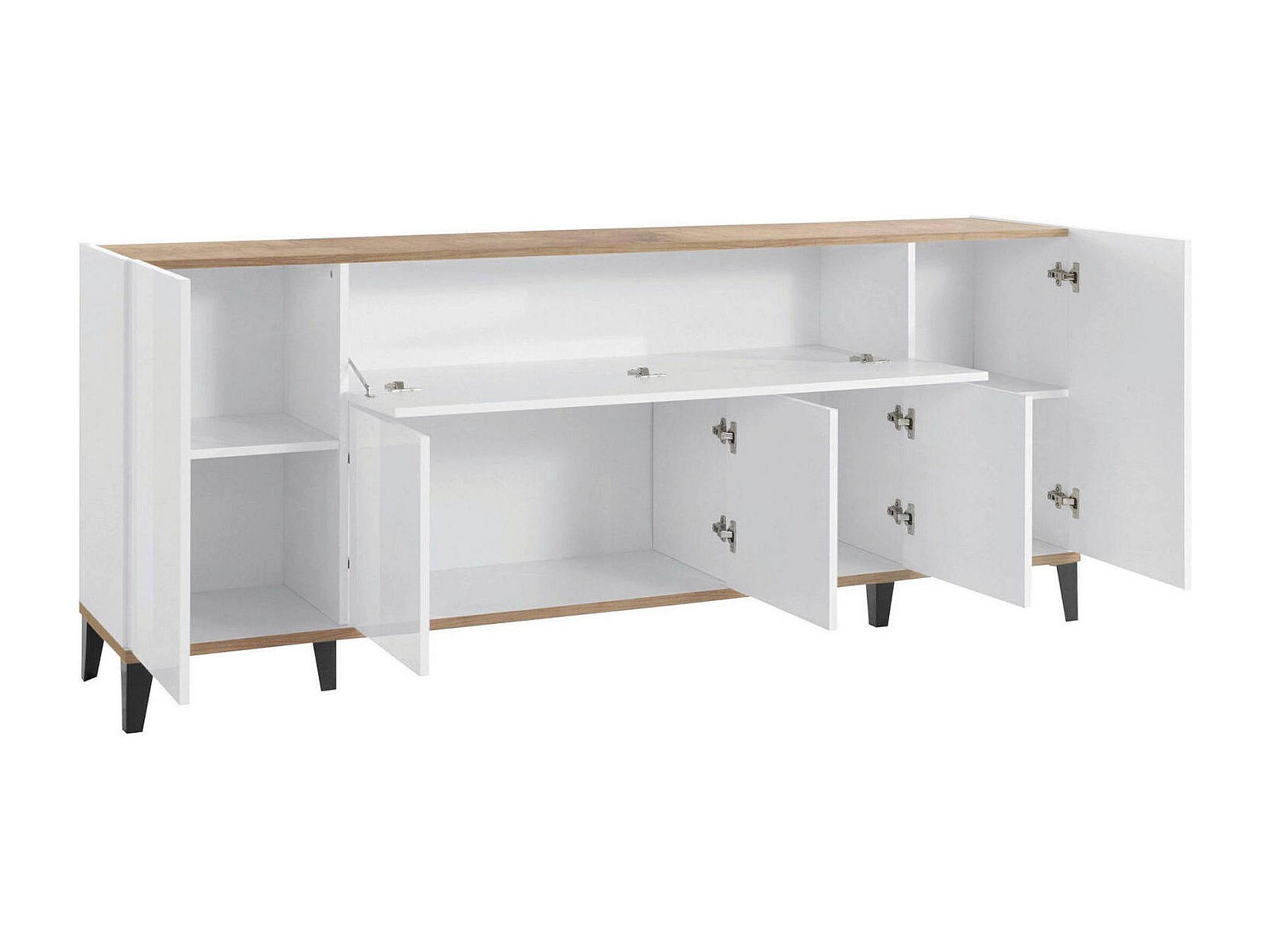 Buffet Loris, Buffet de cuisine avec 4 portes, Buffet de salon, 100% Made in Italy, 200x45h86 cm, Blanc brillant et érable