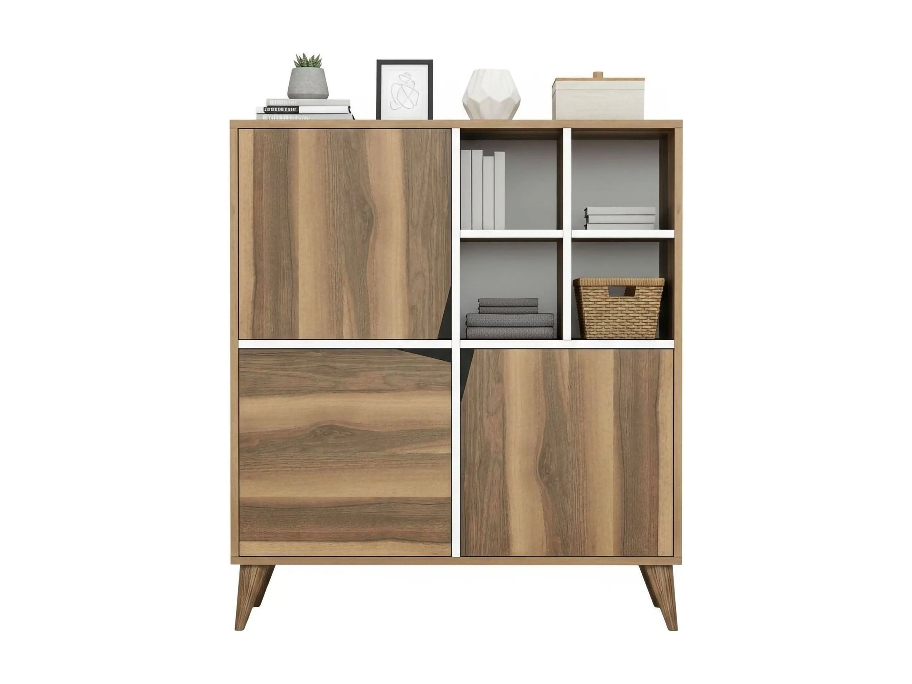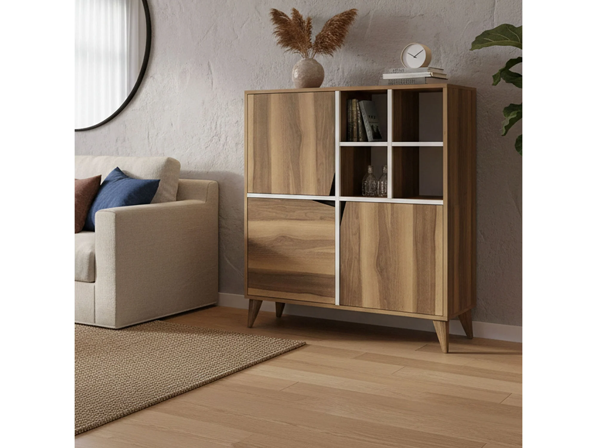 Buffet Wazn, Buffet du salon, Commode de salon, Garde-manger de cuisine, 100x30h115 cm, Noyer et Blanc