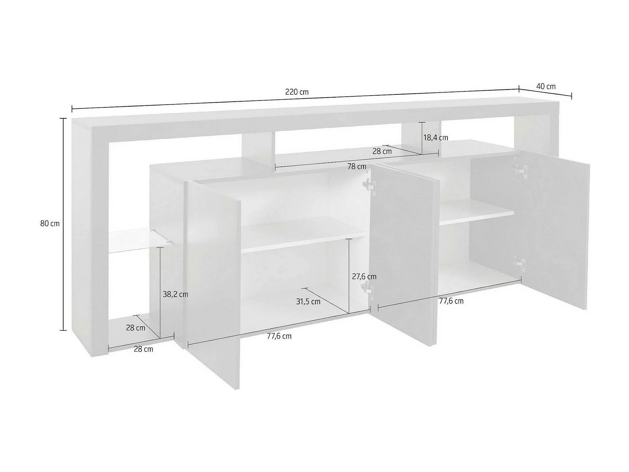 Buffet Wilmer, Buffet de salon 4 portes, Buffet de salon, Buffet moderne, 100% Made in Italy, 220x40h80 cm, Blanc brillant