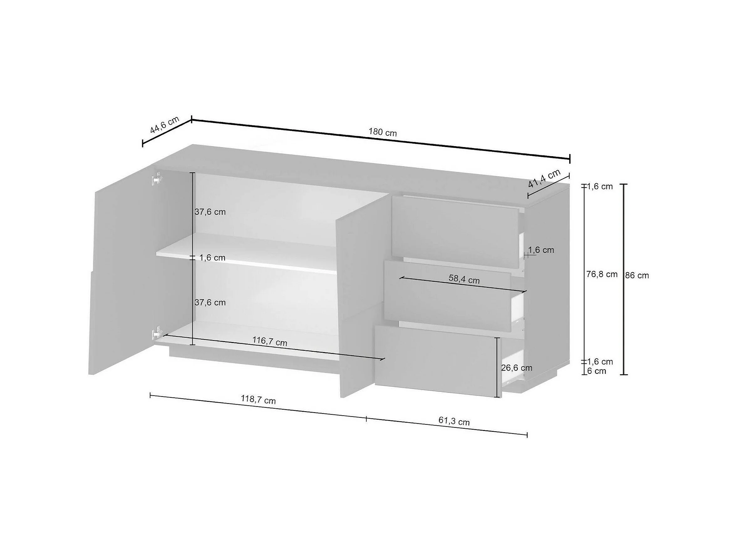 Buffet Xavier, Buffet de salon, Buffet de salon avec 2 portes et 3 tiroirs, 180x44h86 cm, Blanc brillant