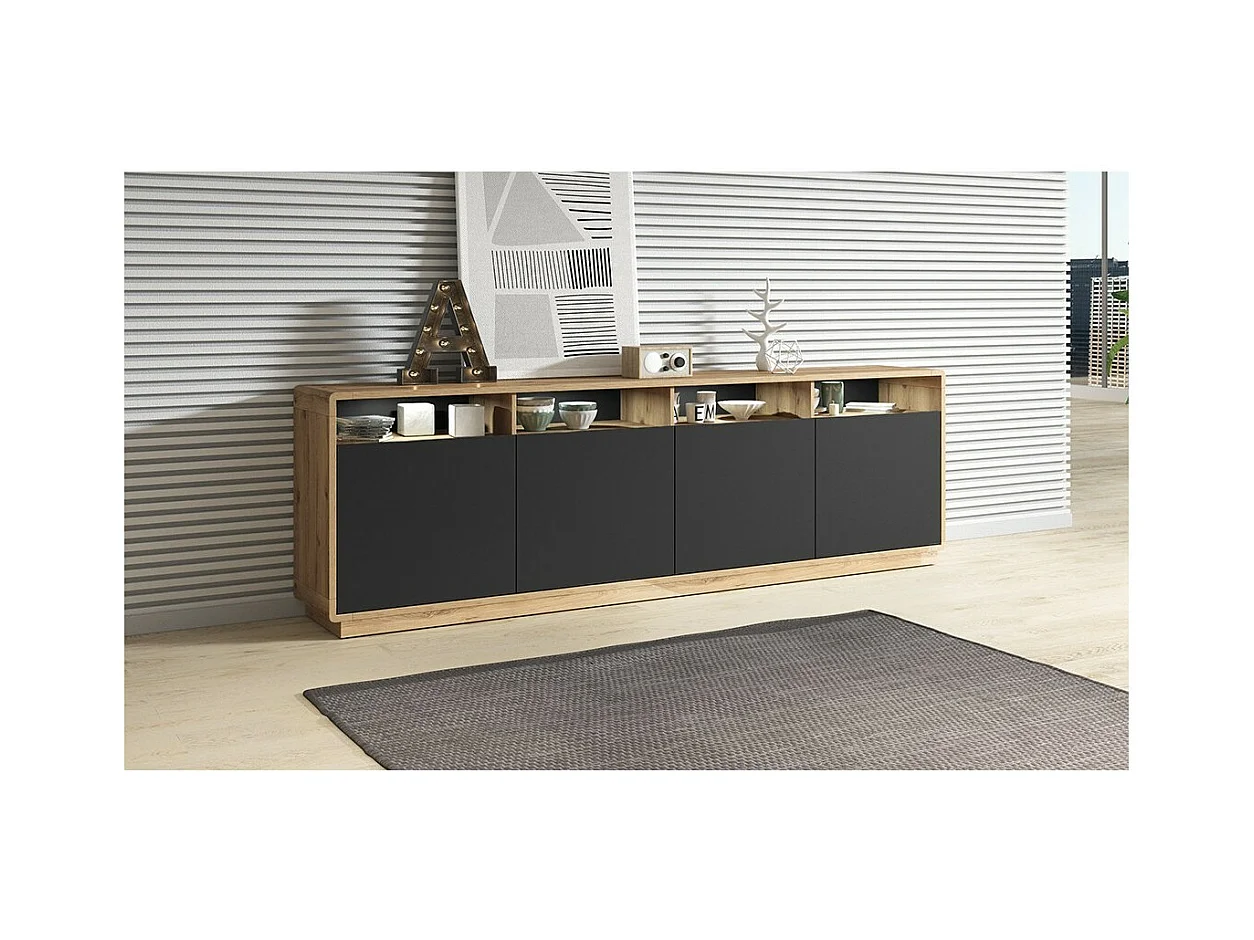 Buffet XL 240cm collection VILLA. Couleur chêne et noir. 4 portes et 4 niches éclairées