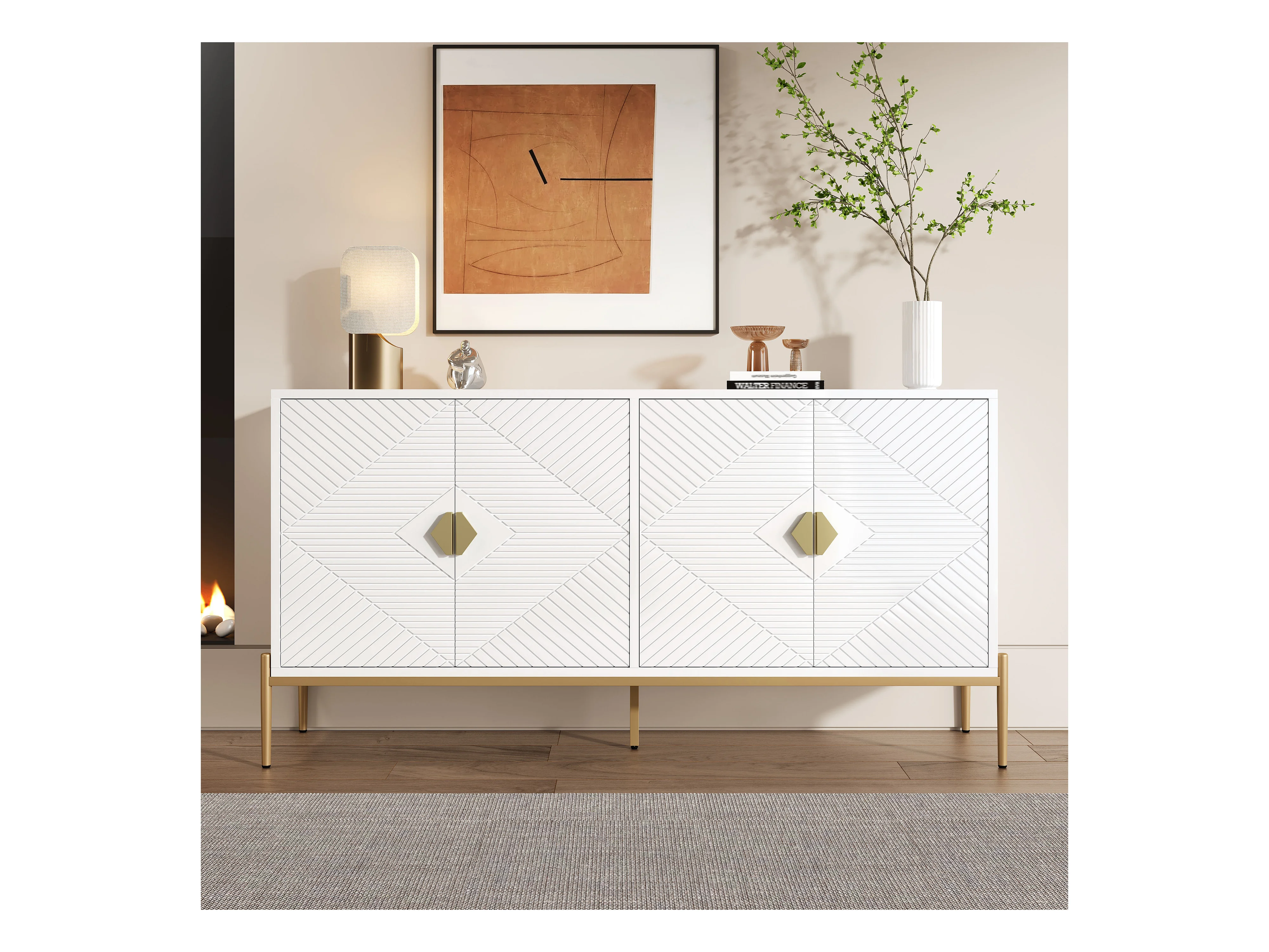 Buffet à texture en relief - 160 x 40 x 82 cm - avec 4 portes - pieds brillants - blanc - aggloméré - blanc