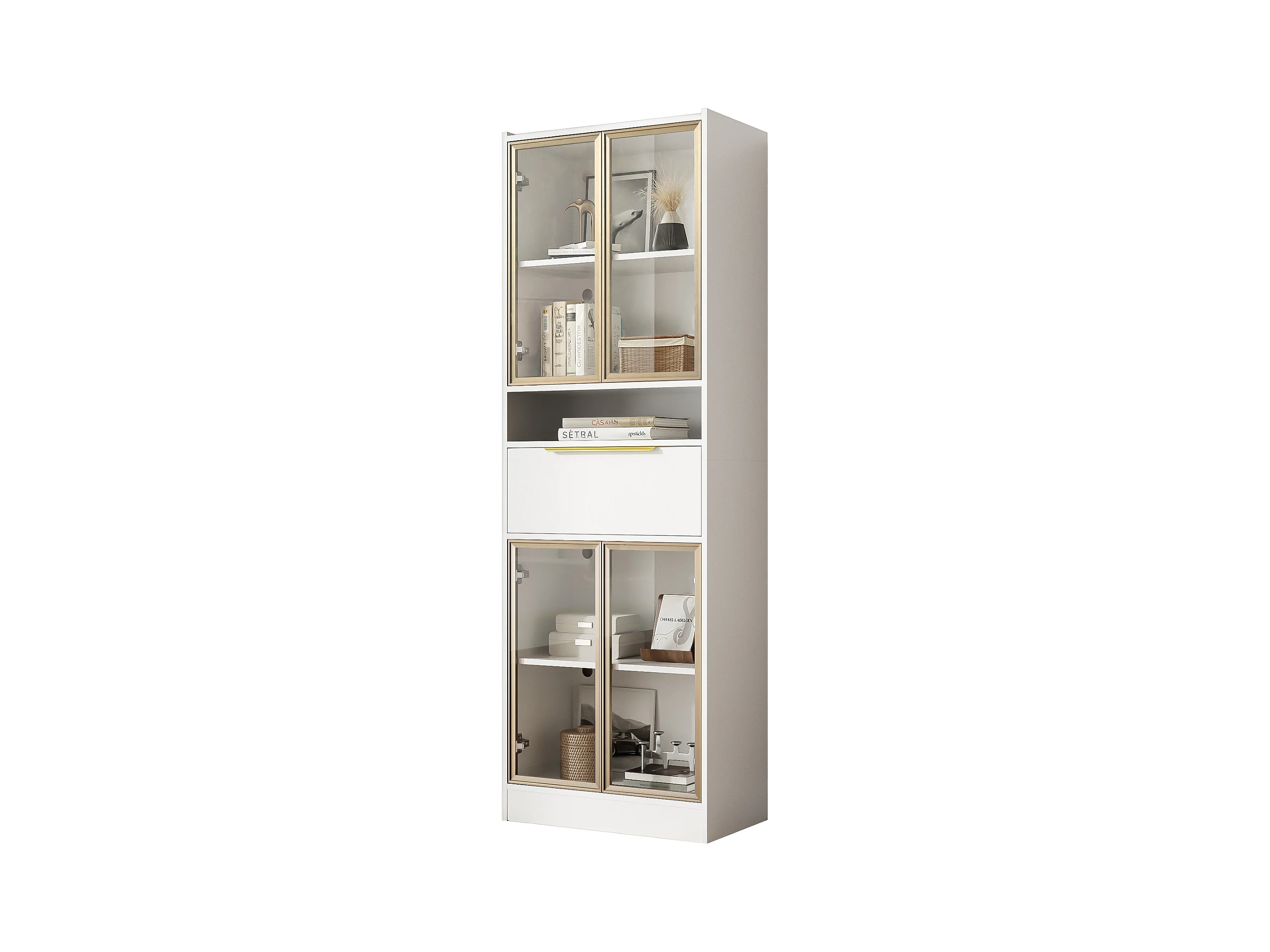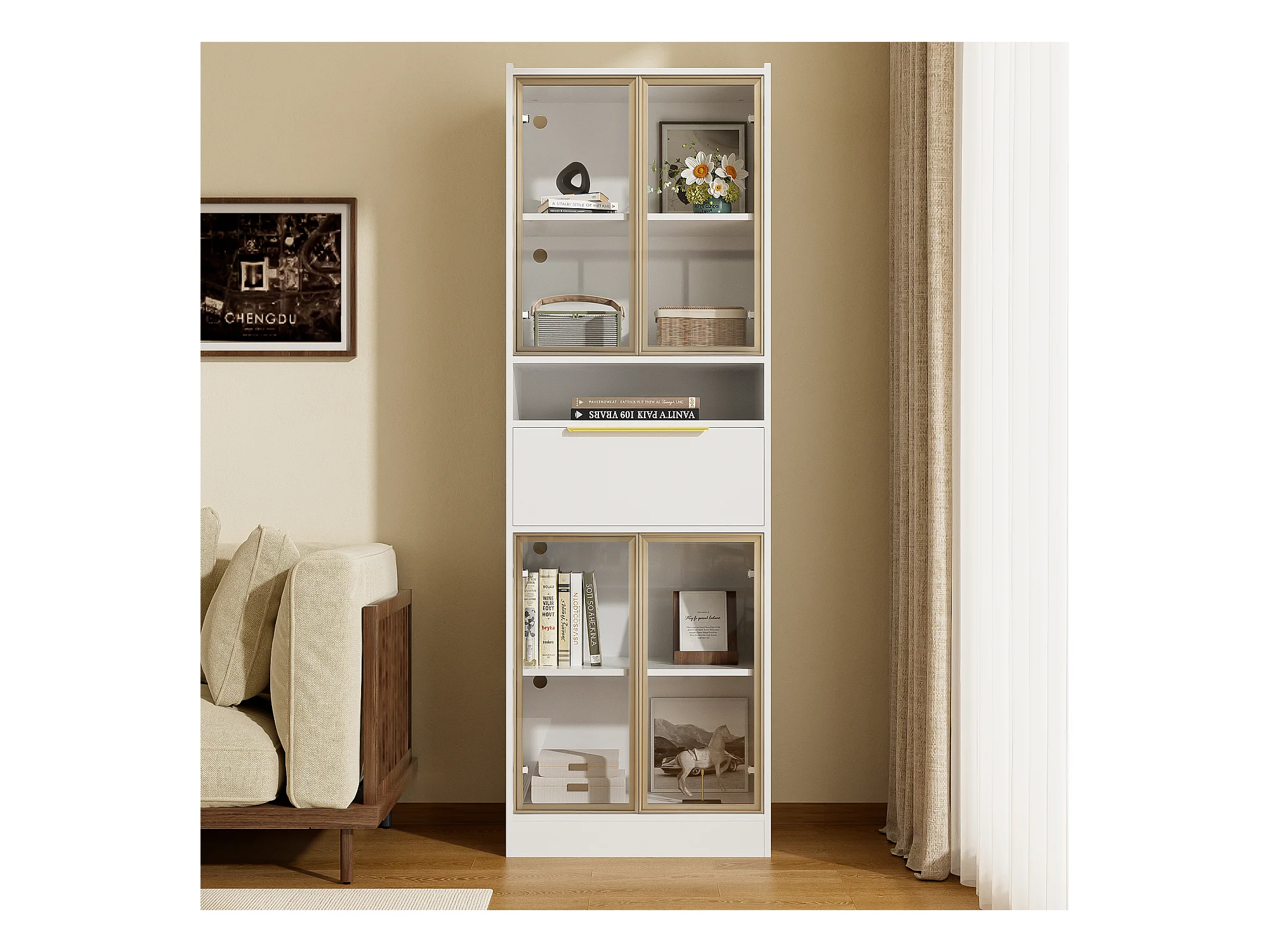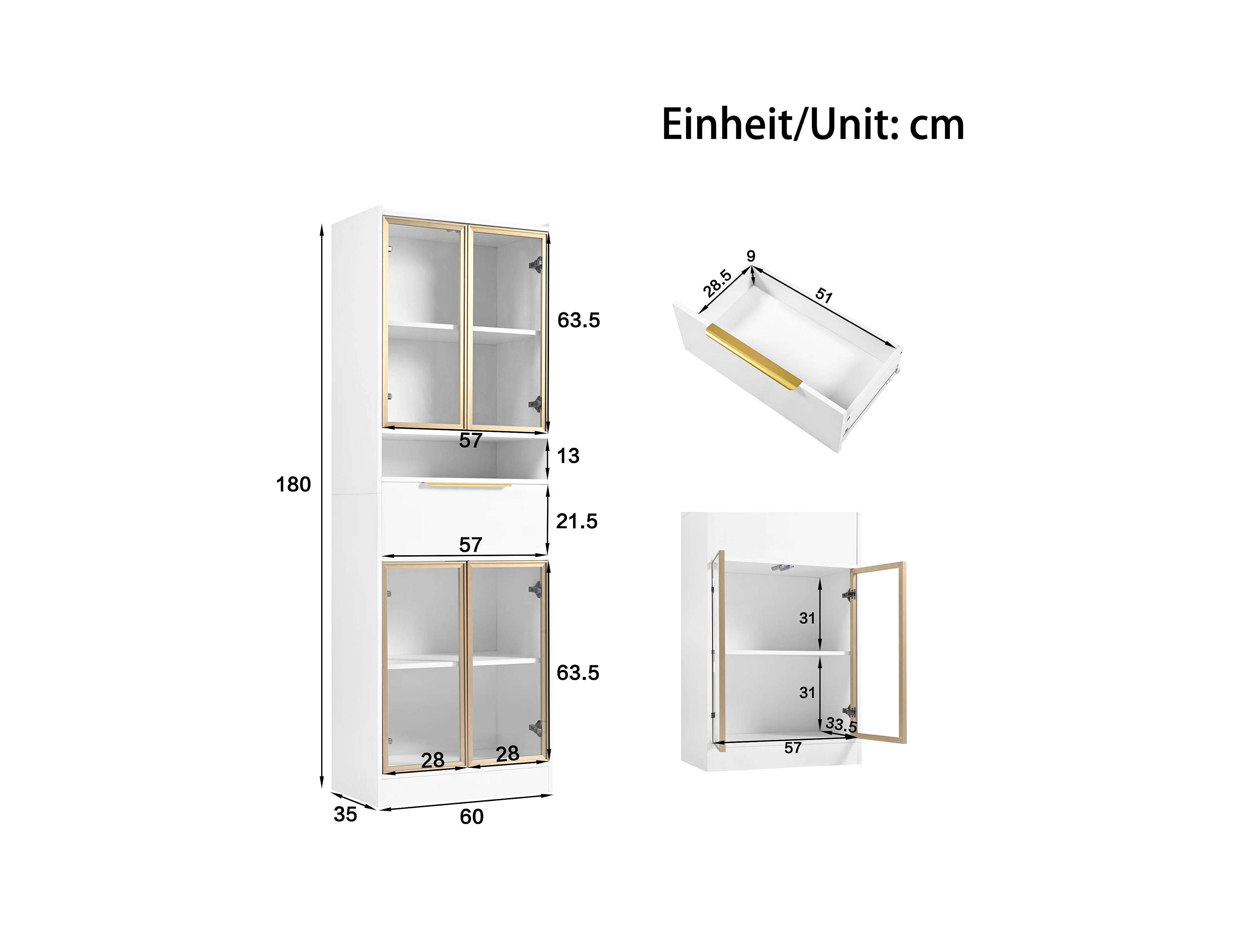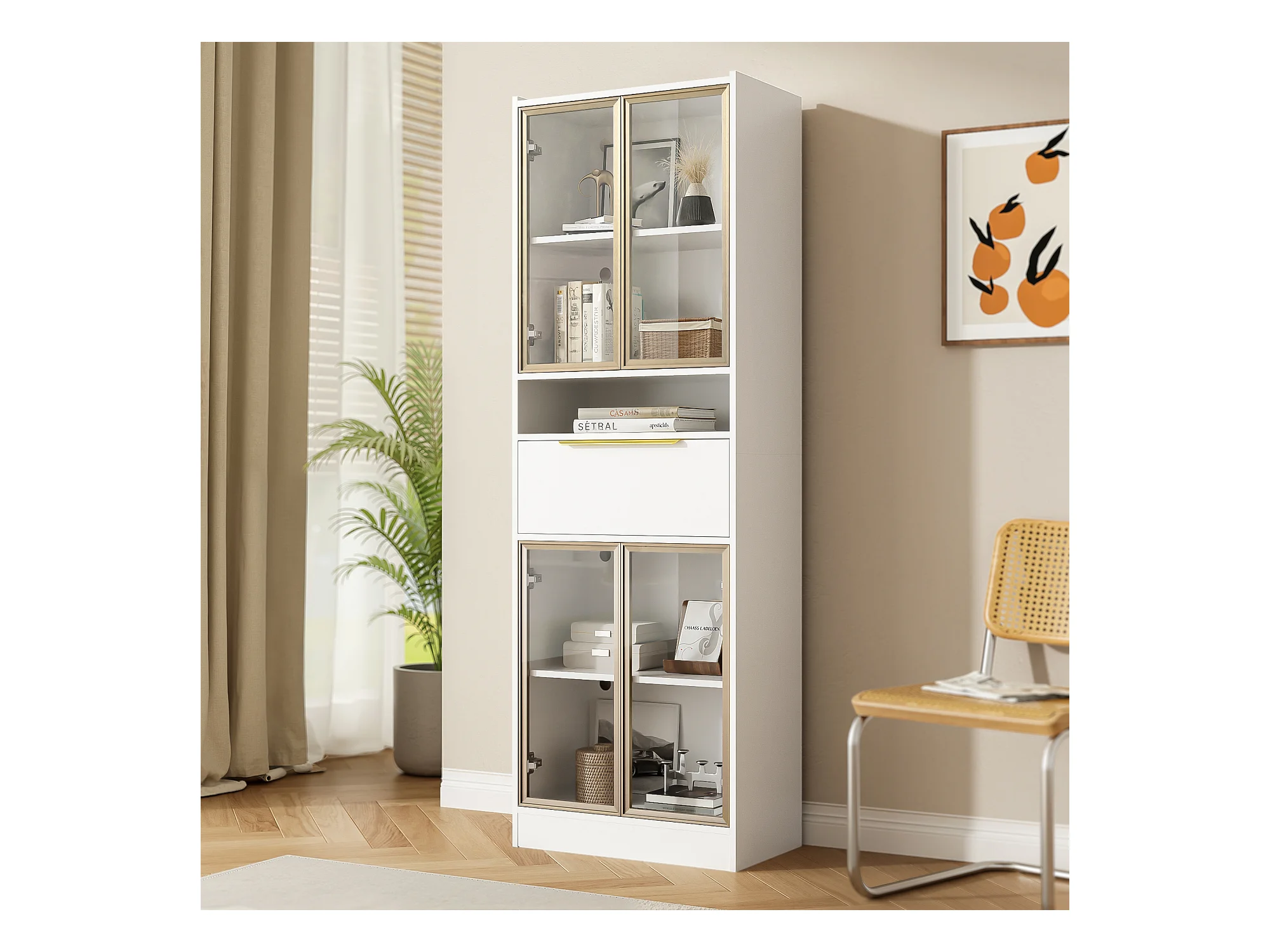 Bufft haut moderne avec Leds - 60 x 35 x 180cm – Vitrine avec 4 portes en verre + tiroir - MDF - blanc