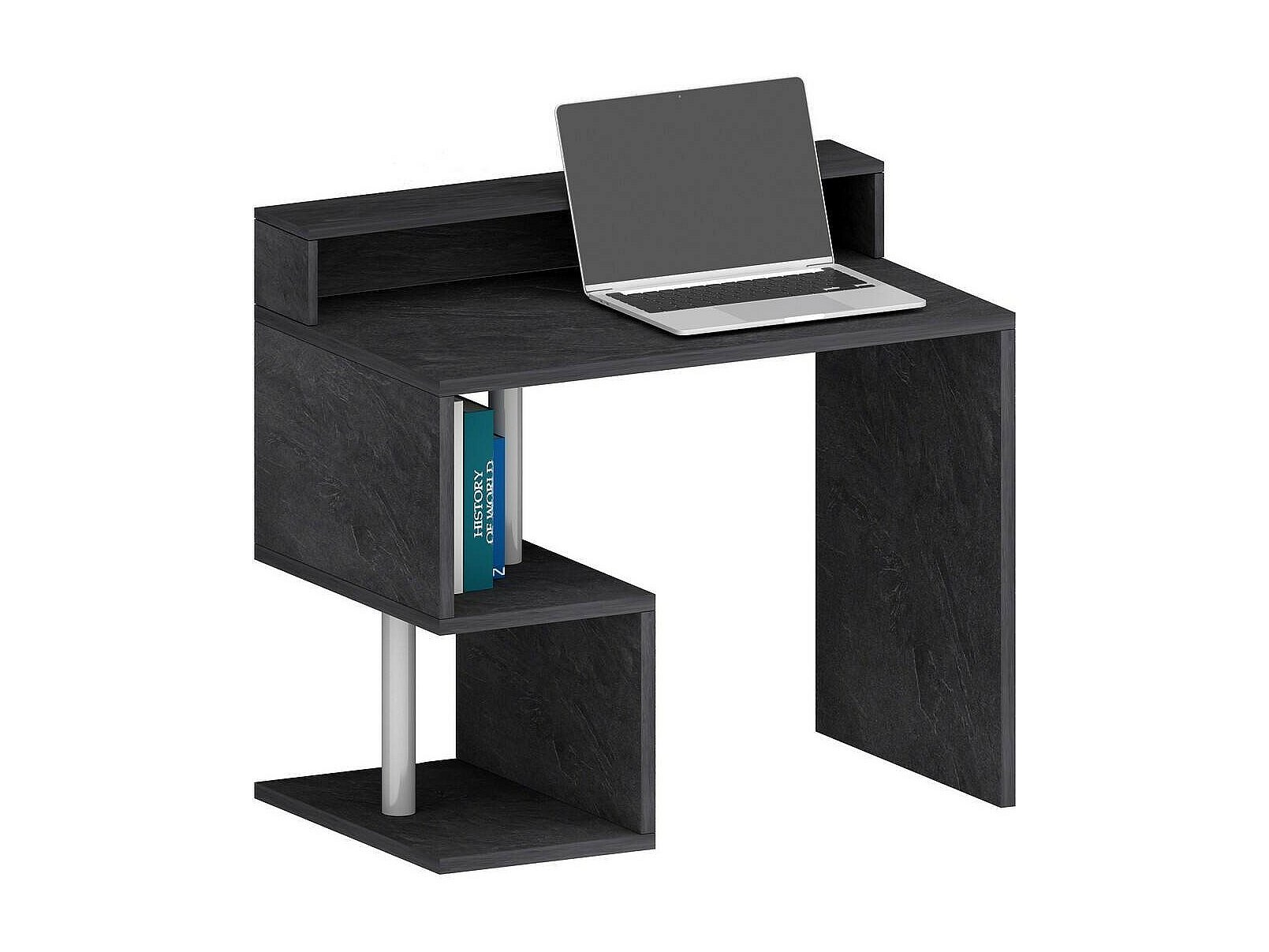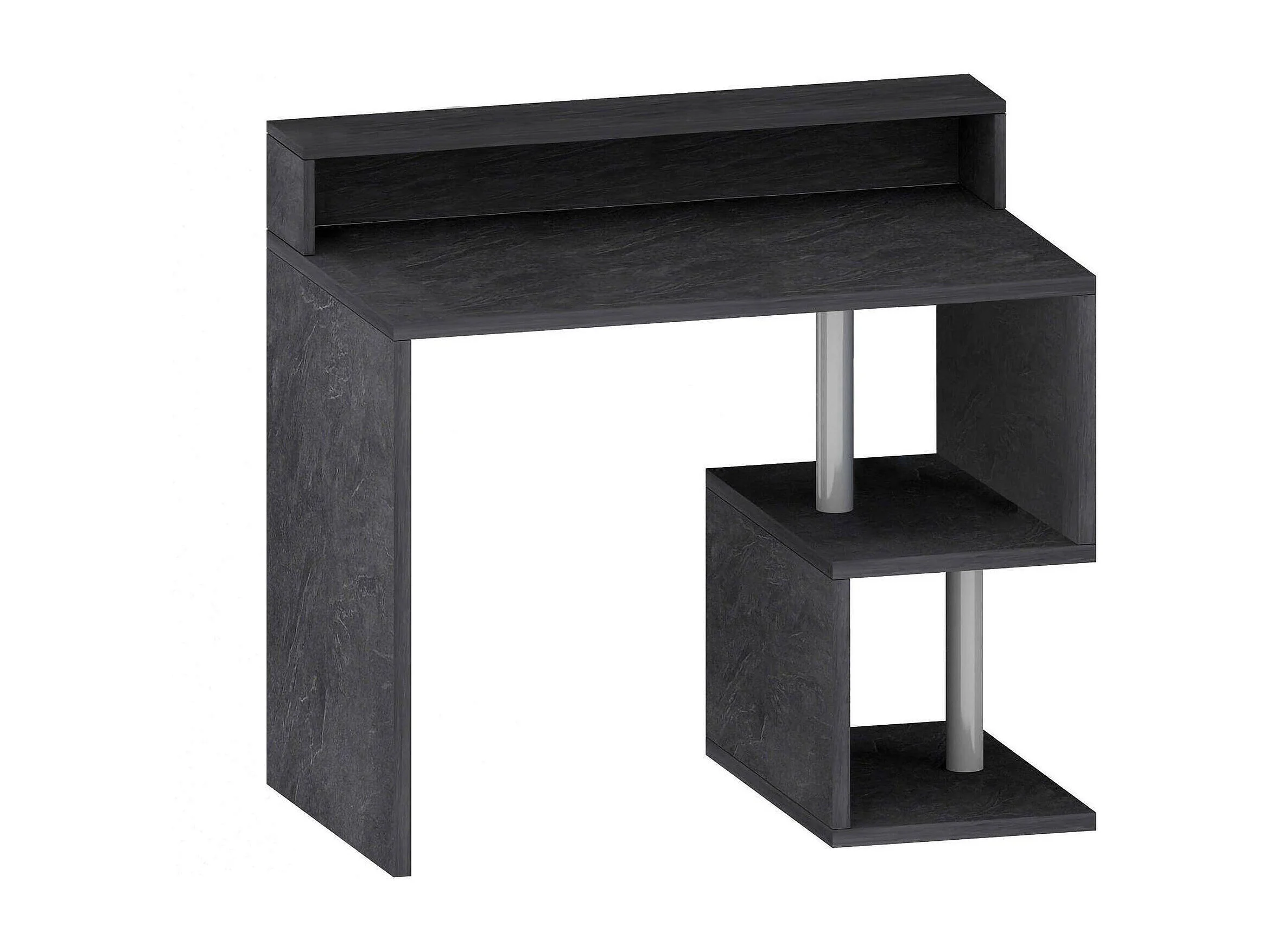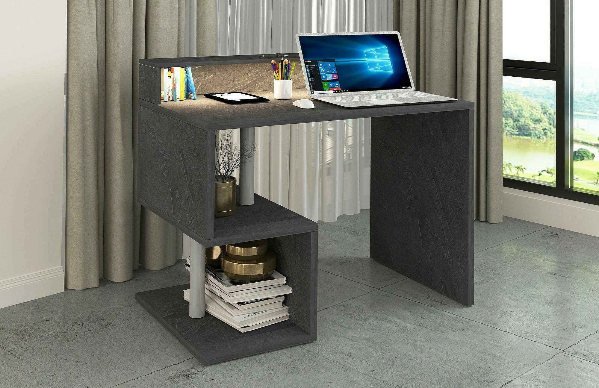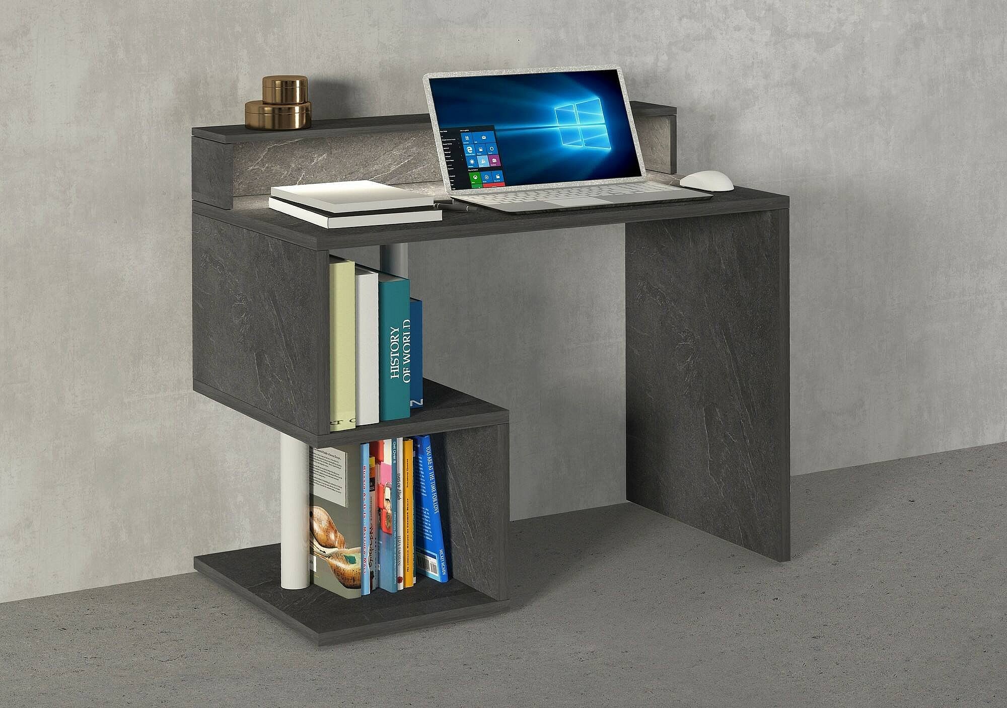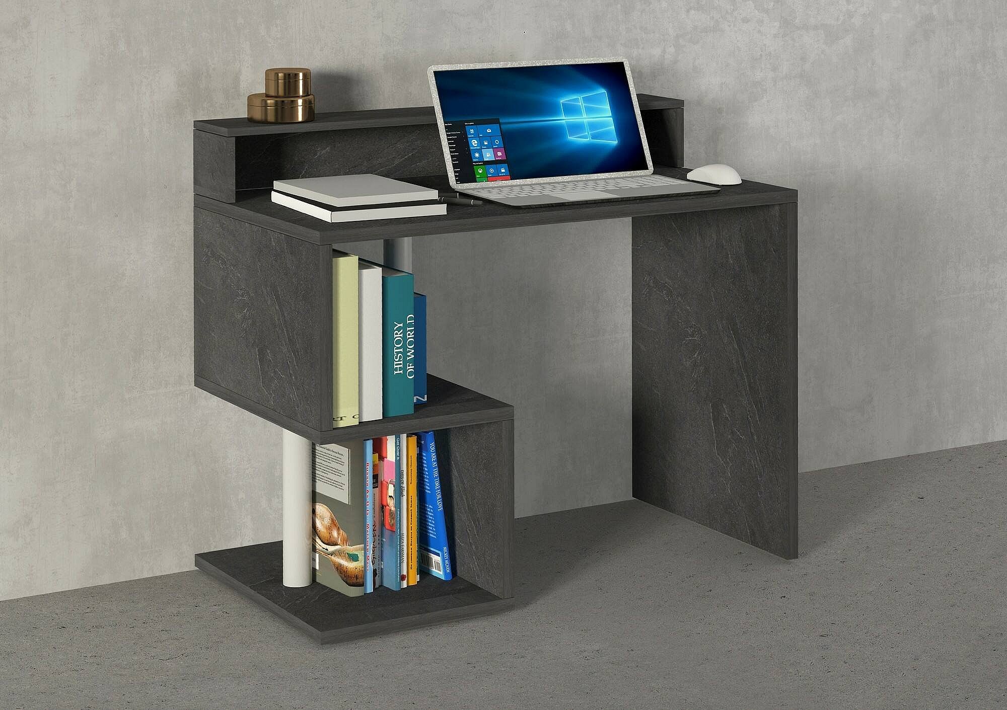 Bureau Adrien, Bureau linéaire avec étagères de rangement avec lampes LED, Bureau polyvalent avec plateau, 100x50h93 cm, Ardoise