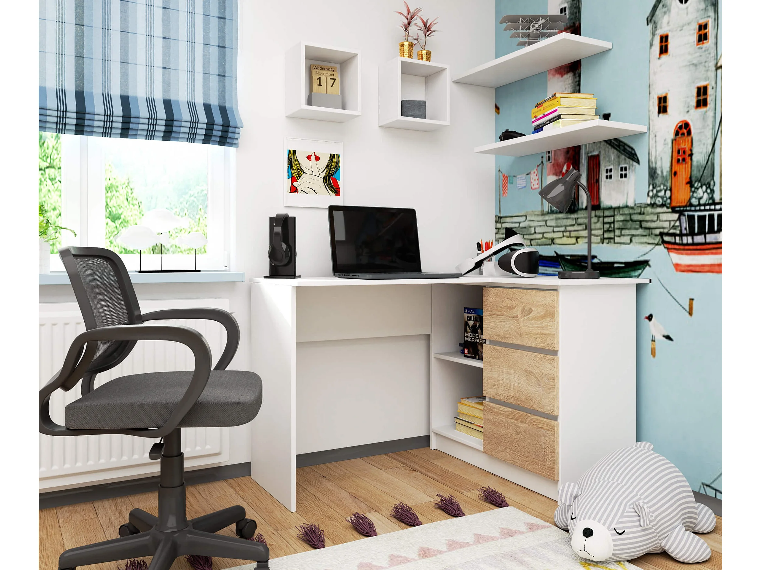 Bureau AKORD d'angle droit B16 Blanc 124 cm 3 tiroirs façade Chêne Sonoma 2 étagères 124x85x77 cm