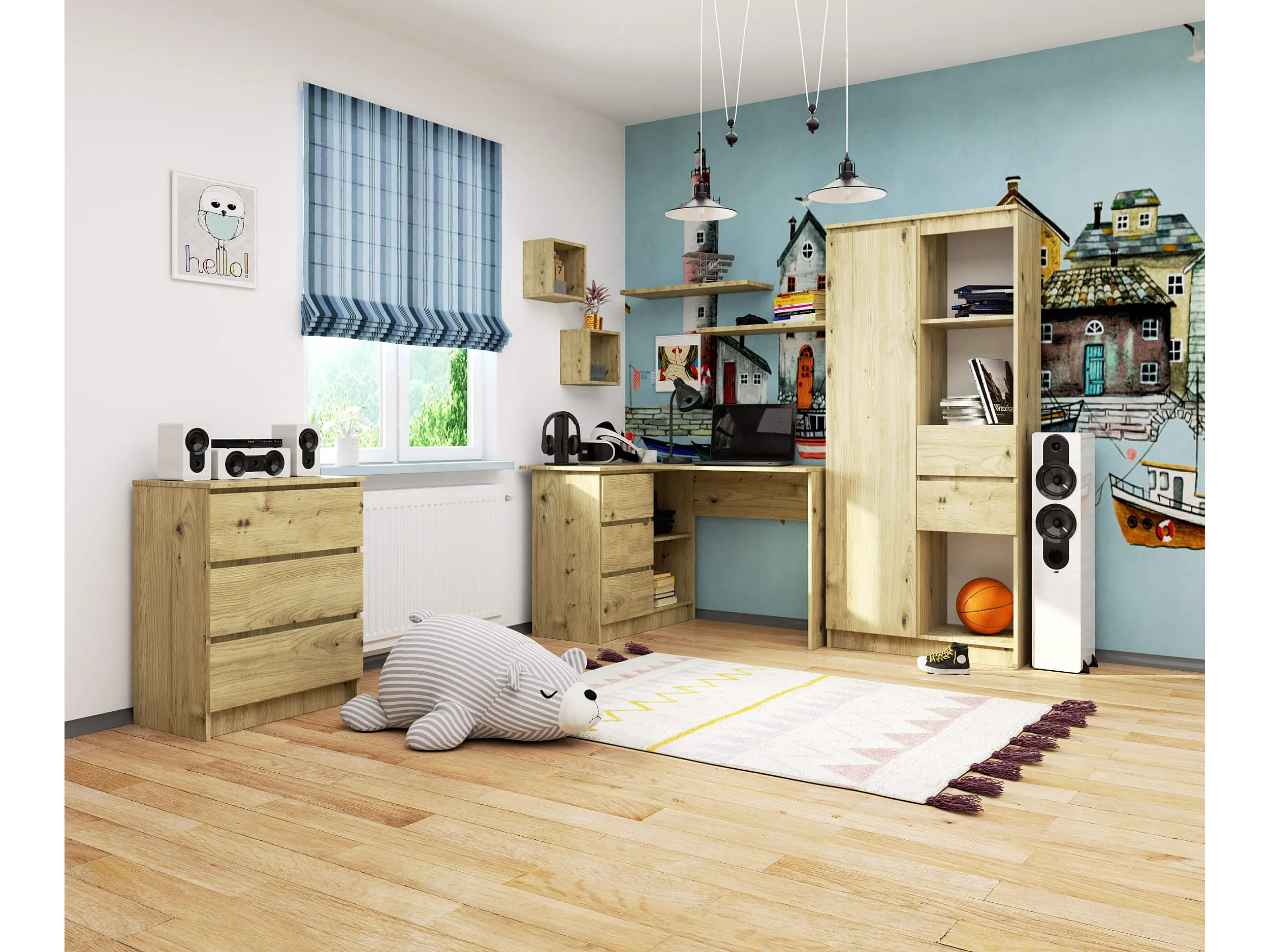 Bureau AKORD d'angle gauche B16 Chêne Artisan 124 cm 3 tiroirs façade Chêne Artisan 2 étagères 124x85x77 cm