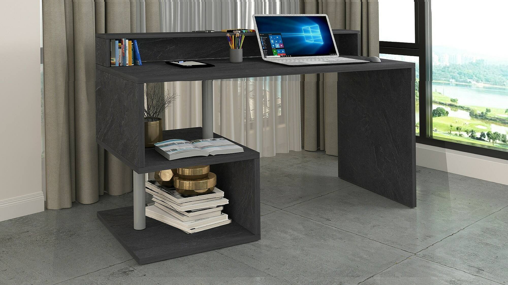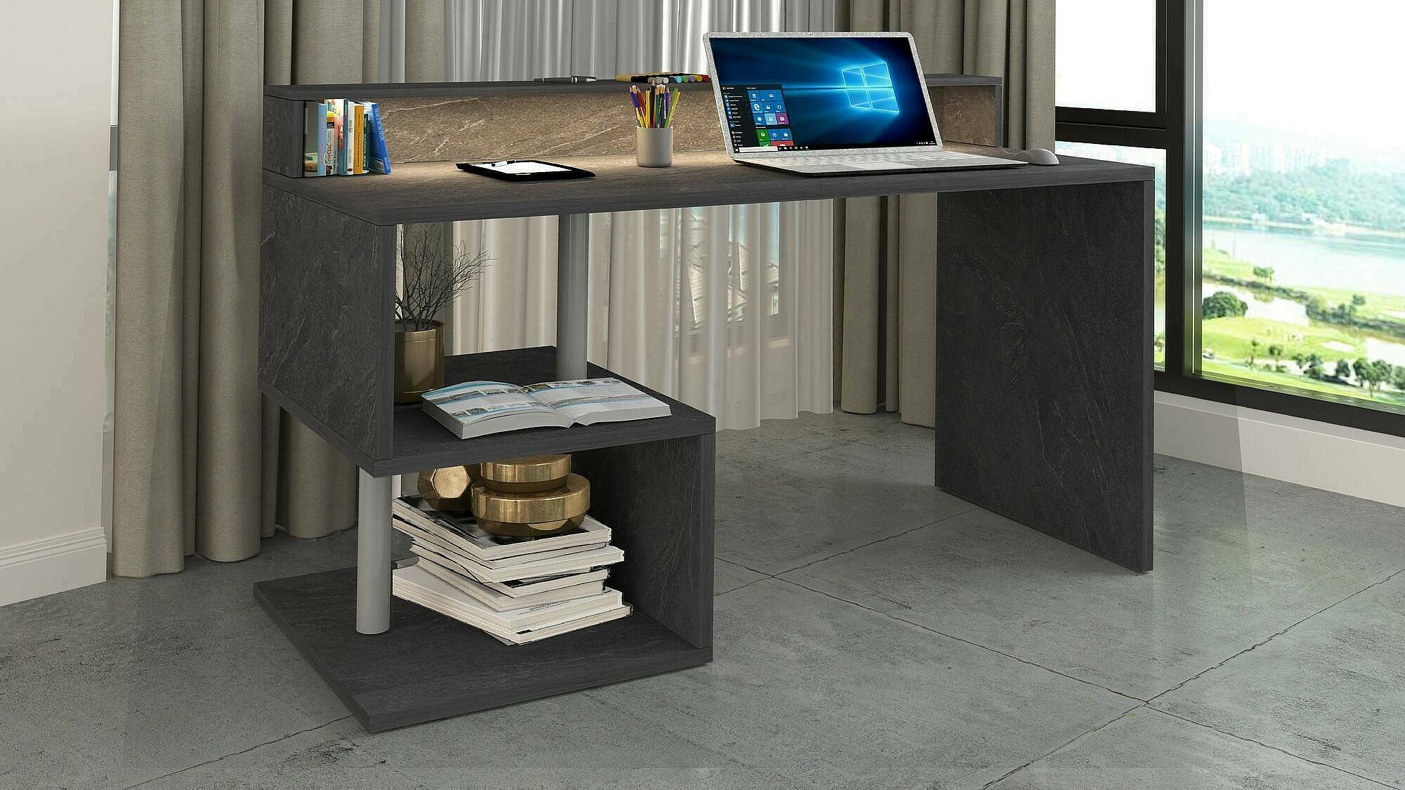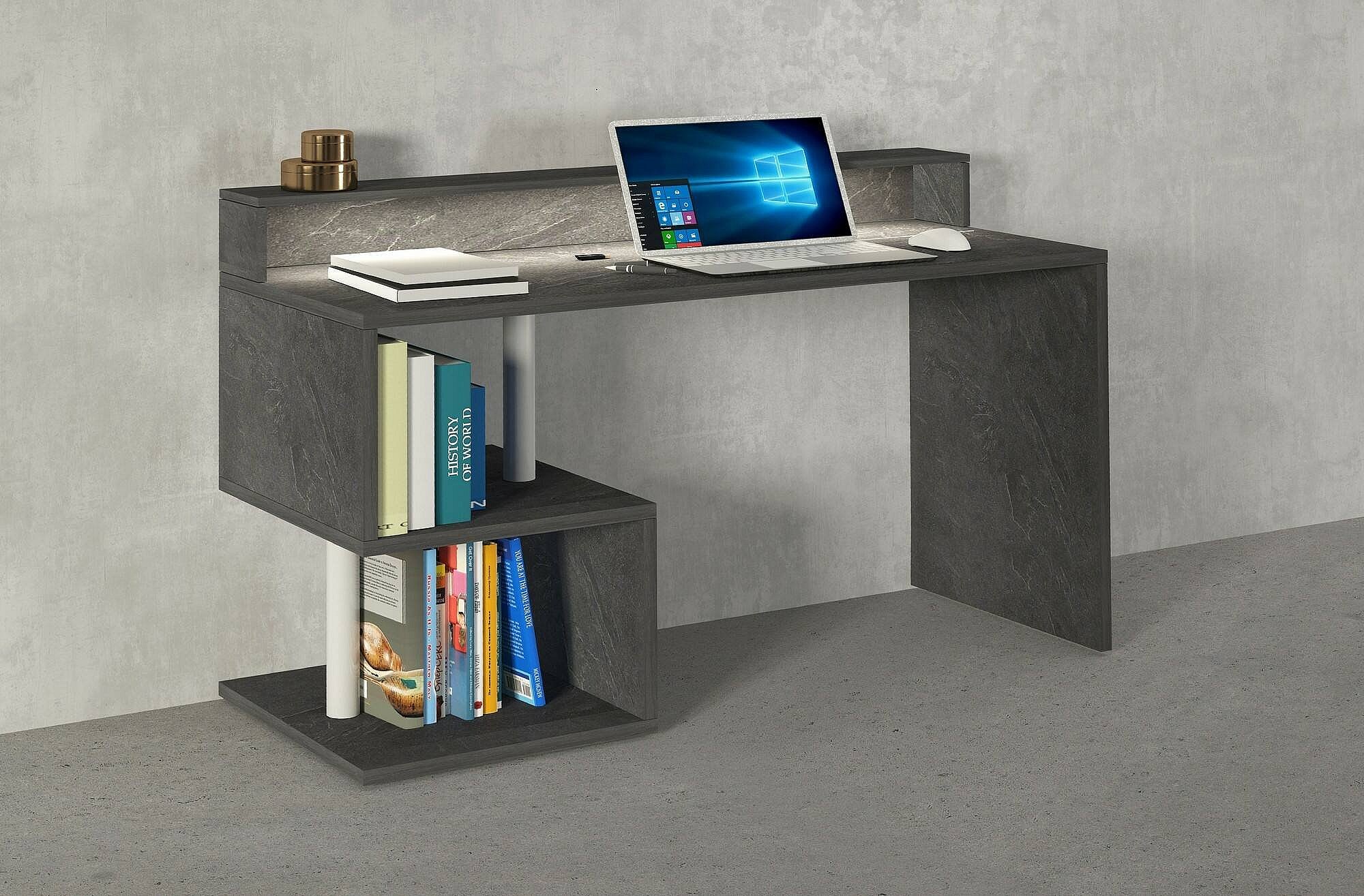 Bureau Silvestro, Bureau linéaire avec étagères de rangement, Bureau polyvalent avec plateau, 140x60h93 cm, Ardoise