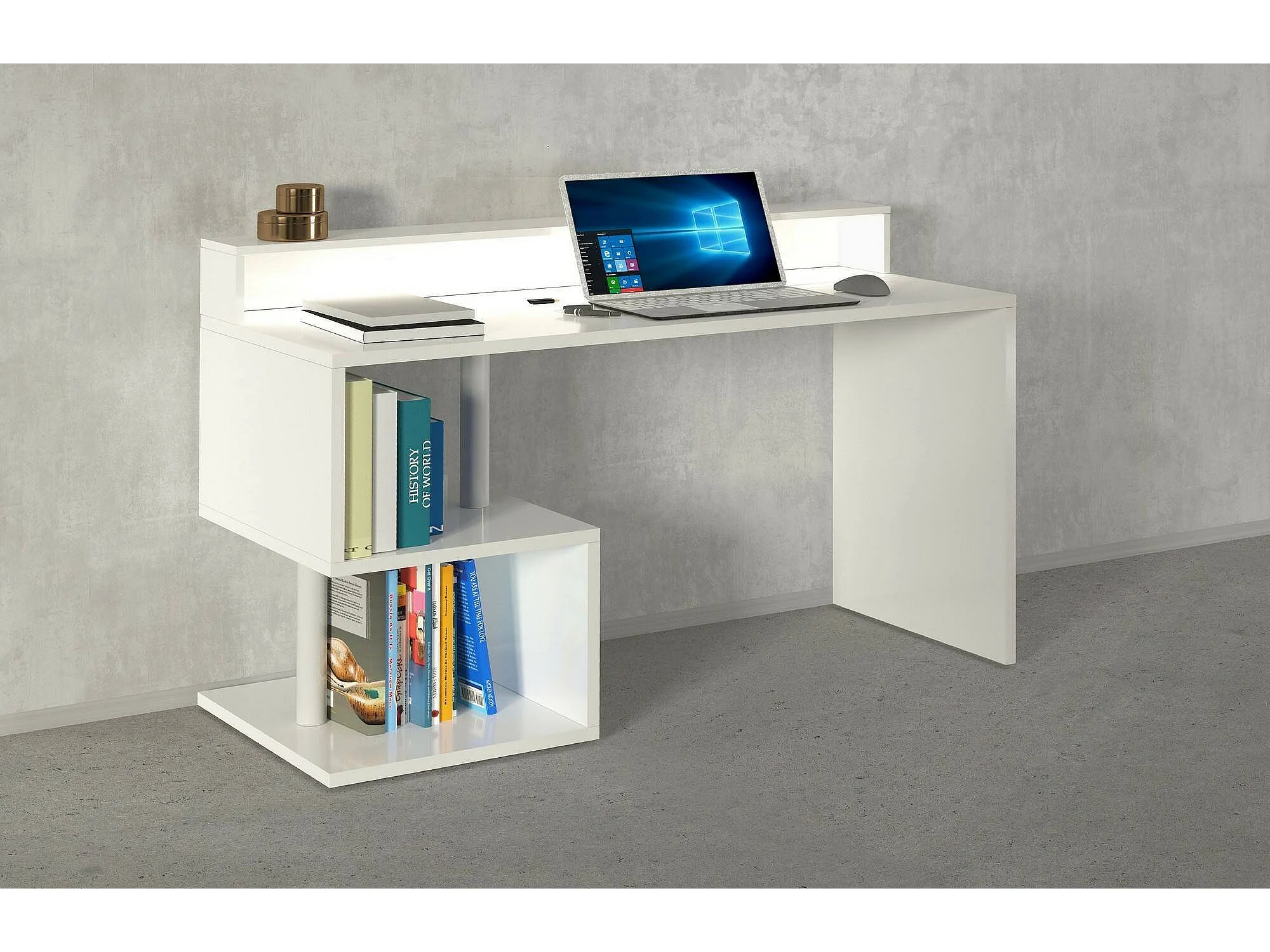 Bureau Alain, Bureau linéaire avec étagères de rangement avec lampes LED, bureau polyvalent avec plateau, 140x60h93 cm, Blanc