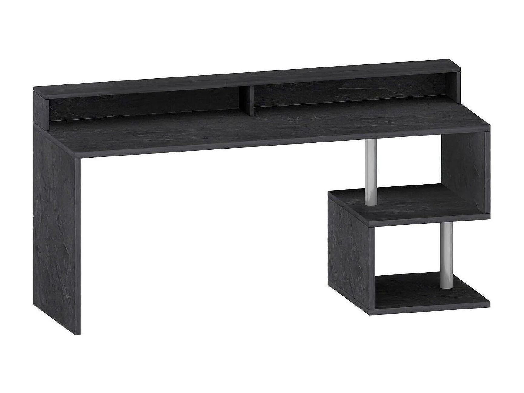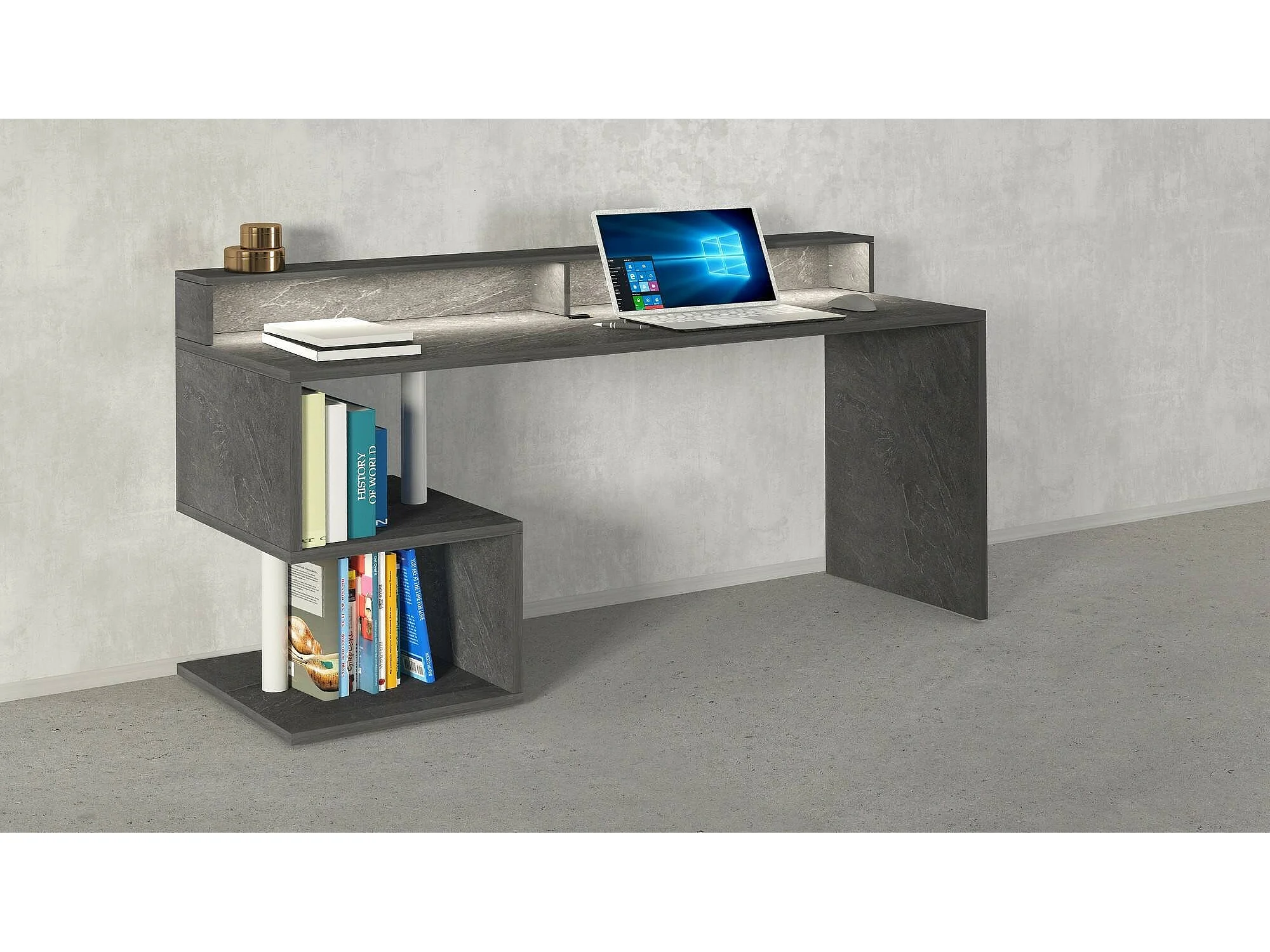 Bureau Alban, Bureau linéaire avec étagères de rangement avec lampes LED, Bureau polyvalent avec plateau, 180x60h93 cm, Ardoise