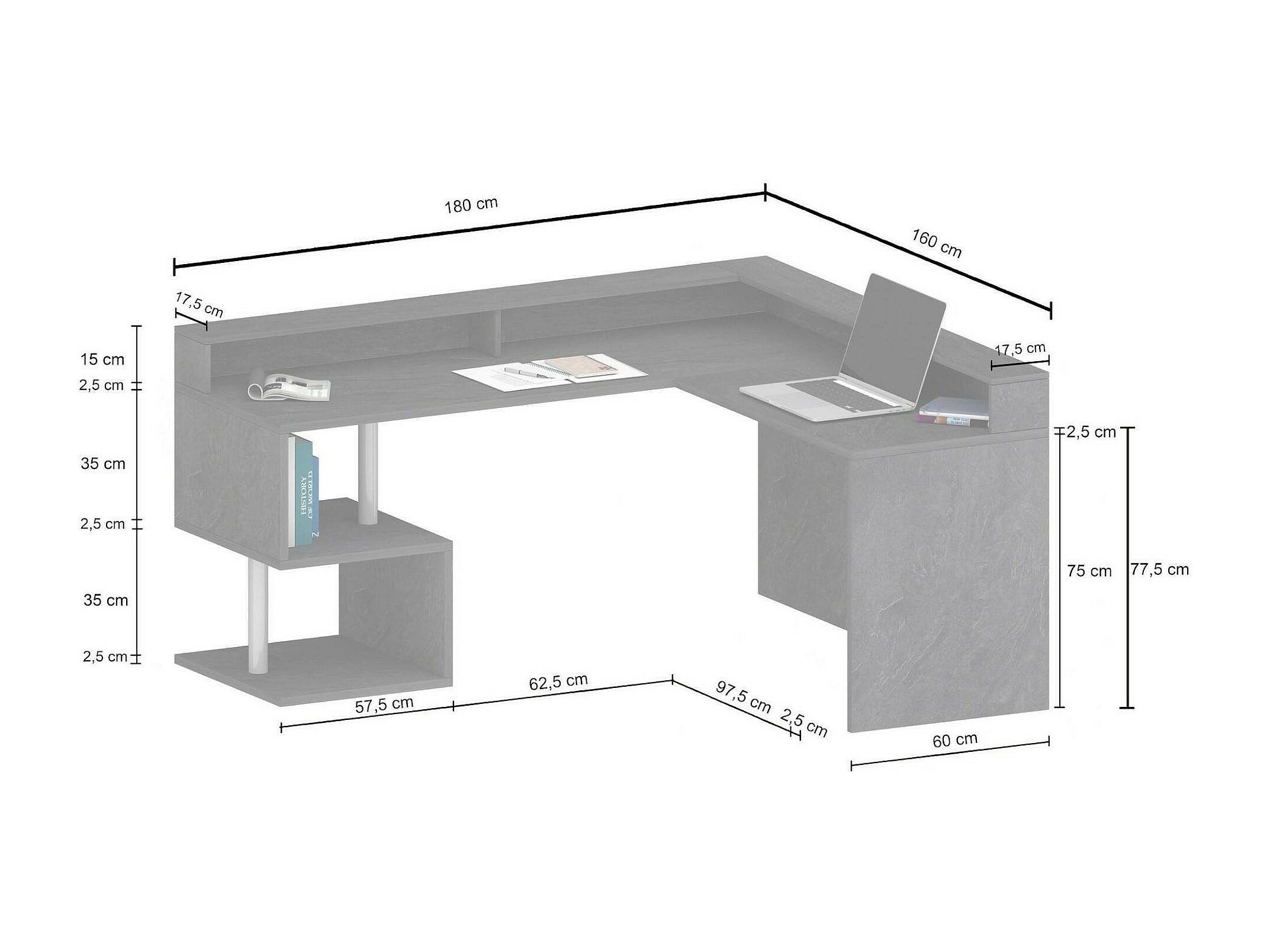 Dcallejo Bureau, Hoekkast met planken en werkblad, Multifunctionele Bureautafel, Ruimtebesparend Bureau, 100% Made in Italy, 70x57h140 cm, Wit en Leisteen