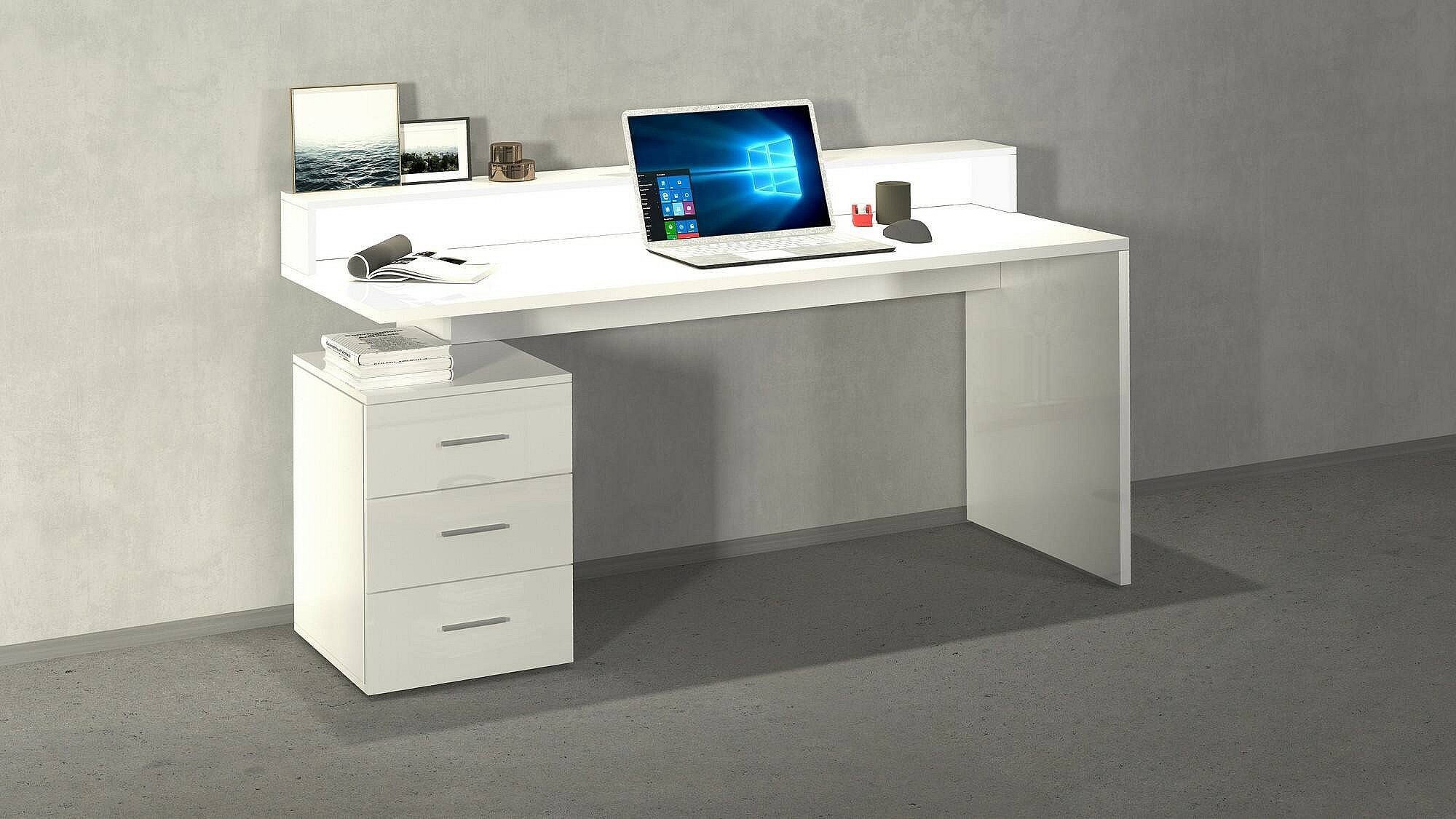 Bureau Alexandre, Bureau avec plateau et lampes LED, Bureau polyvalent, Bureau gain de place multi-positions, 160x60h90 cm, Blanc