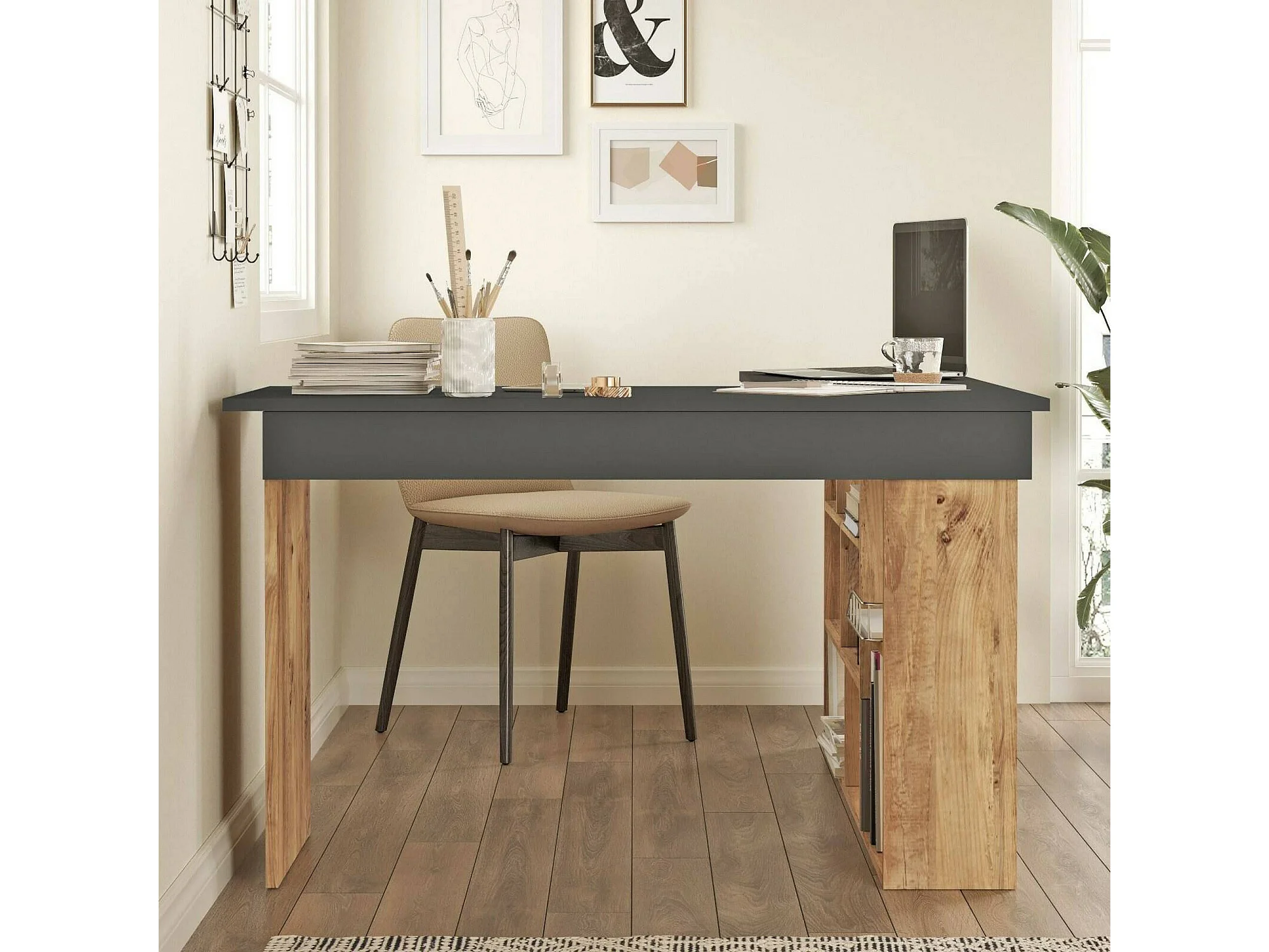 Bureau Angete, Pupitre polyvalent, Table de bureau pour PC, Plan de travail, 129x120h72 cm, Chêne et Noir