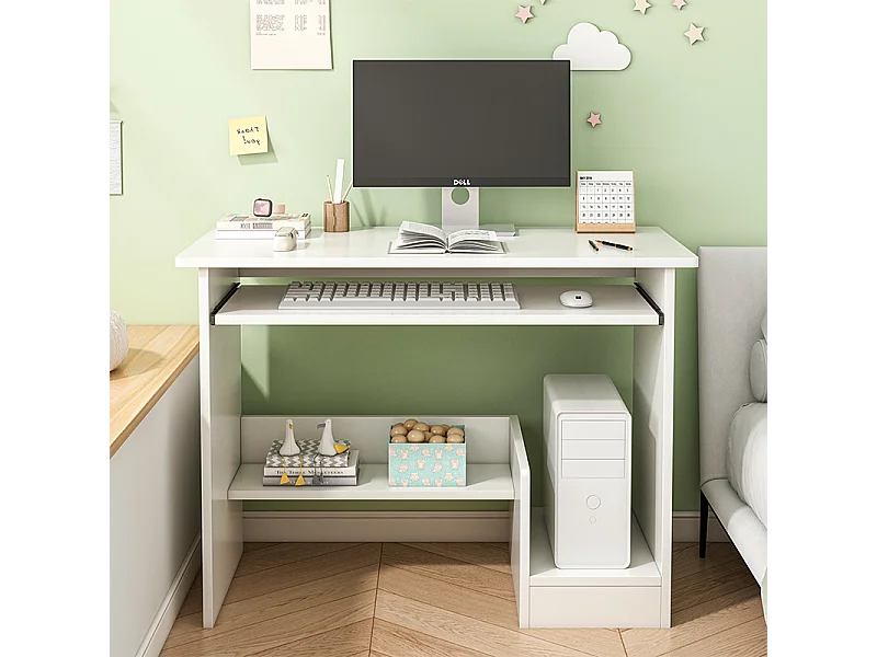 Bureau informatique blanc scandinave 100 cm avec grandes étagères intégrées, design moderne et ergonomique