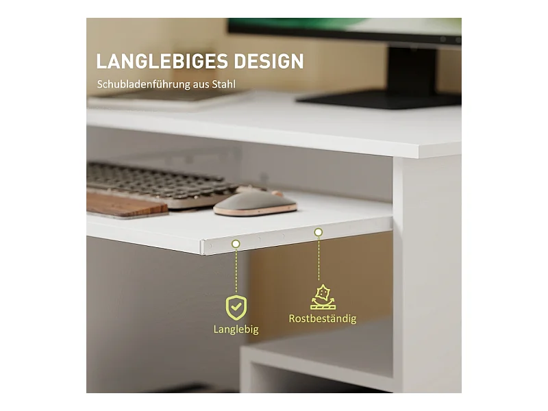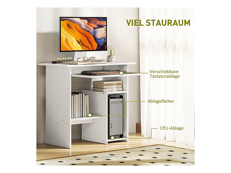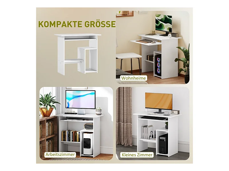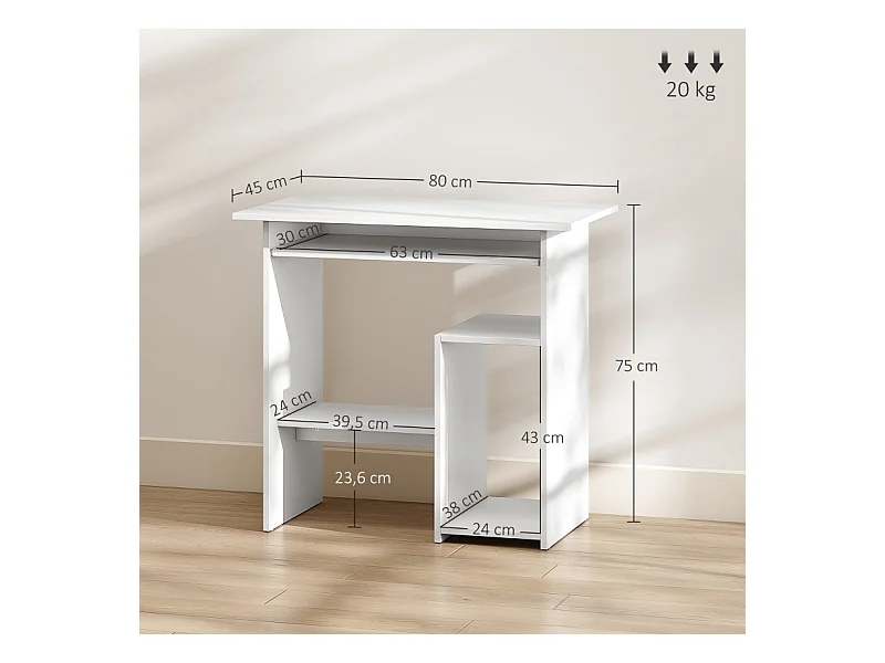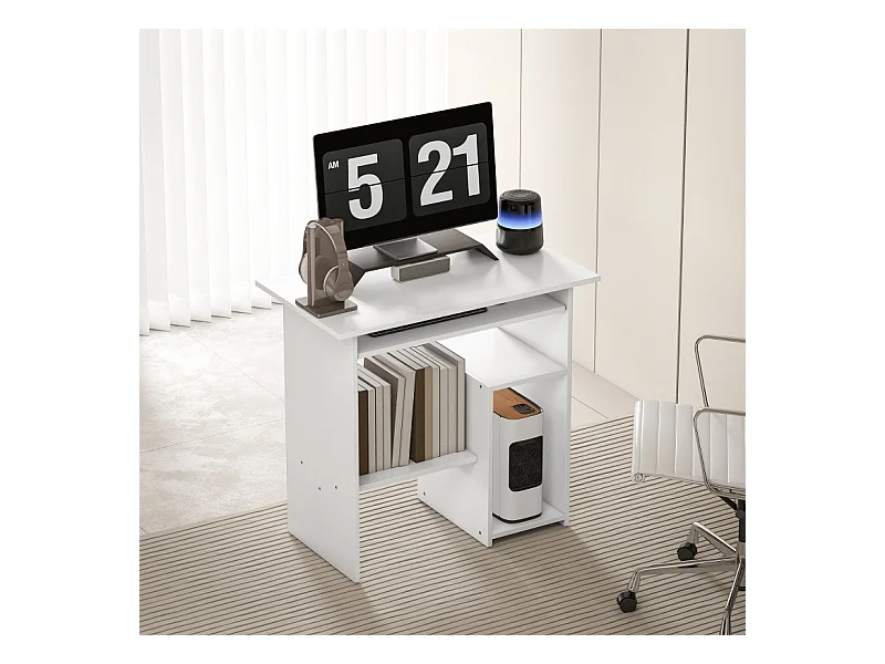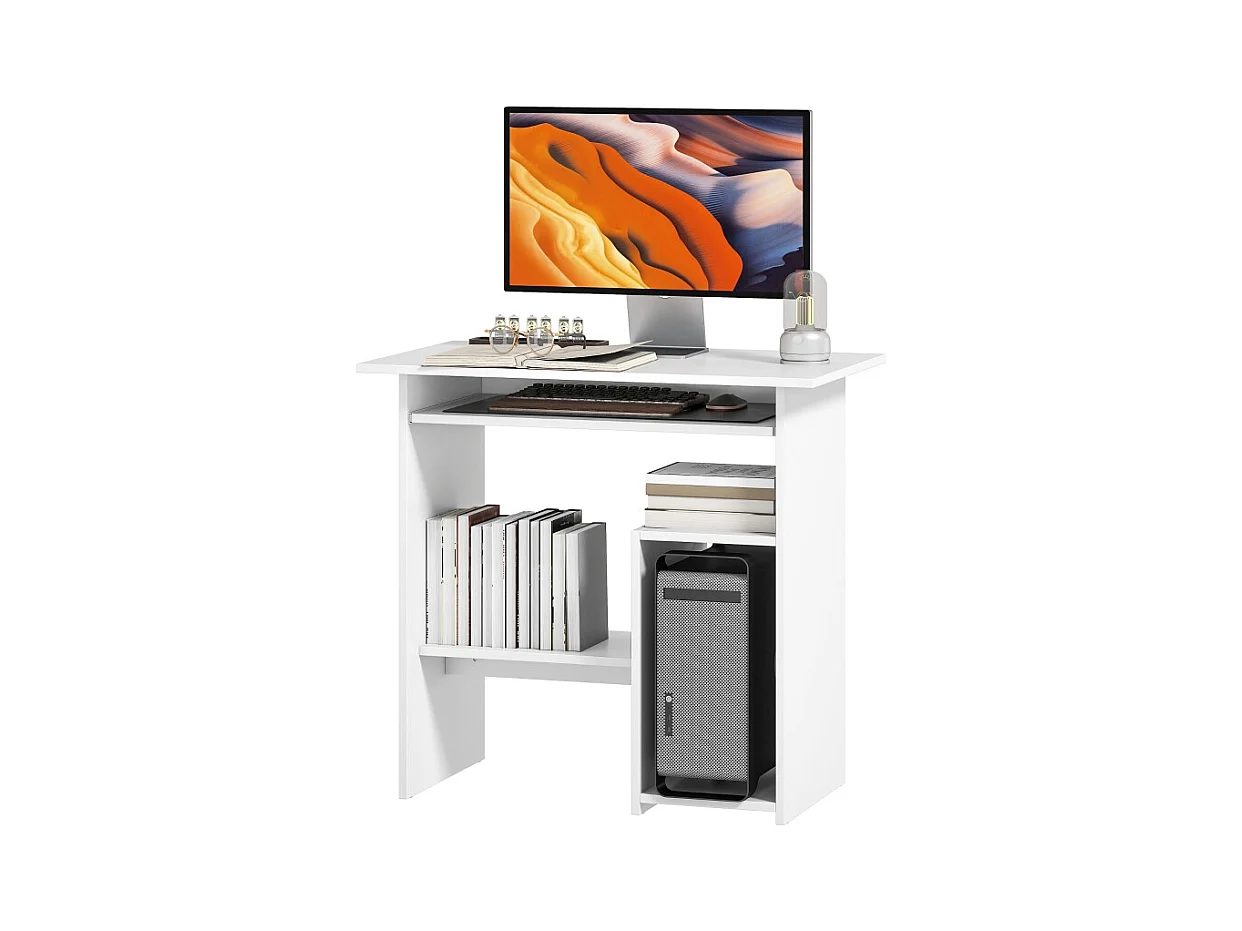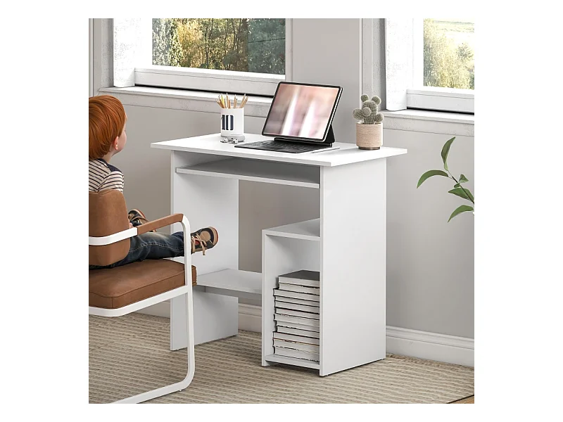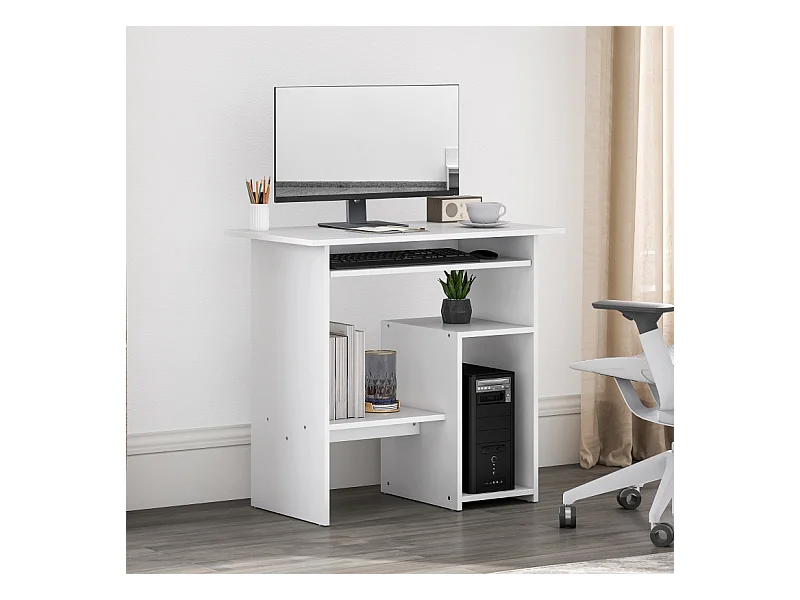 Bureau compact avec tablette clavier et rangements ouverts, panneau mélaminé, blanc, résistant et fonctionnel (80x45x75cm)