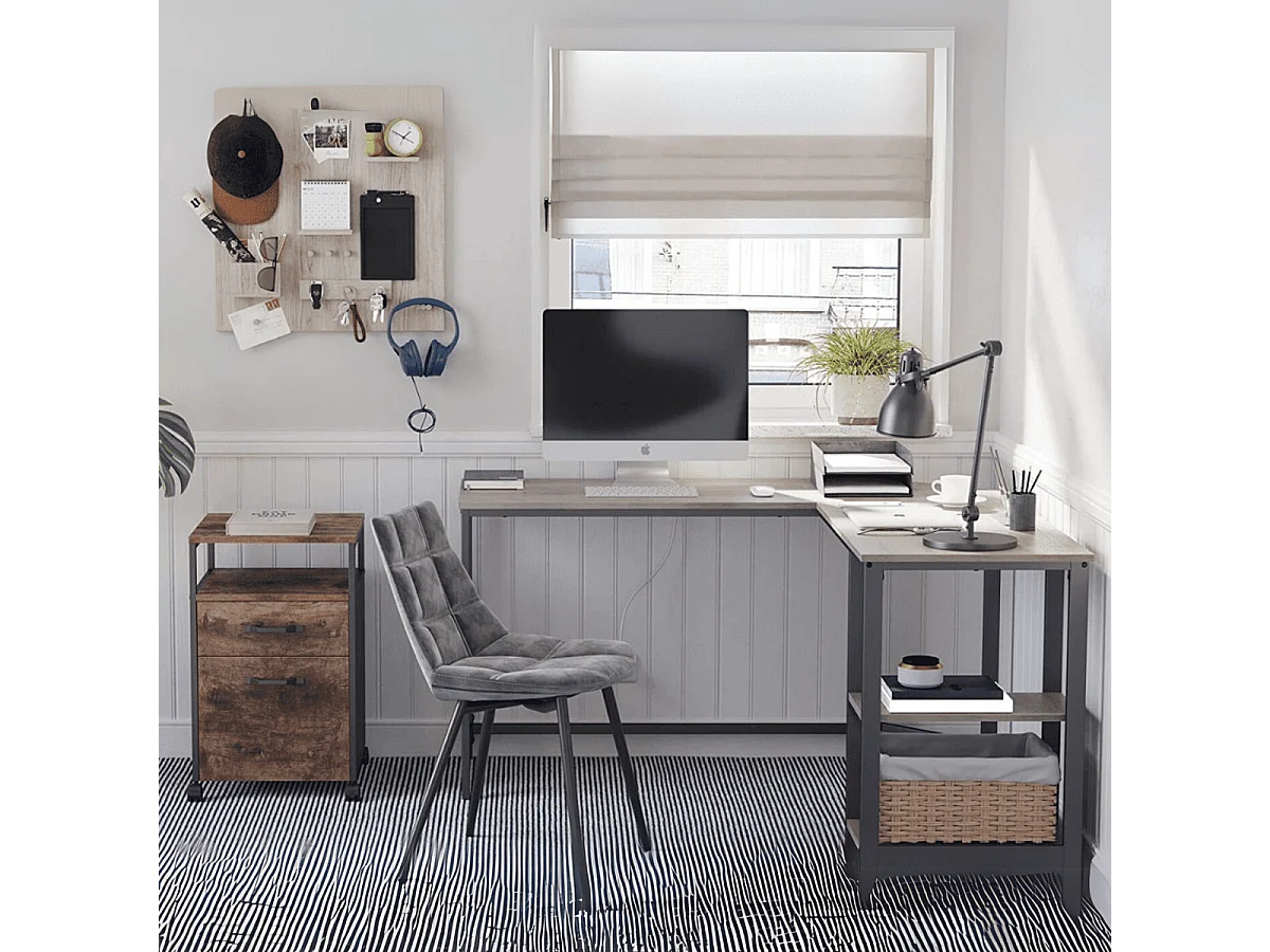 Bureau d'angle droit avec étagère 2 niveaux style industriel