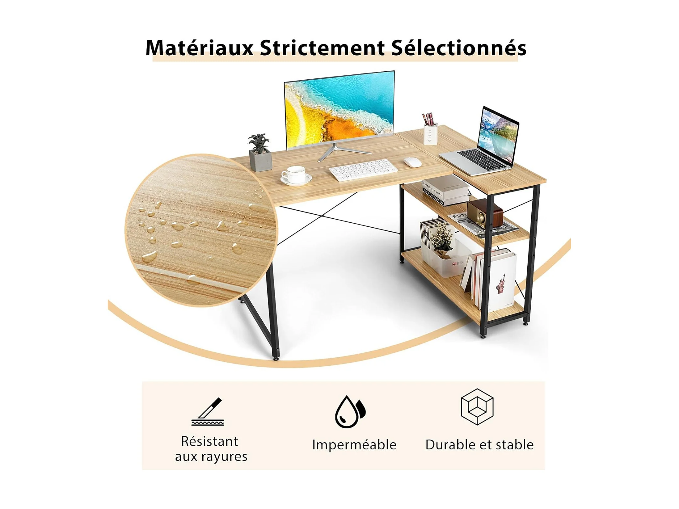 Bureau d'angle en Forme L Réversible, Poste de Travail avec Étagères de Rangement, 120 x 88 x 74,5 cm, Peu Encombrant, pour Maison, Bureaux (Naturel)