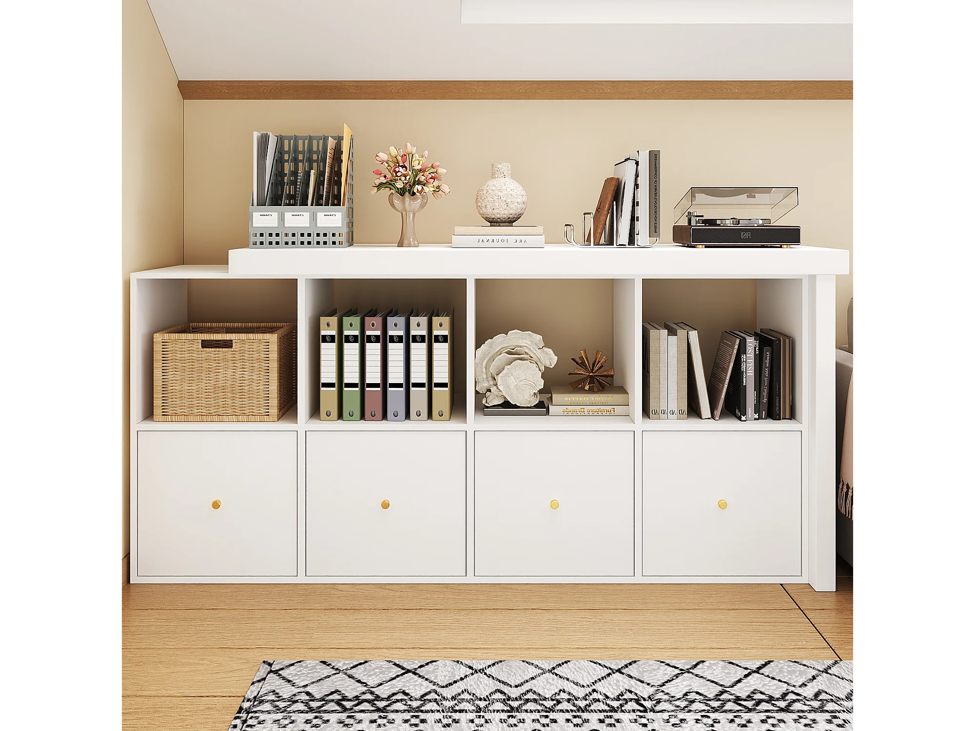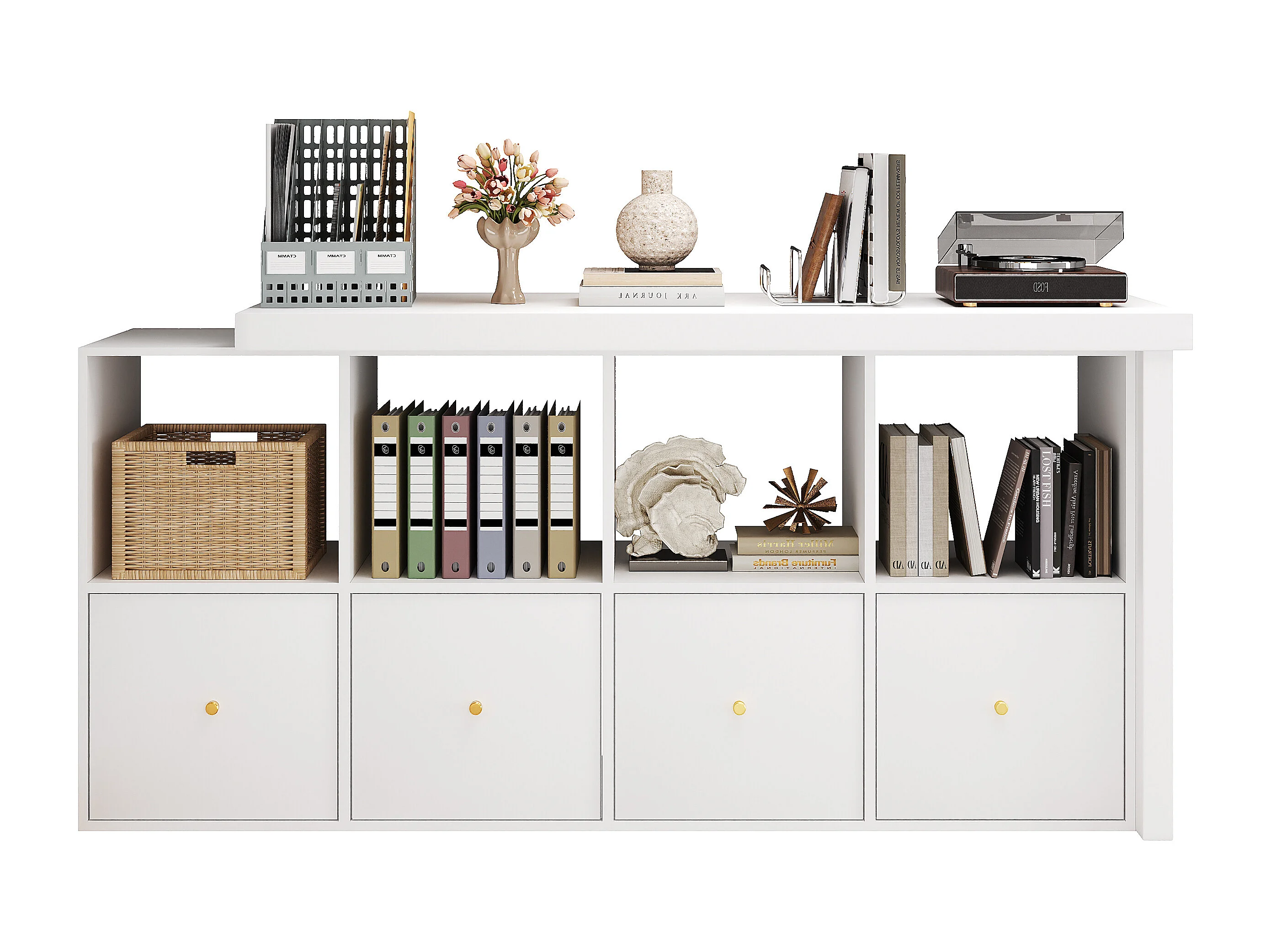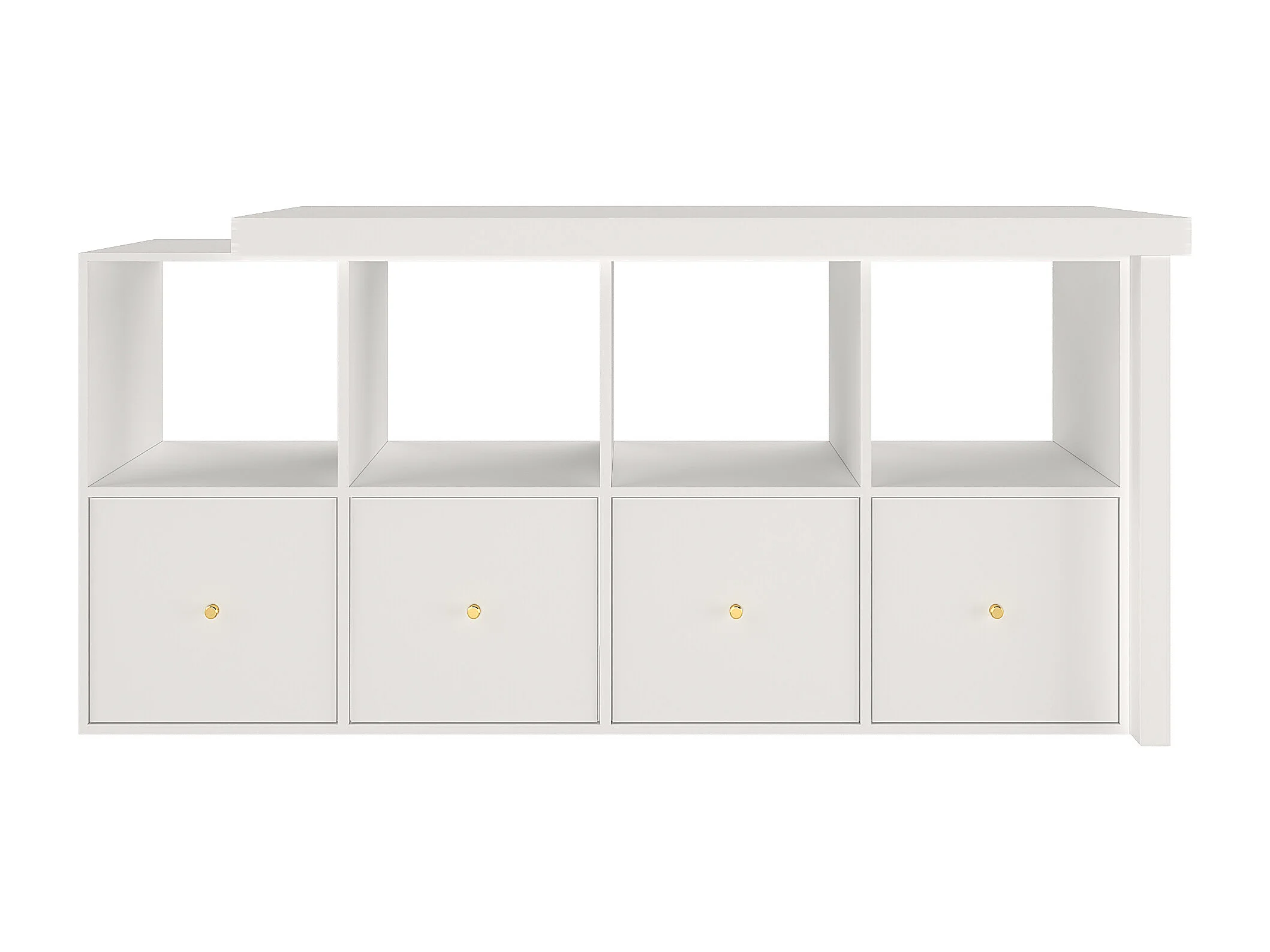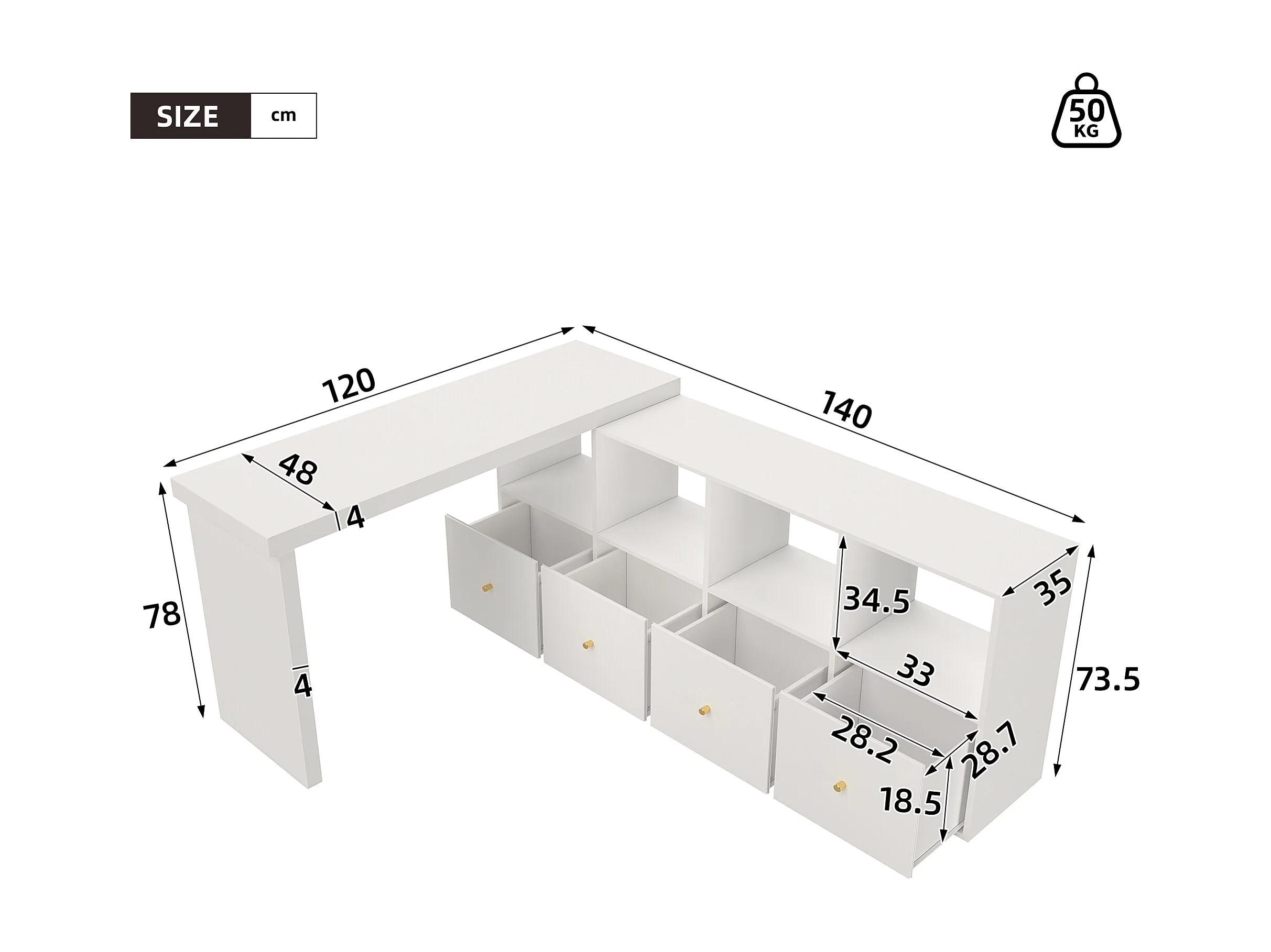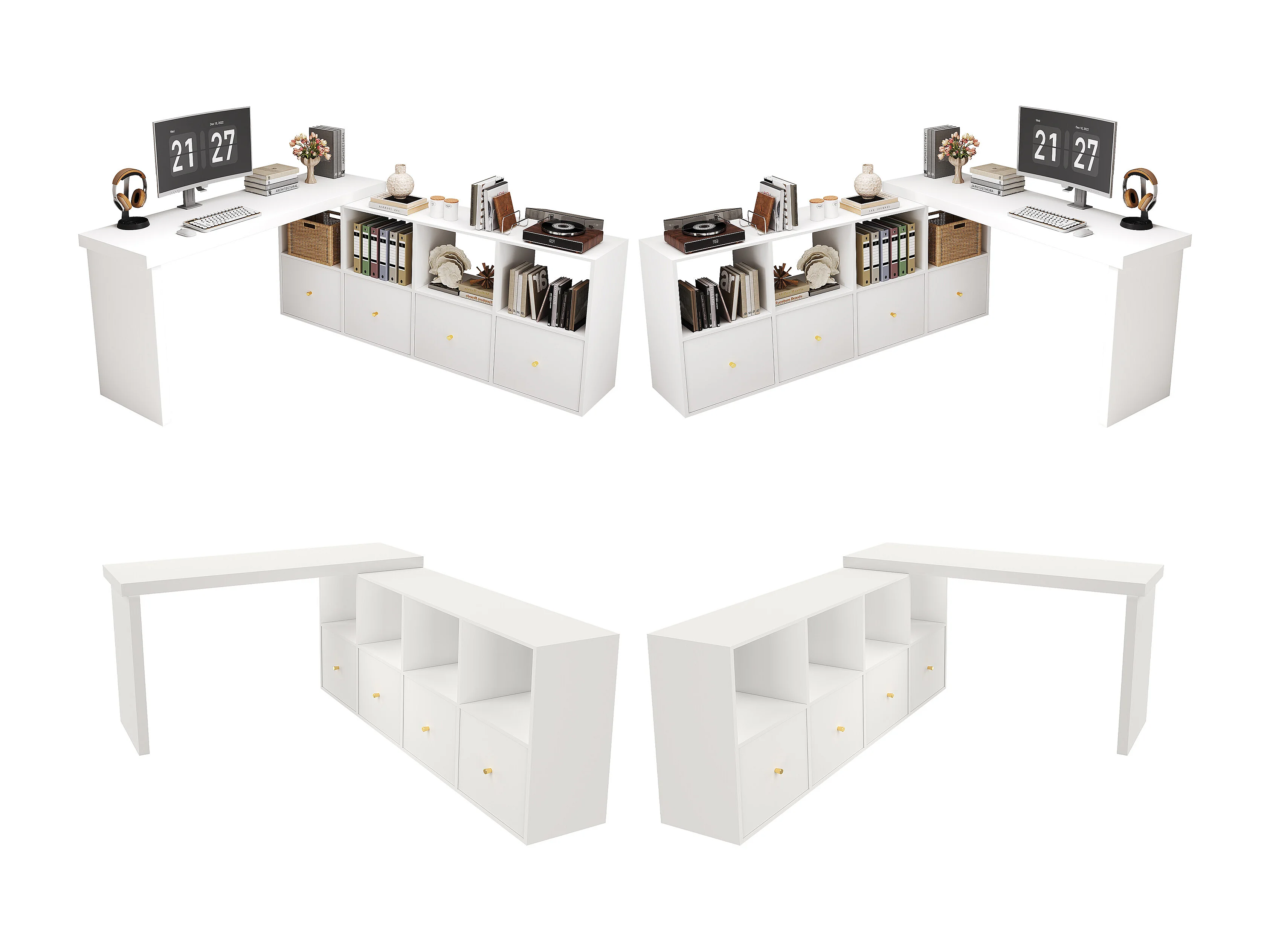 Bureau d'angle plateau pivotant à 360° - 140 x 120 x 78 cm - en L ou droite - avec 4 étagères + 4 tiroirs - MDF - blanc