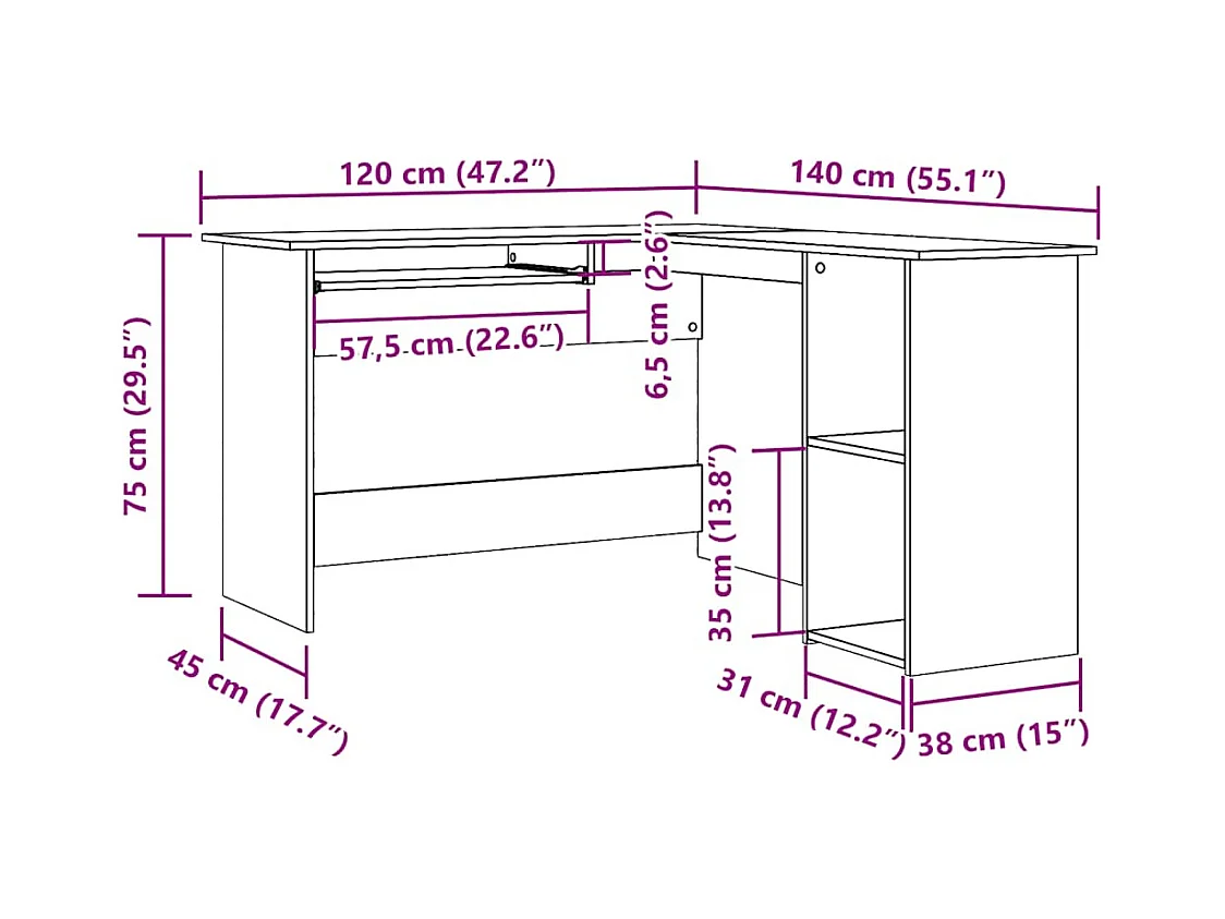 Bureau d'angle chêne artisanal 120x140x75 cm bois d'ingénierie