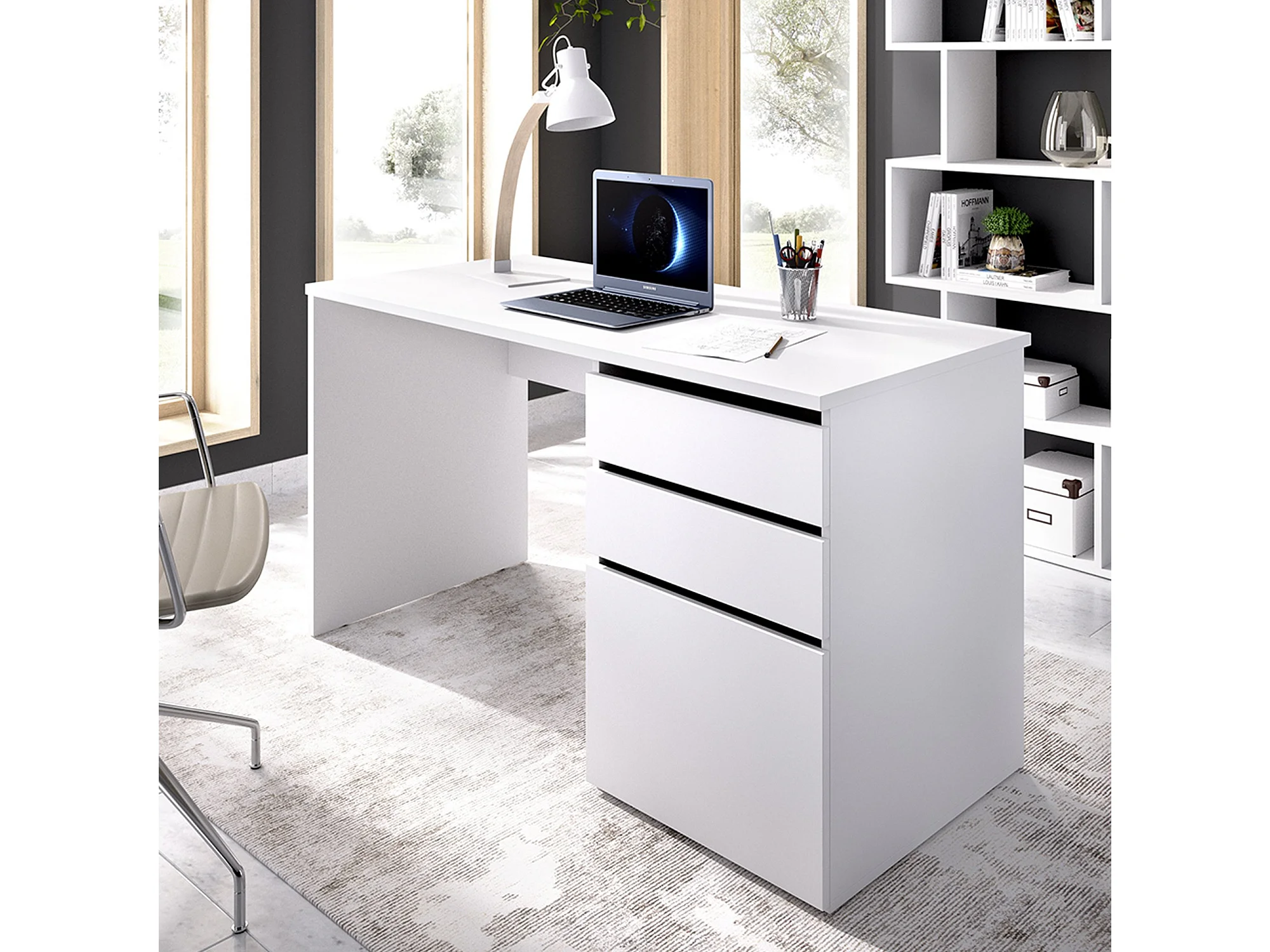 Bureau Dgabbi, Bureau polyvalent pour le bureau ou la chambre, Table d'étude linéaire avec 2 tiroirs et 1 porte, 139x60h75 cm, Blanc