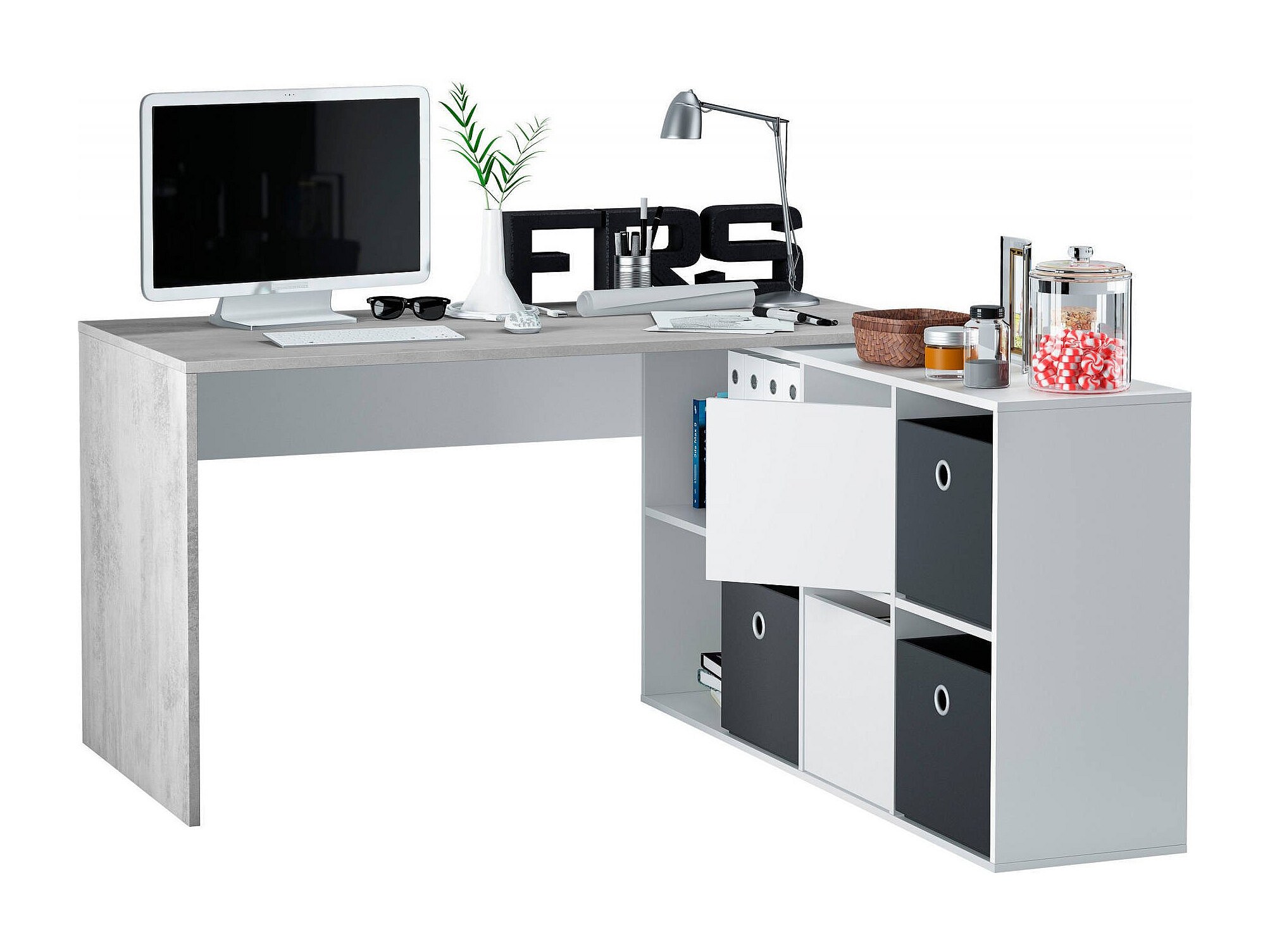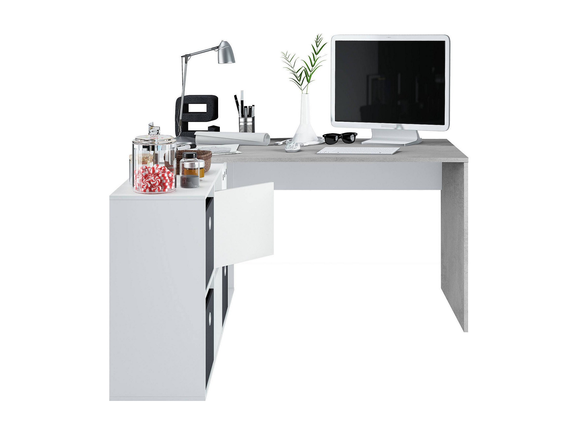 Bureau Dmorlup, Bureau multi-positions réversible multifonction, Table d'étude ou de bureau pour PC avec étagère, 136x139h74 cm, Blanc et Ciment