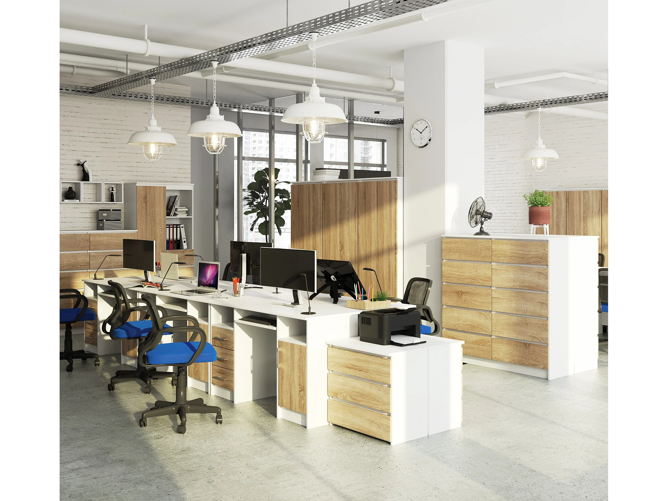 Bureau d'ordinateur AKORD ANA Blanc 124 cm 1 porte 3 tiroirs façade Chêne Sonoma 5 étagères 124x52x74 cm