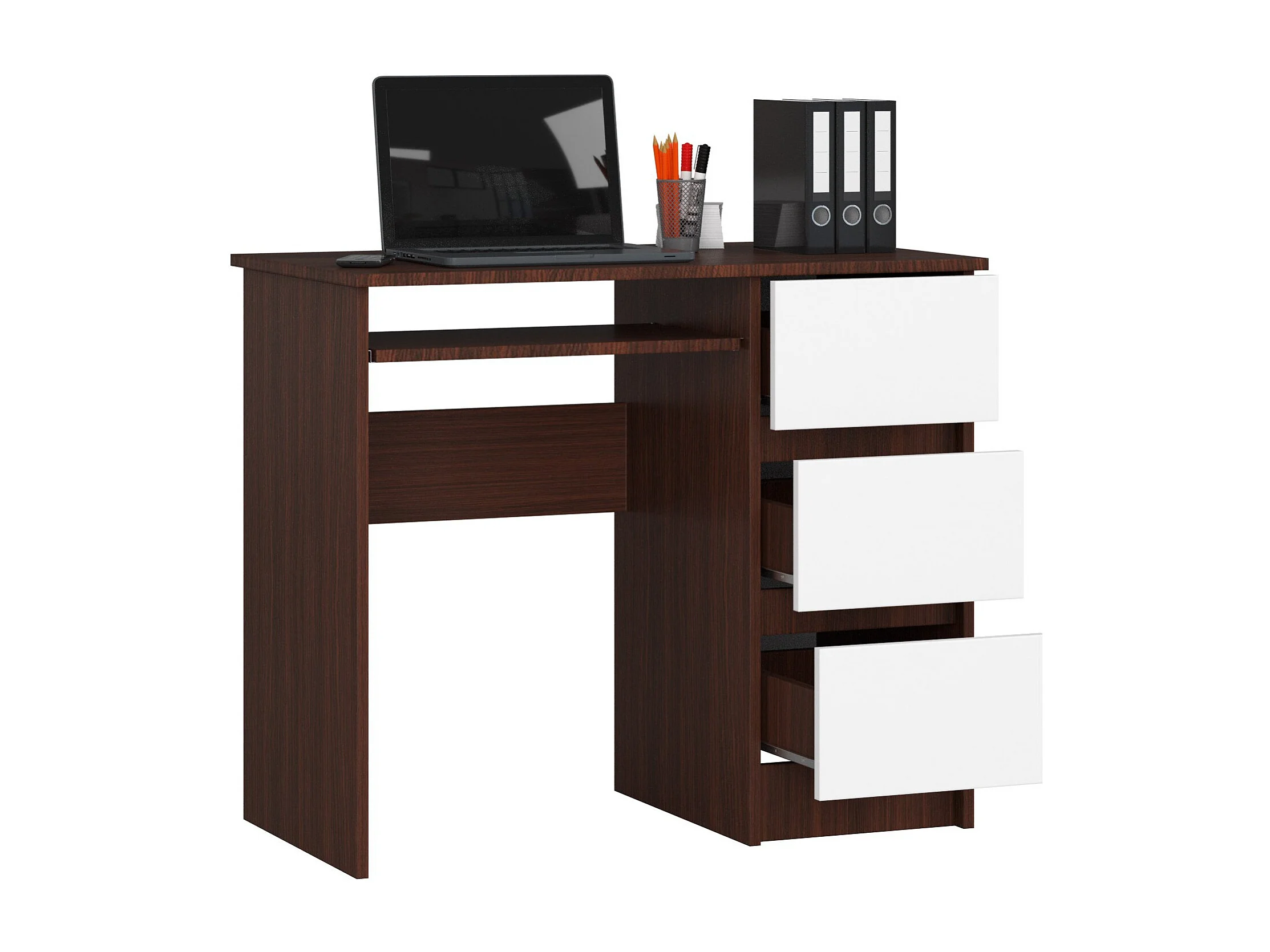 Bureau d'ordinateur AKORD droit A6 Wengé 90 cm 3 tiroirs façade Blanche 1 étagère 90x50x77 cm