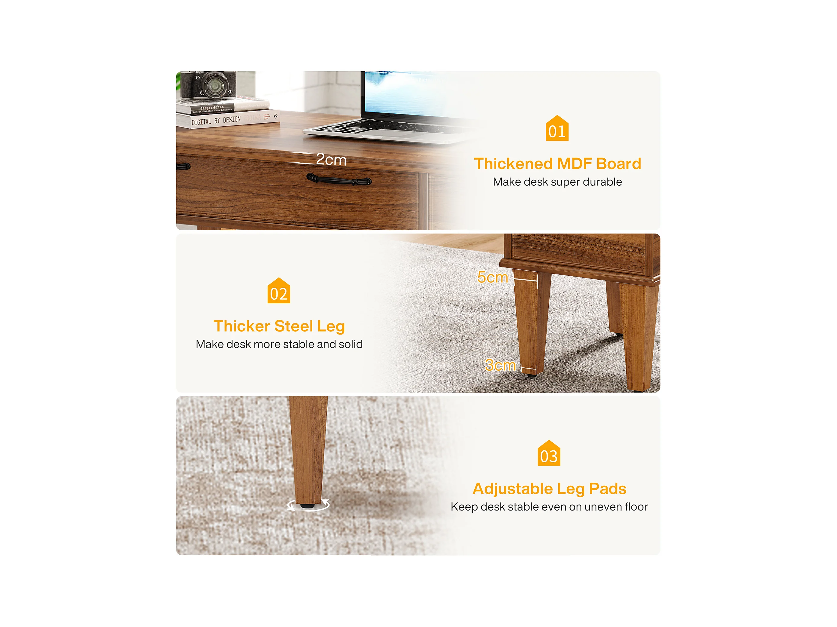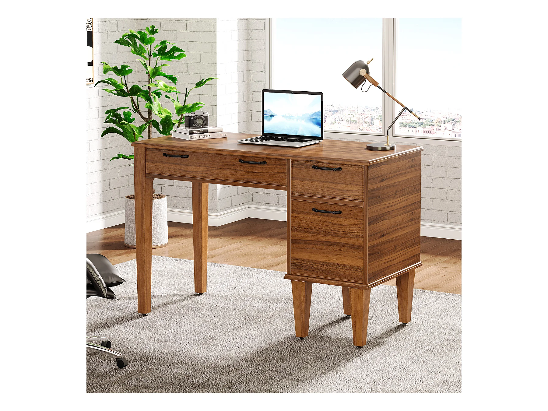 Bureau d'ordinateur en bois avec 3 tiroirs, petit bureau de style campagnard avec tiroirs classeurs