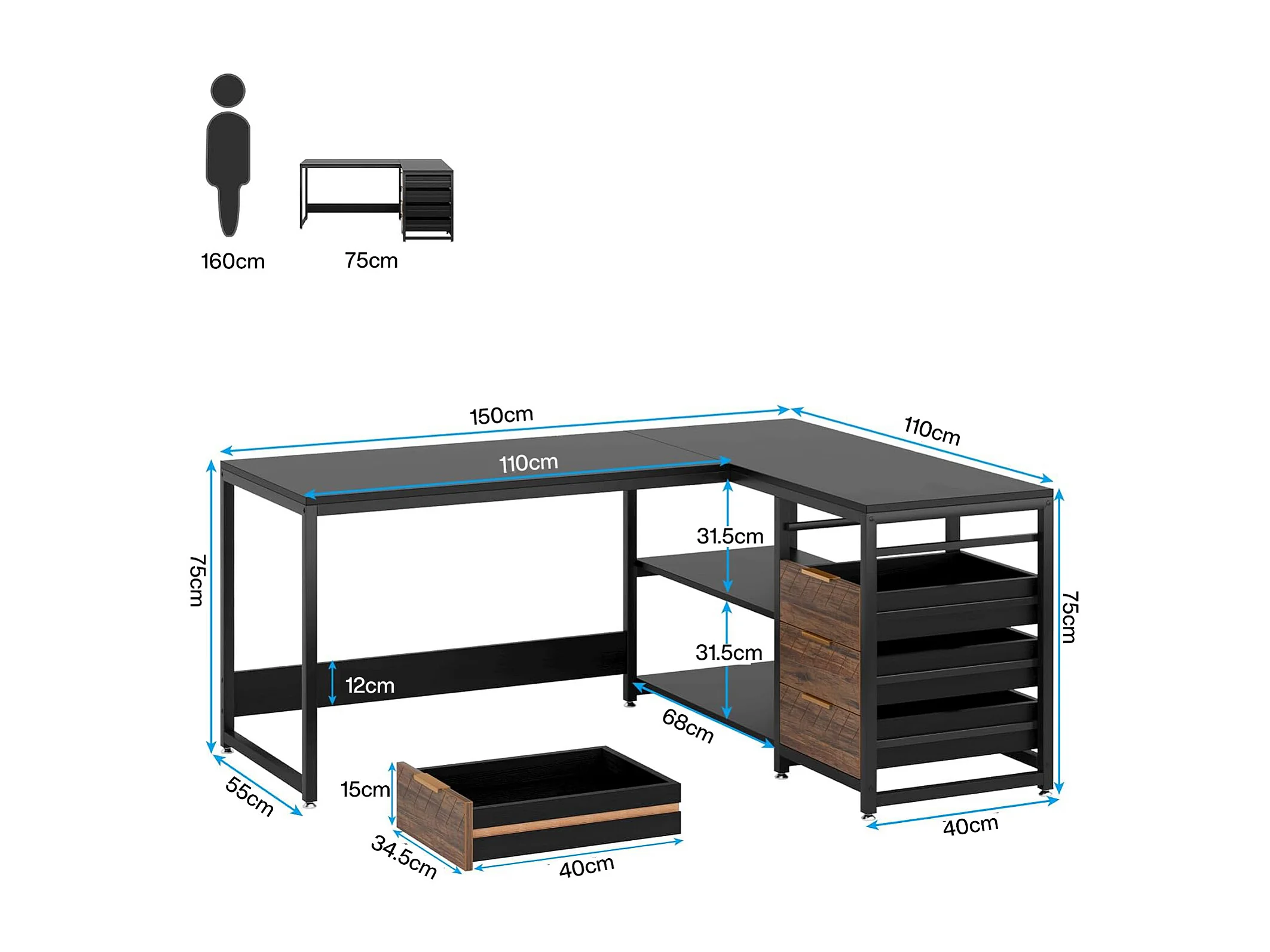 Bureau d'ordinateur en forme de L avec tiroirs de rangement, bureau réversible en forme de L
