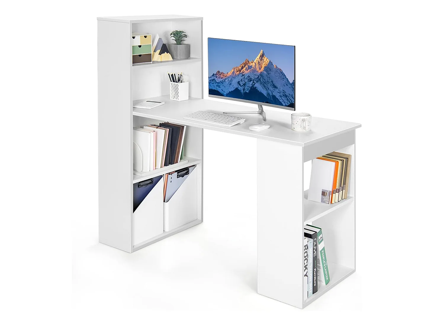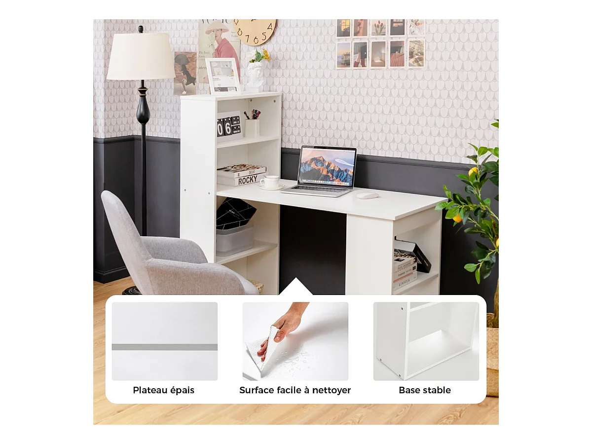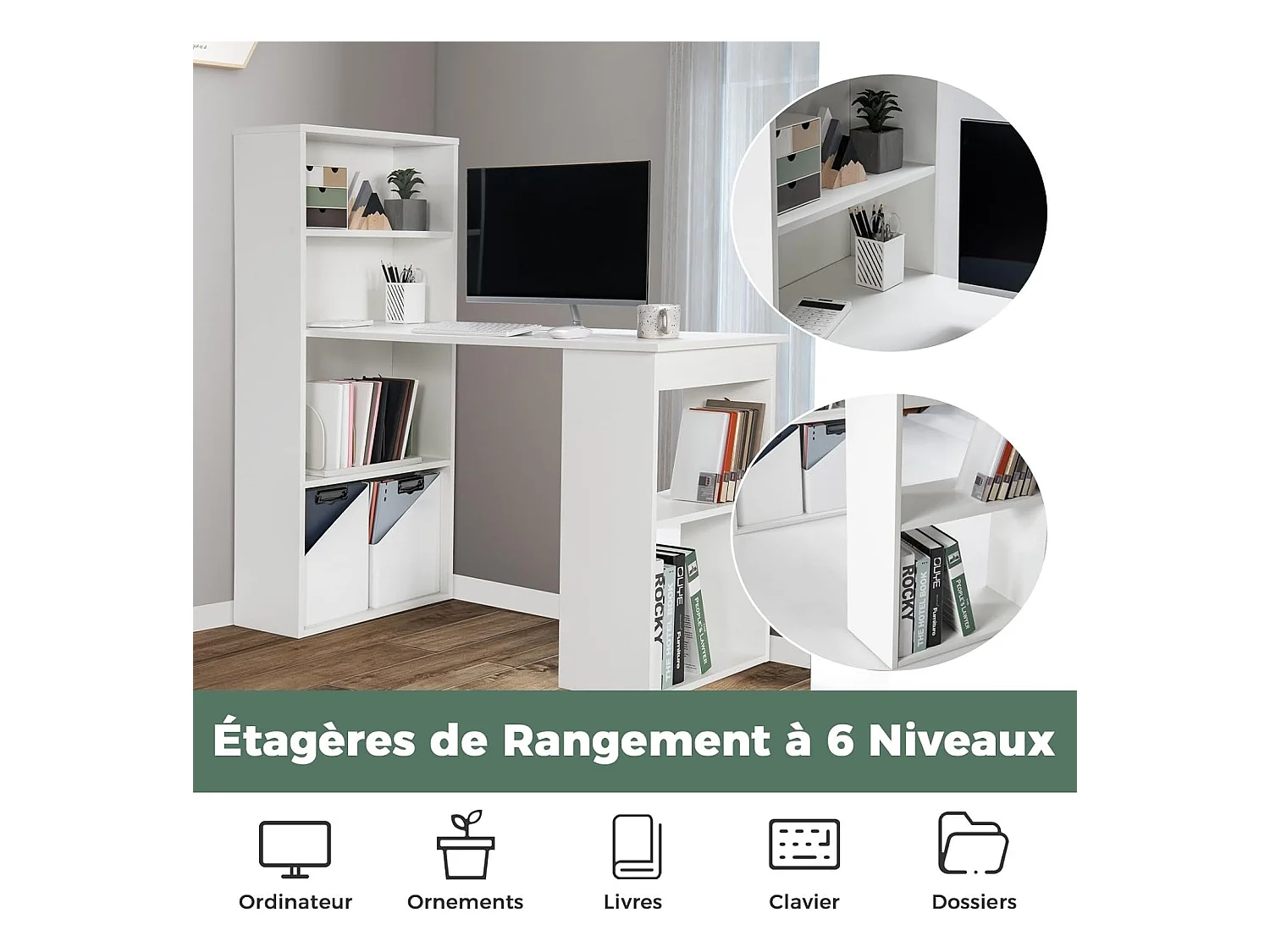 Bureau d'Ordinateur Réversible avec Bibliothèque, Poste de Travail Moderne avec Étagères de Rangement à 6 Niveaux, Assemblage Facile, pour Maison, Bureaux (Blanc)