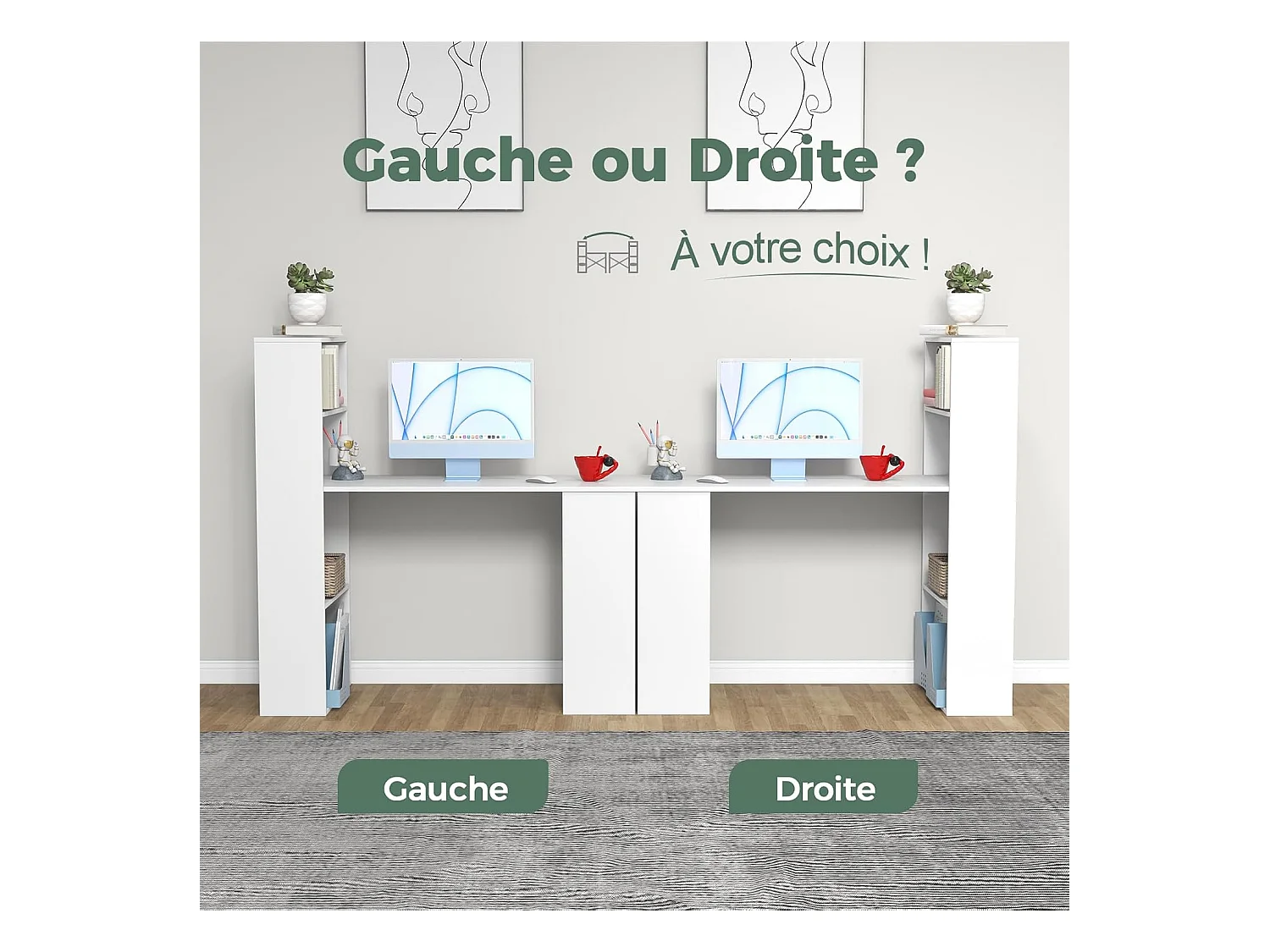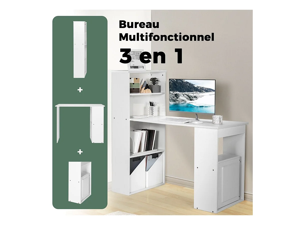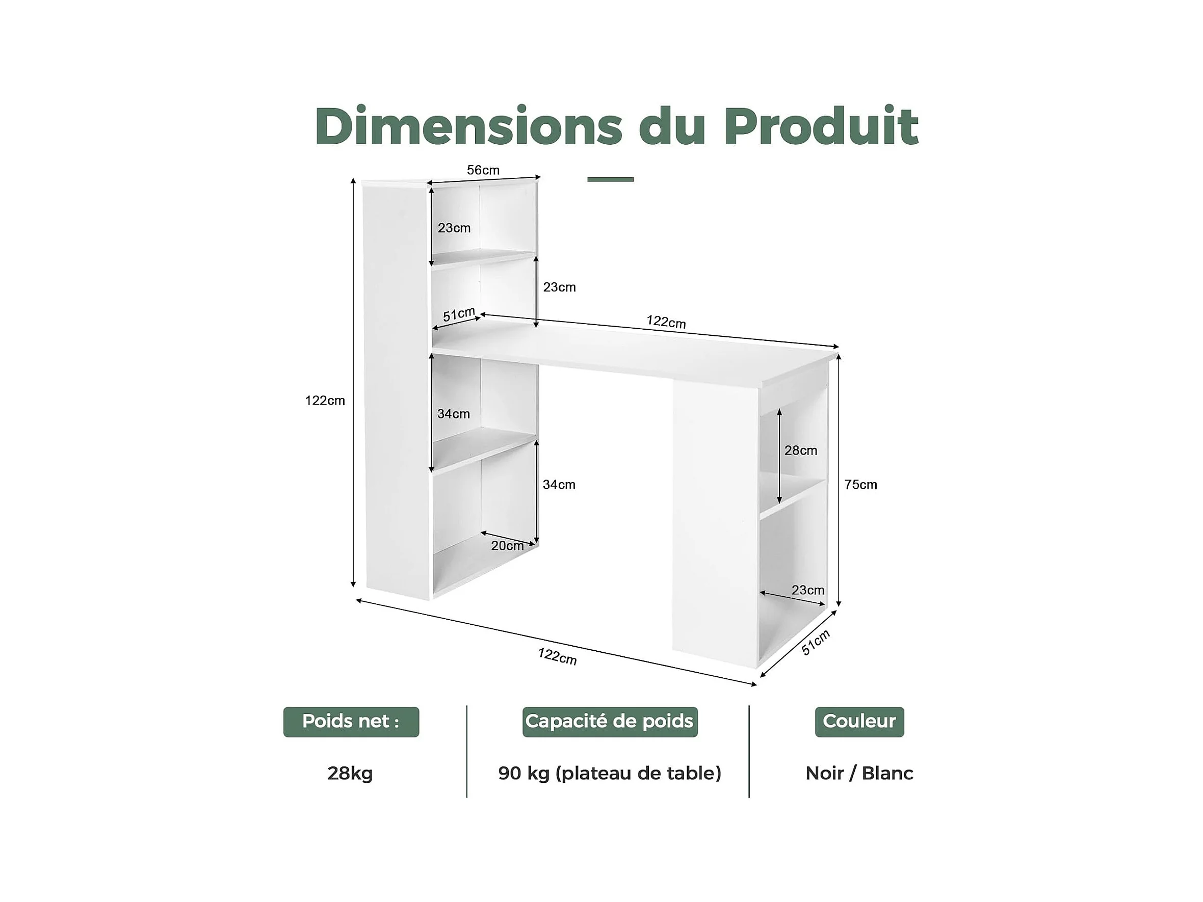 Bureau d'Ordinateur Réversible avec Bibliothèque, Poste de Travail Moderne avec Étagères de Rangement à 6 Niveaux, Assemblage Facile, pour Maison, Bureaux (Blanc)