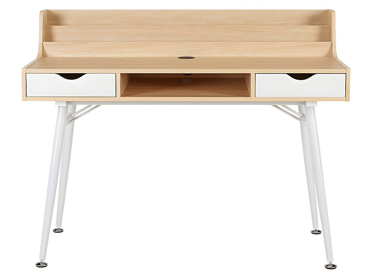 Avec le bureau LARCOS, organisez vous un espace de travail ultra-cosy ! Grâce à ses rangements verticaux, vous pourrez avoir vos documents sous les yeux. Ses 2 tiroirs et sa niche vous offrent des espaces de rangement supplémentaires. Son coloris chêne et blanc et son aspect épuré lui donne un look contemporain et scandinave.