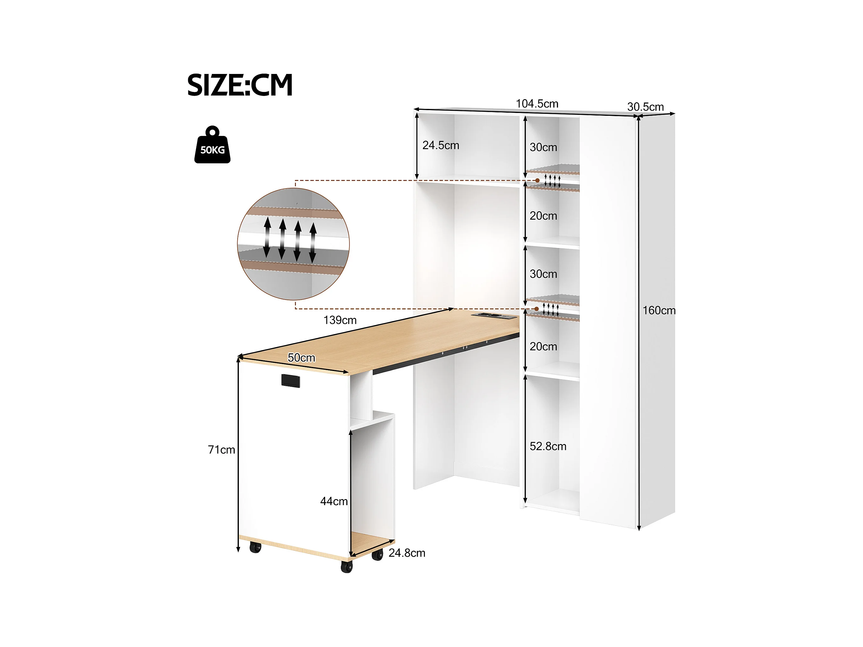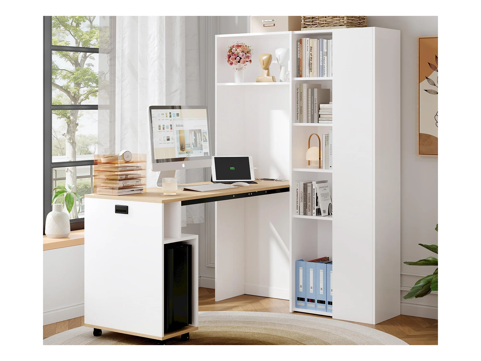 Bureau pliable 104.5x30.5x160 cm - avec bibliothèque - prises et ports USB - Étagères réglables - Avec roulettes - Blanc+naturel