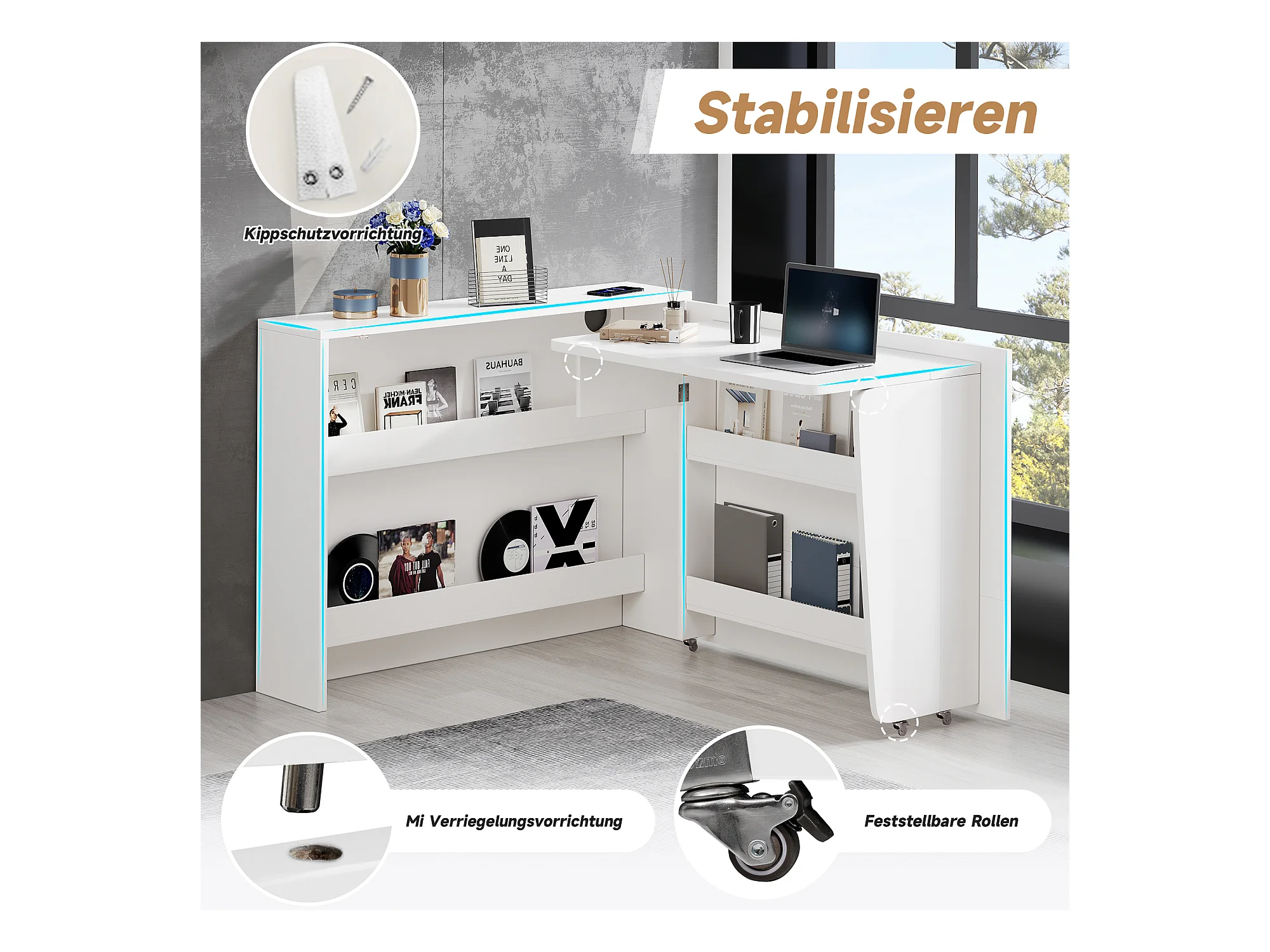 Bureau et buffet 2 en 1 avec Leds - 120 x 40 x 78 cm - rotatif à 360° - avec portes - aggloméré - blanc