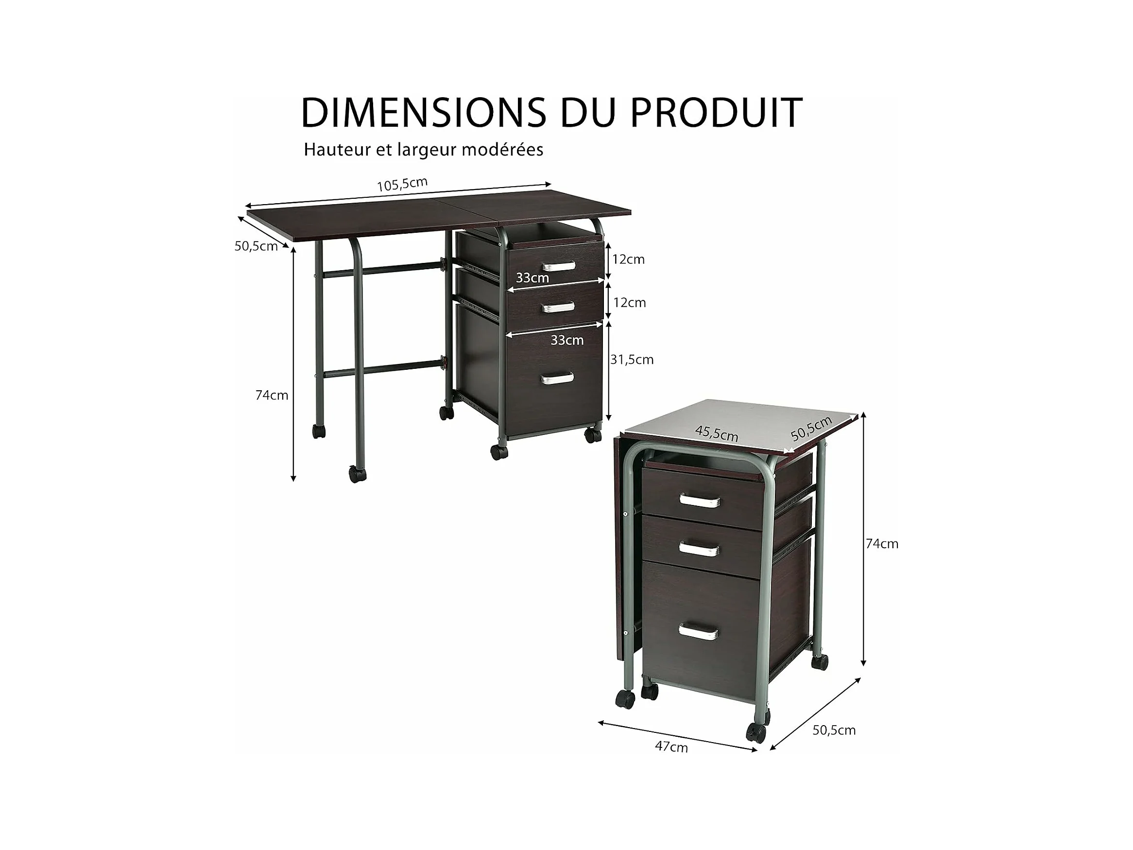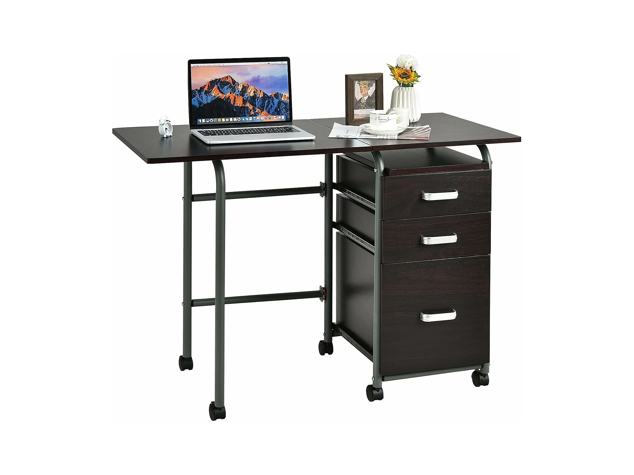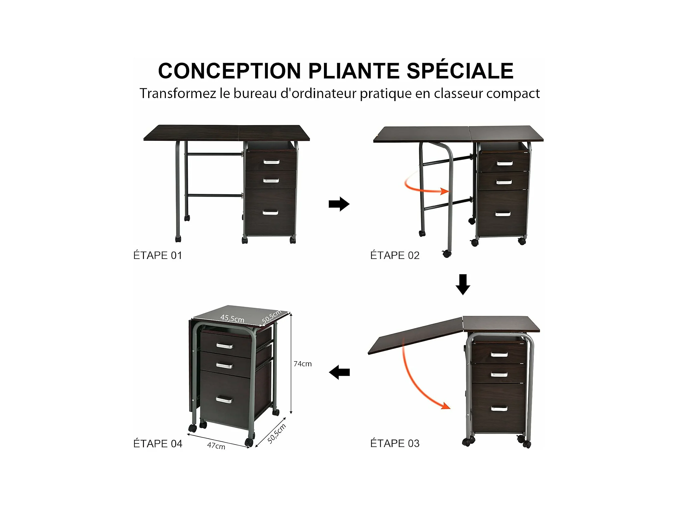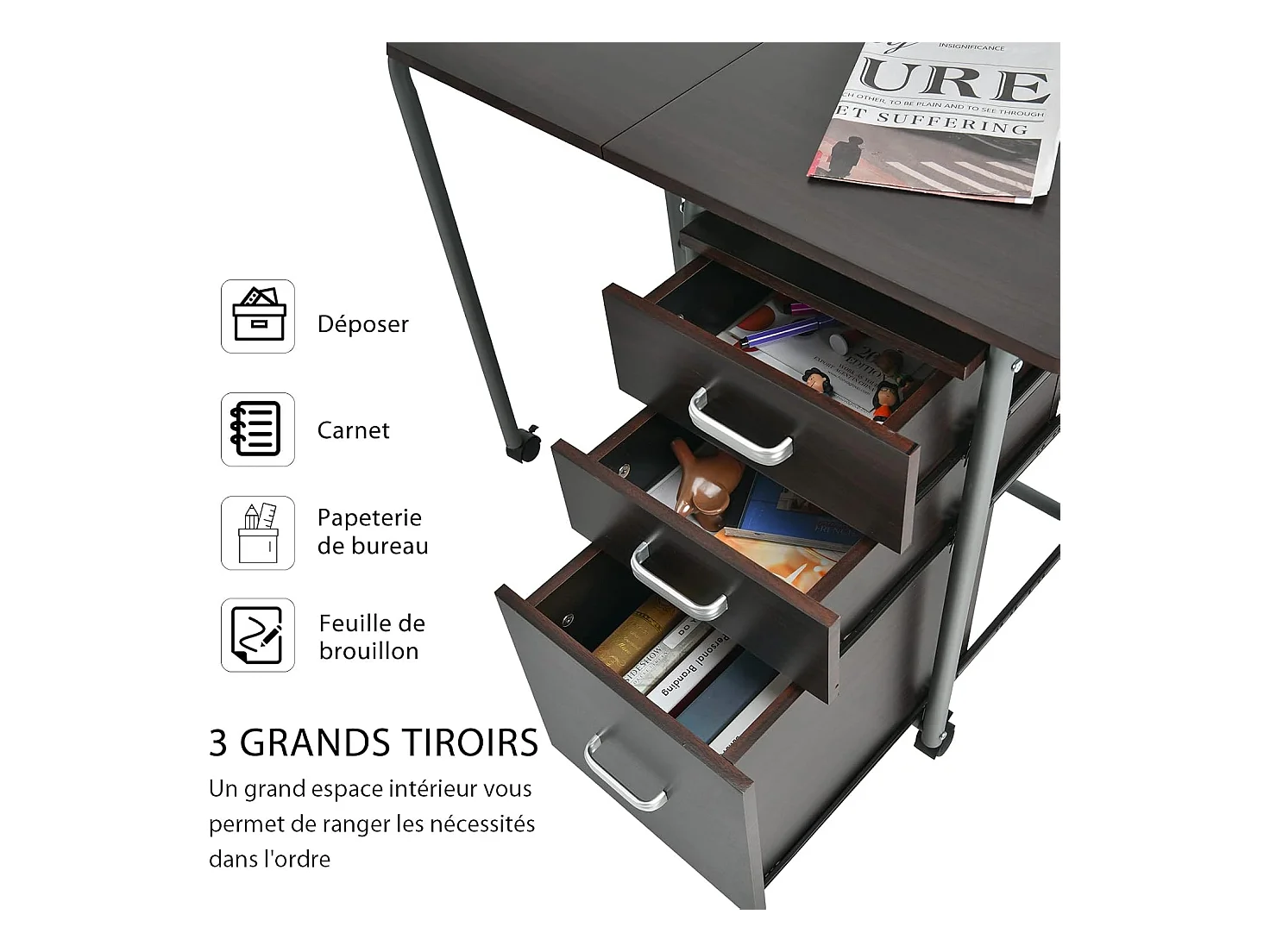 Bureau pour Ordinateur Rabattable avec 3 Tiroirs Coulissants et Roues Verrouillables en Bois Naturel pour Travail Bureau Marron