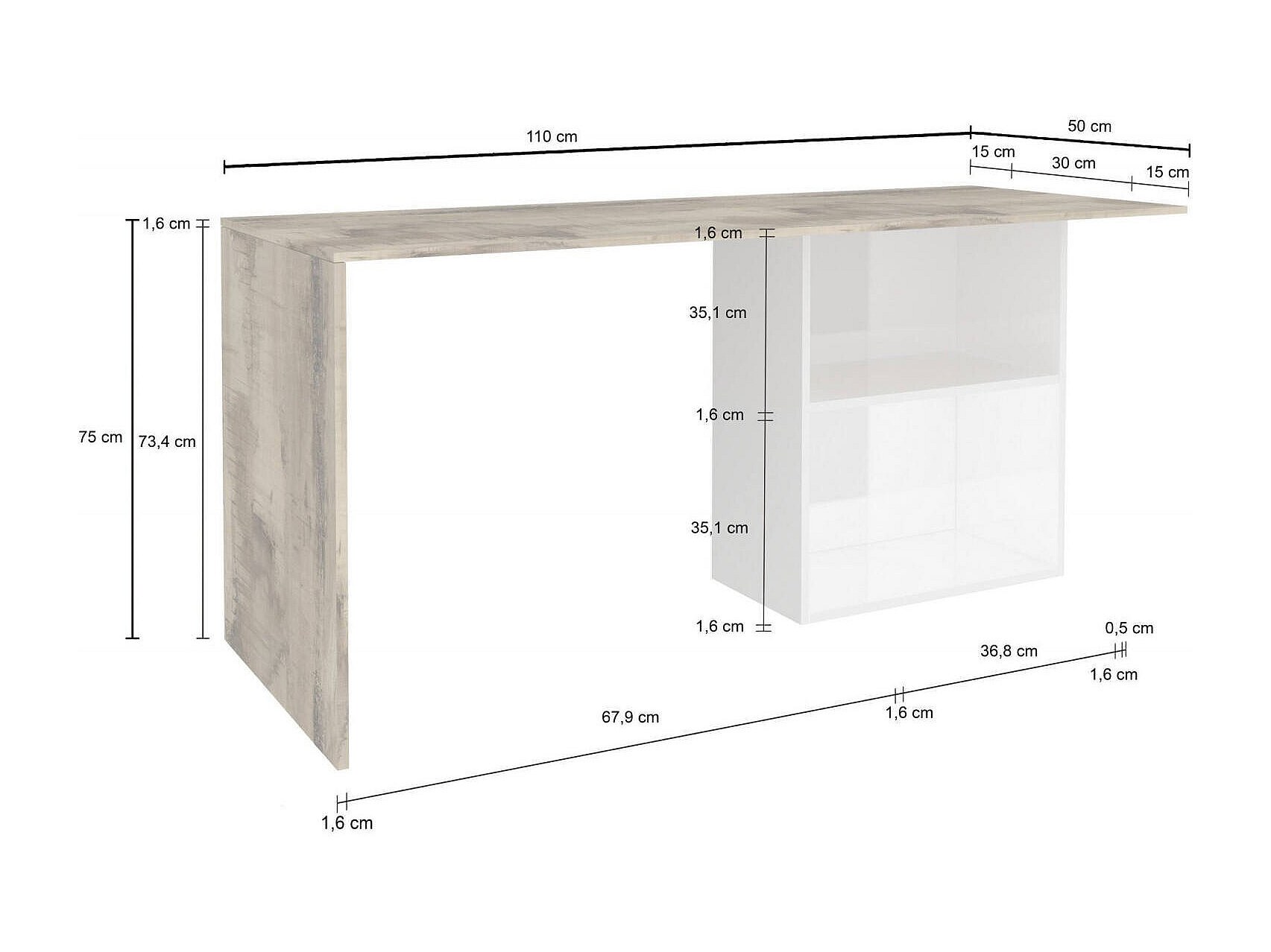 Napoli Bureau d'angle avec 2 tiroirs et 3 espaces de rangement ouverts, en blanc et imitation chêne.