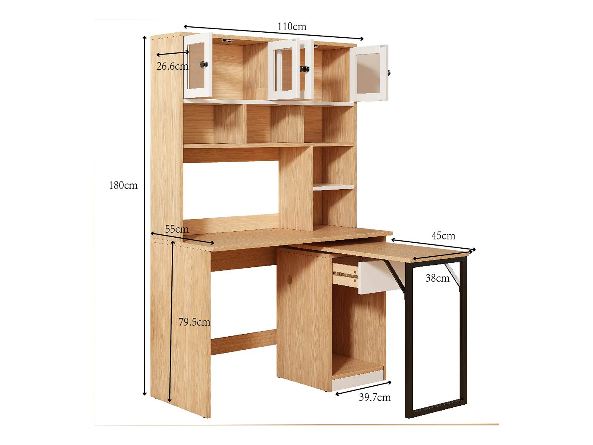 Bureau secrétaire avec rangement, plan de travail pivotant, MDF, blanc et bois naturel (110x55x180 cm)