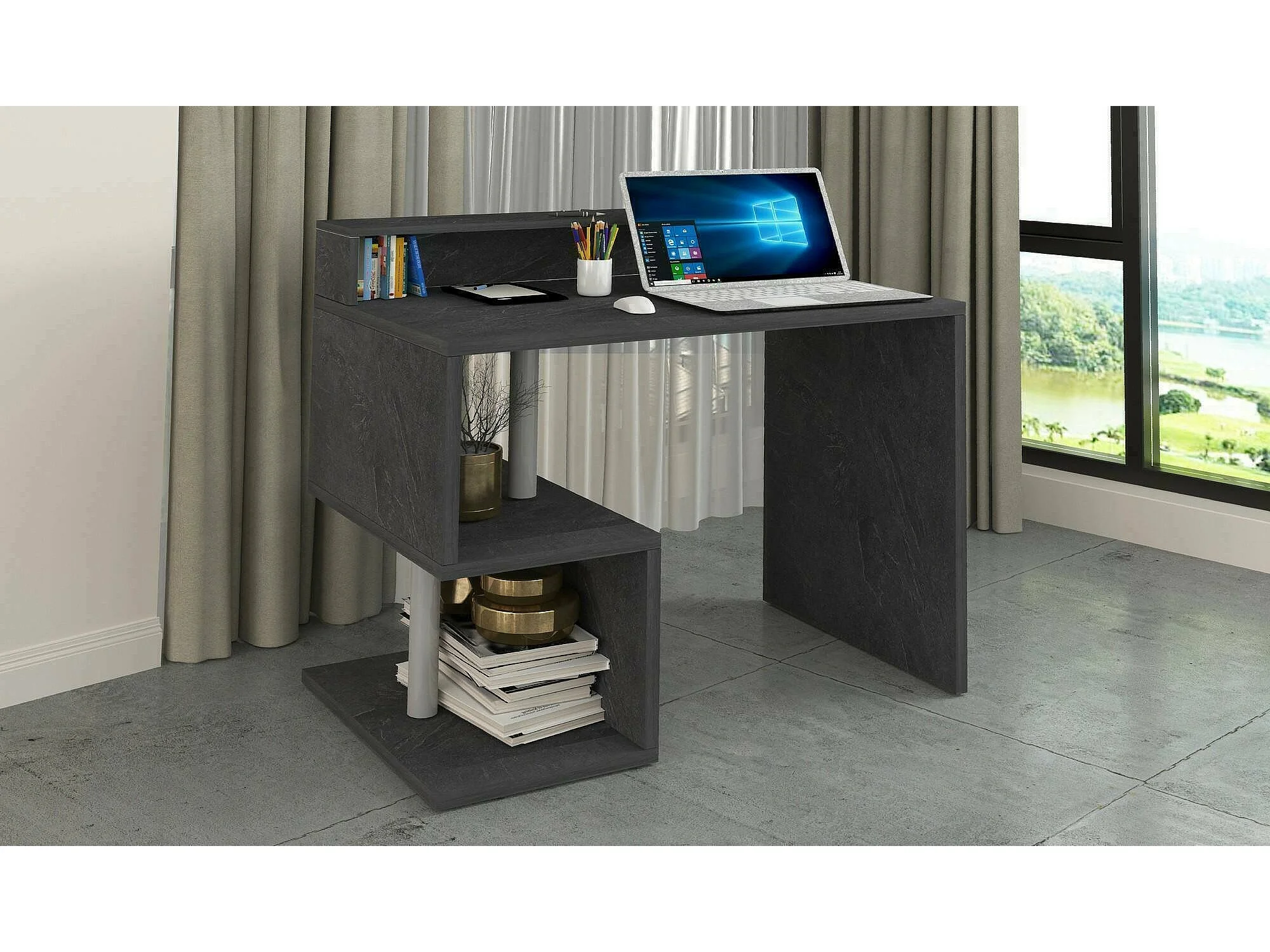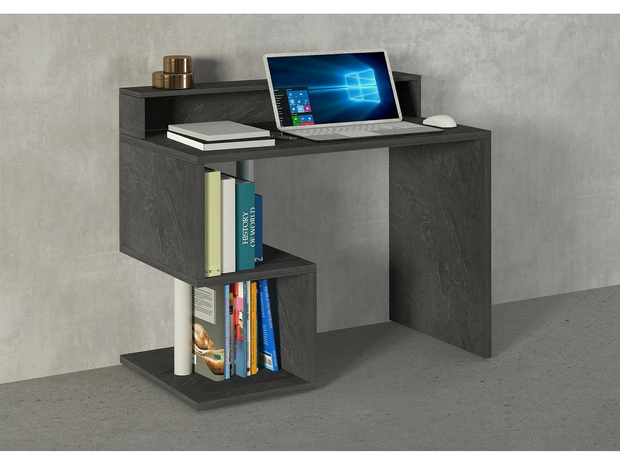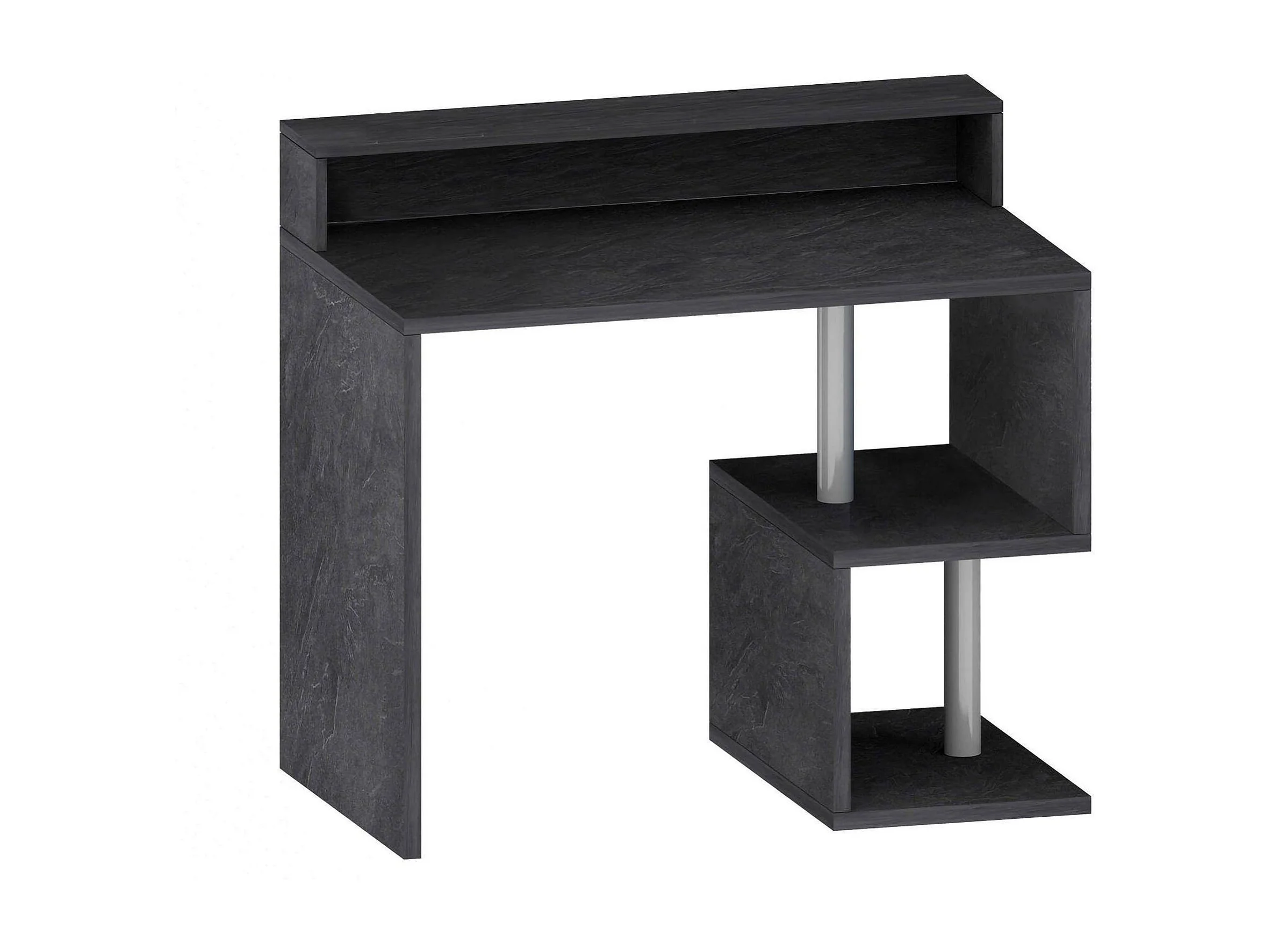 Bureau Silvio, Bureau linéaire avec étagères de rangement, Bureau polyvalent avec plateau, 100x50h93 cm, Ardoise