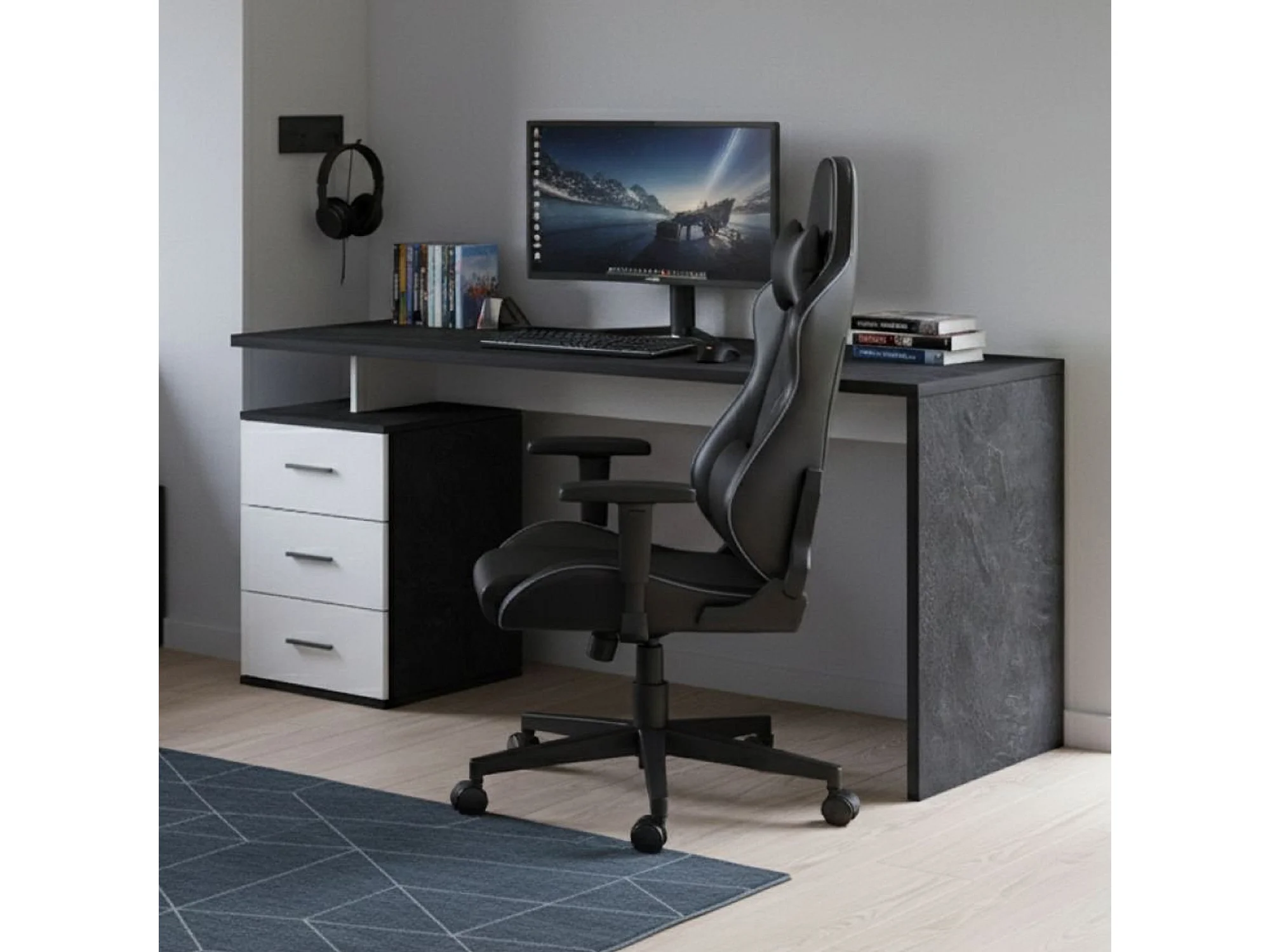 Bureau Siro, Bureau Linéaire, Bureau polyvalent, Bureau gain de place multi-positions, 160x60h75 cm, Blanc et Ardoise