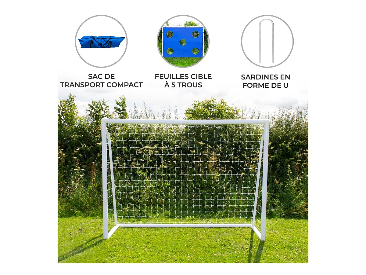 But de Football, Cage de Foot avec Filet Résistant aux Intempéries et Cadre UPVC Piquets de Sol et Cônes de Football (245 x 182 cm)